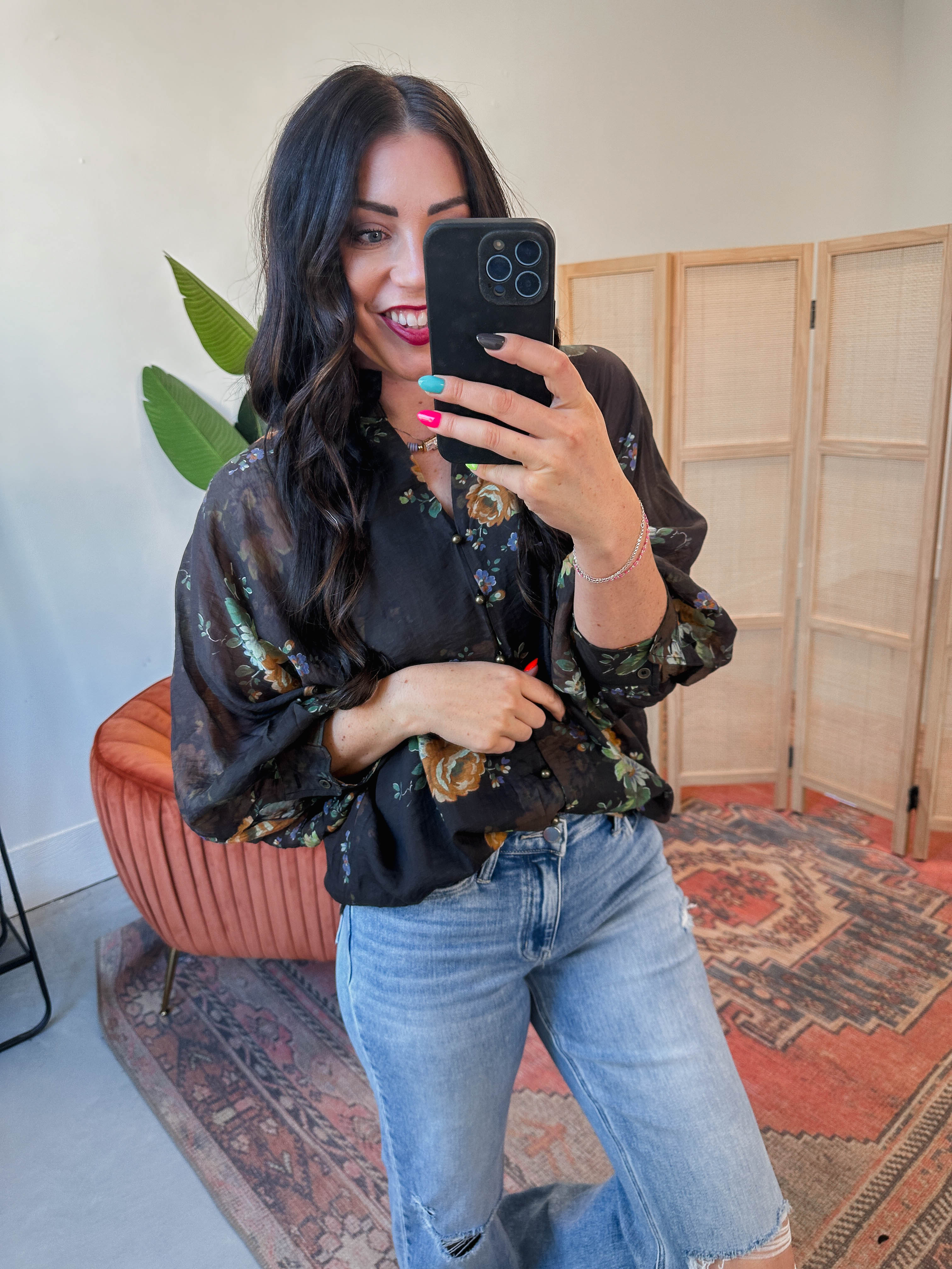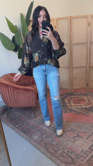 Effortlessly chic, the Lana Floral Top transitions from office meetings to weekend brunches. This versatile blouse features a flattering V-neckline, dramatic long puff sleeves, and a charming ruffled band collar that adds personality. The vibrant floral print brings life to any outfit, while the button-front closure keeps things polished and put-together.