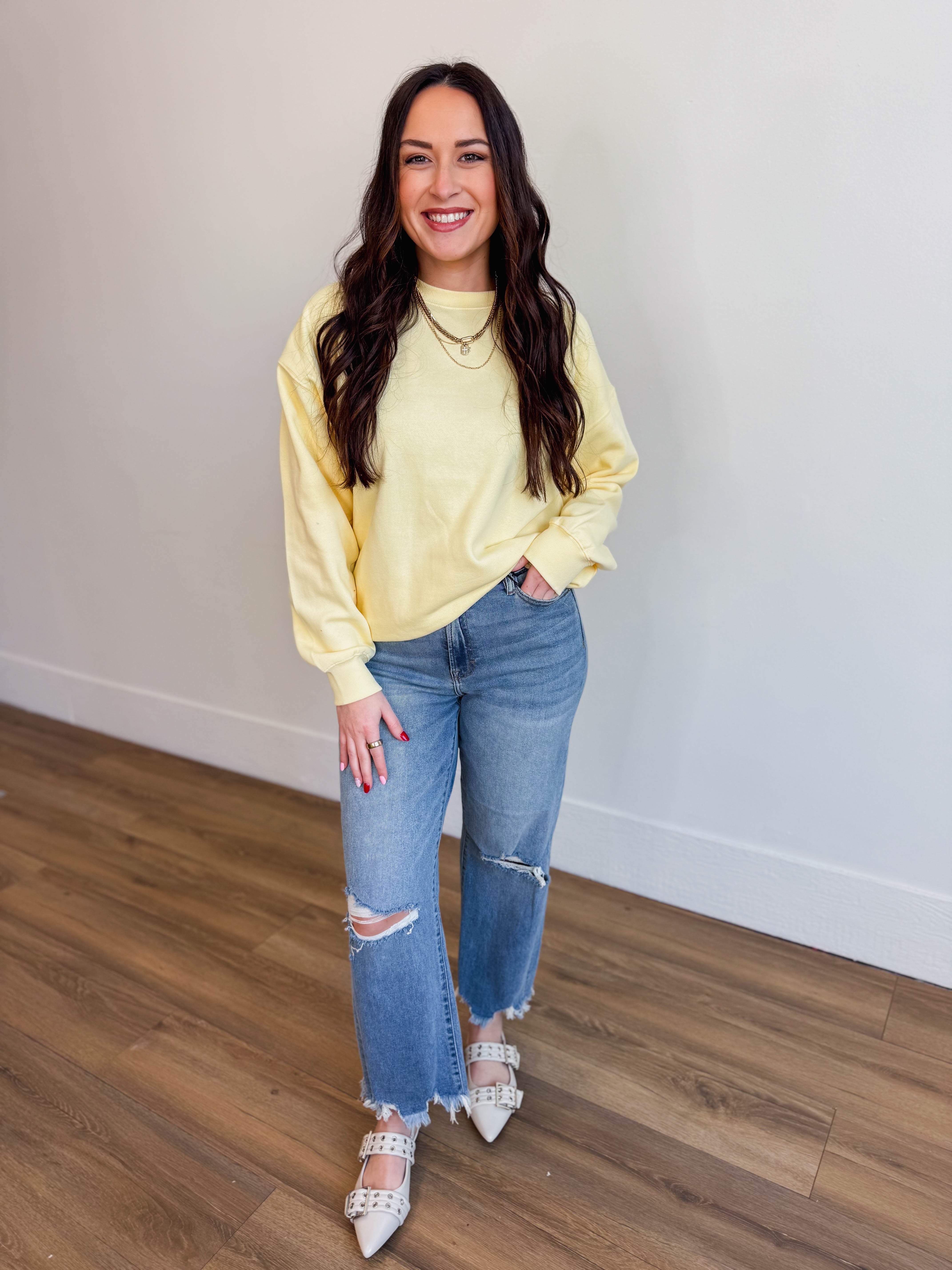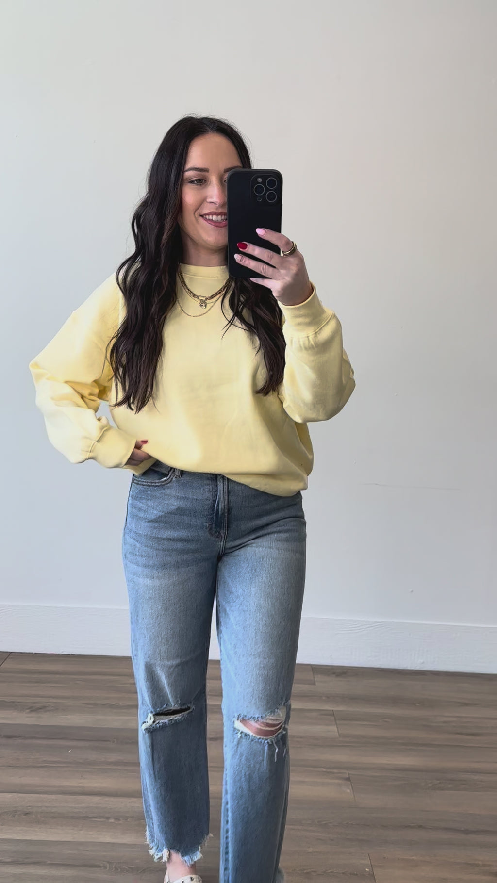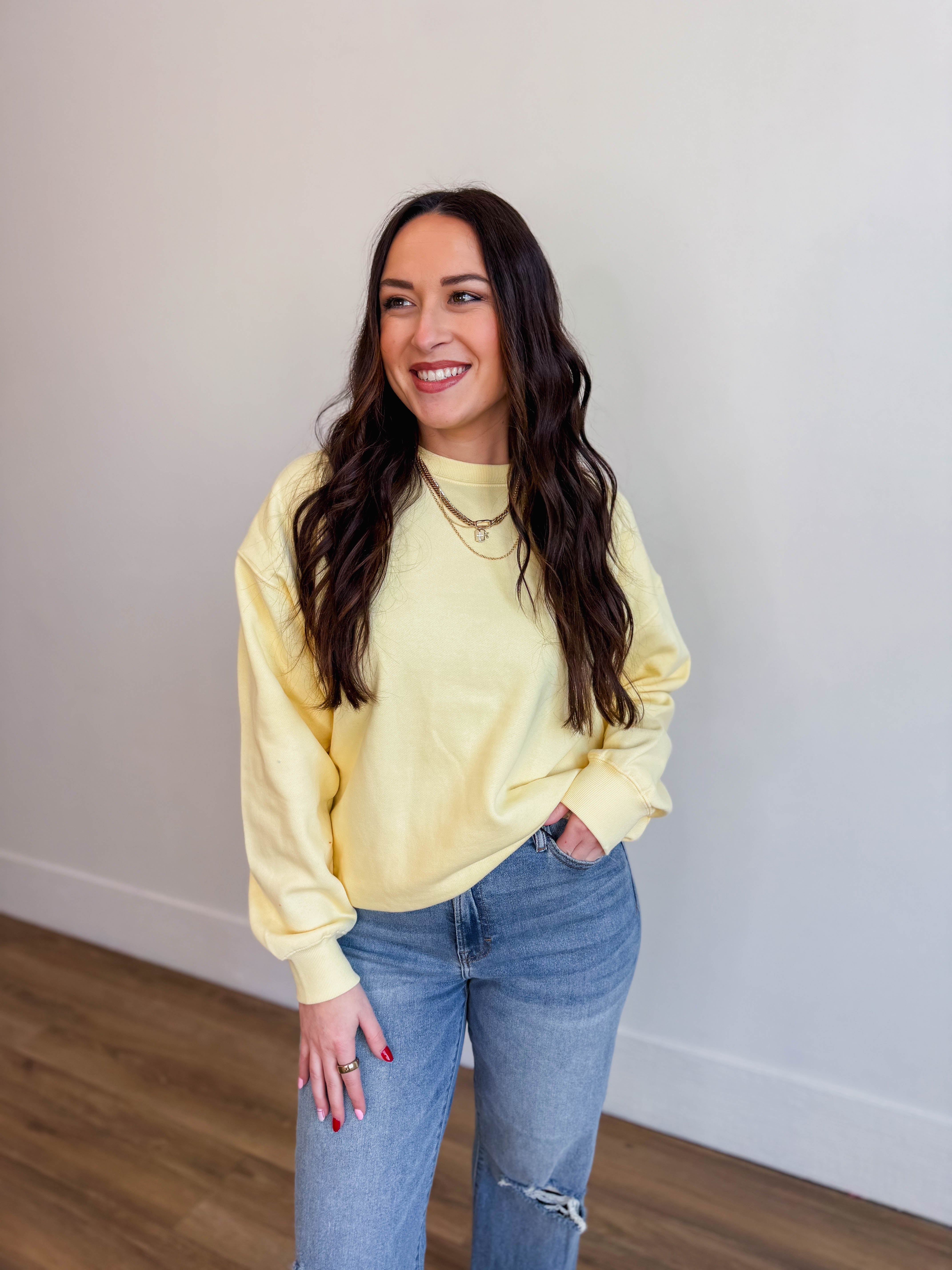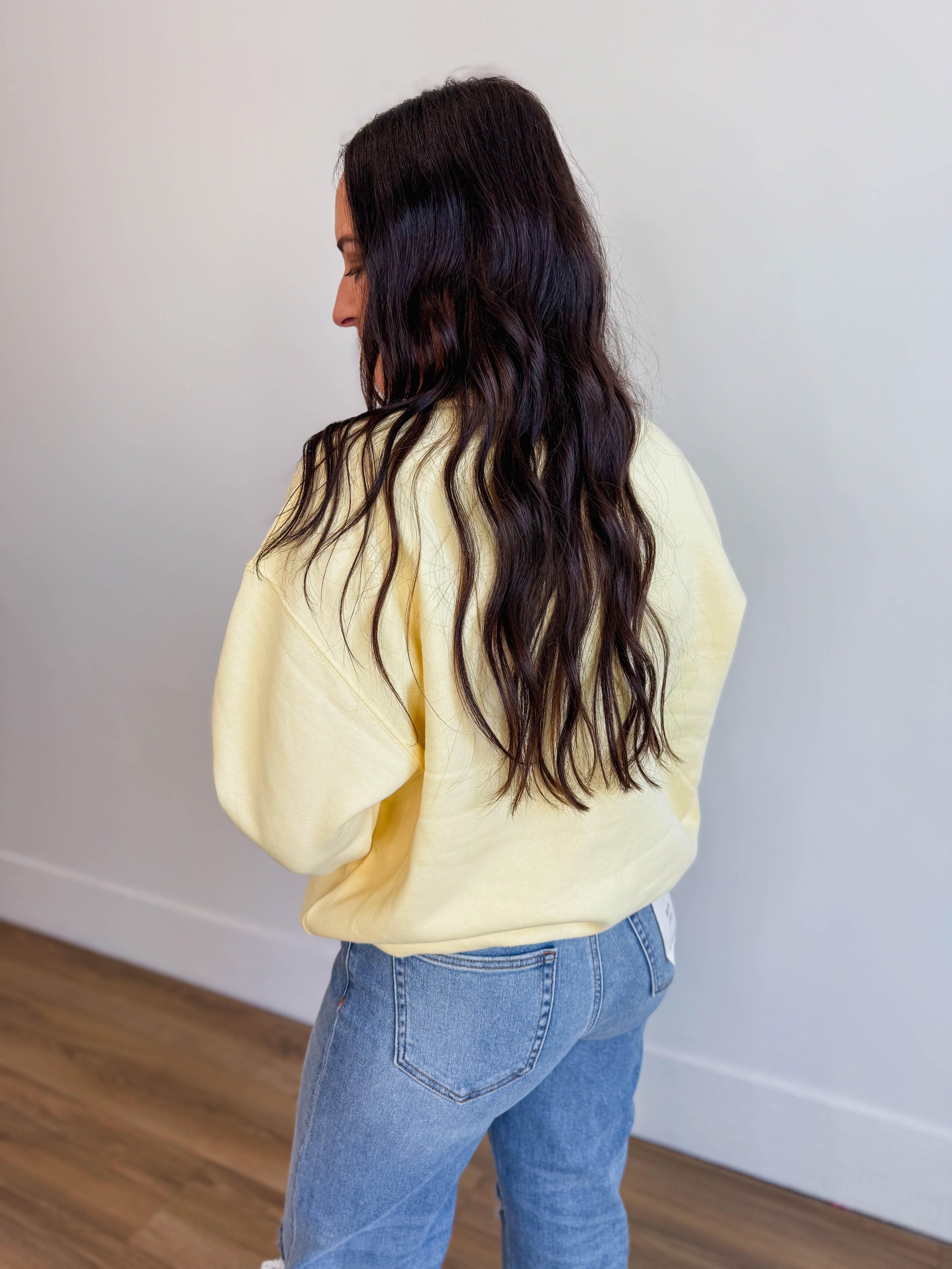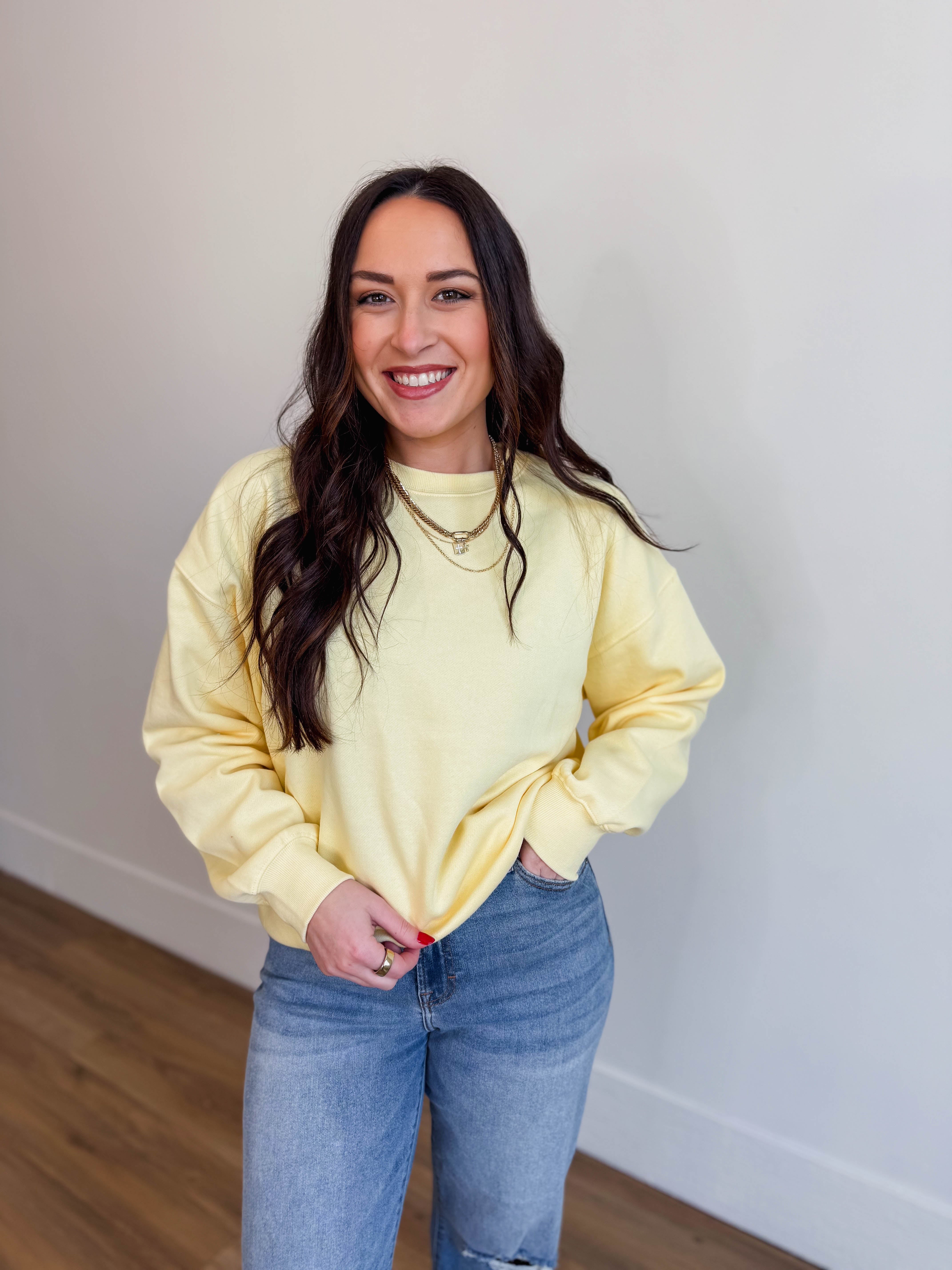 Wrap yourself in cozy vibes with this cheerful yellow crewneck sweatshirt. Featuring a soft fleece lining, relaxed fit, and banded hems for that perfect laid-back look, it's your new go-to for effortless style. Whether you're lounging at home or running errands, this versatile piece keeps you comfy and cute all day long.