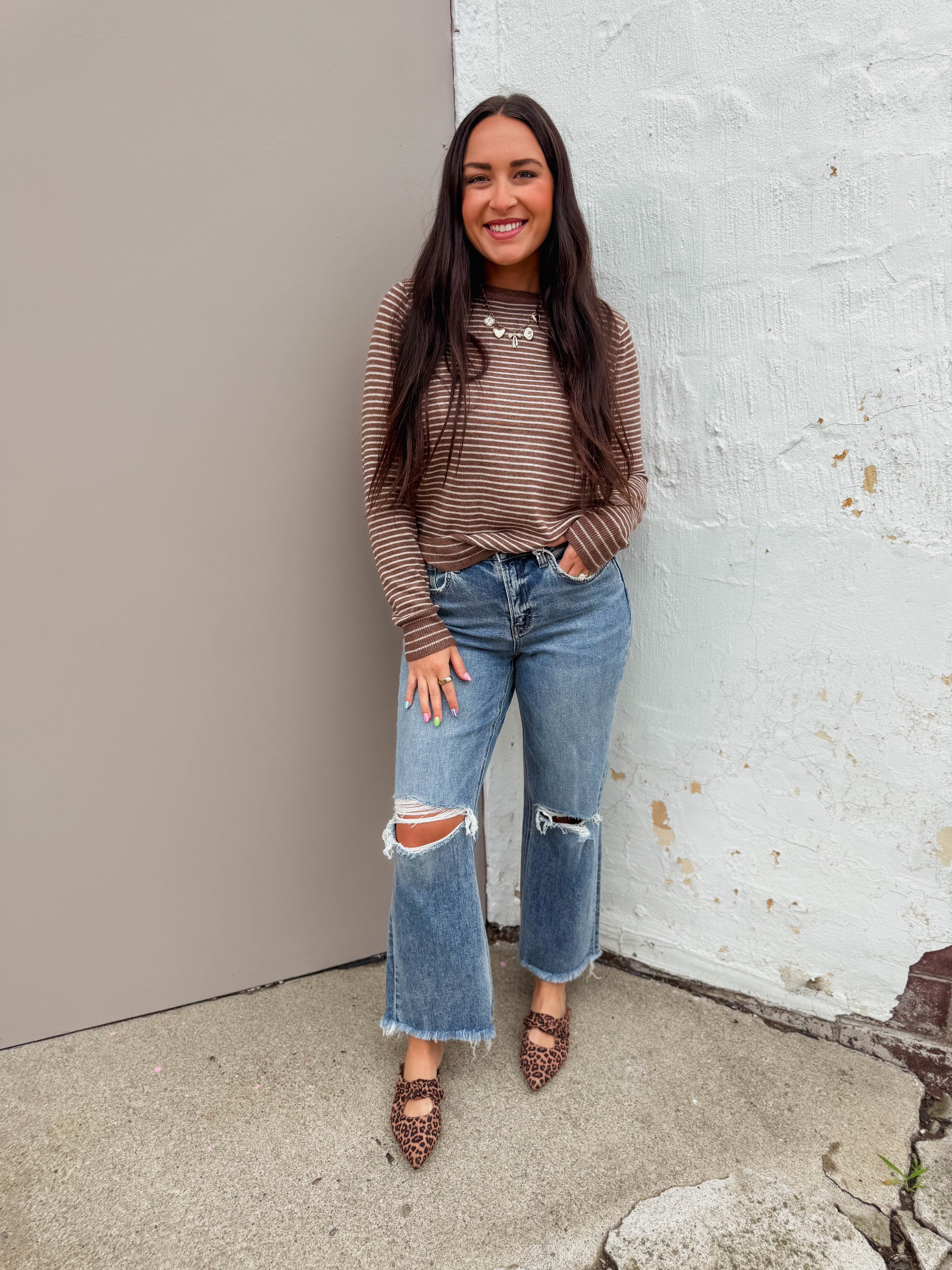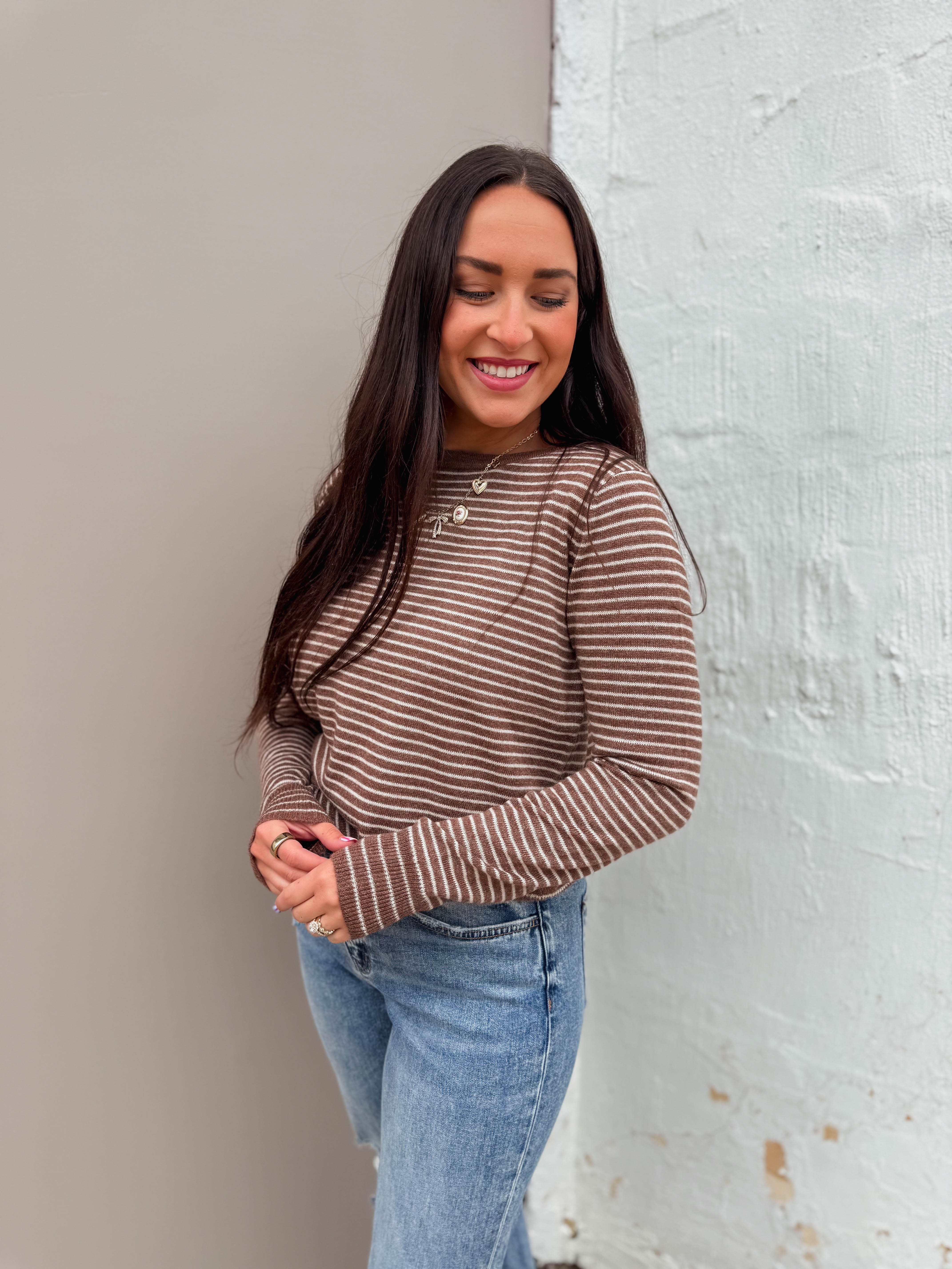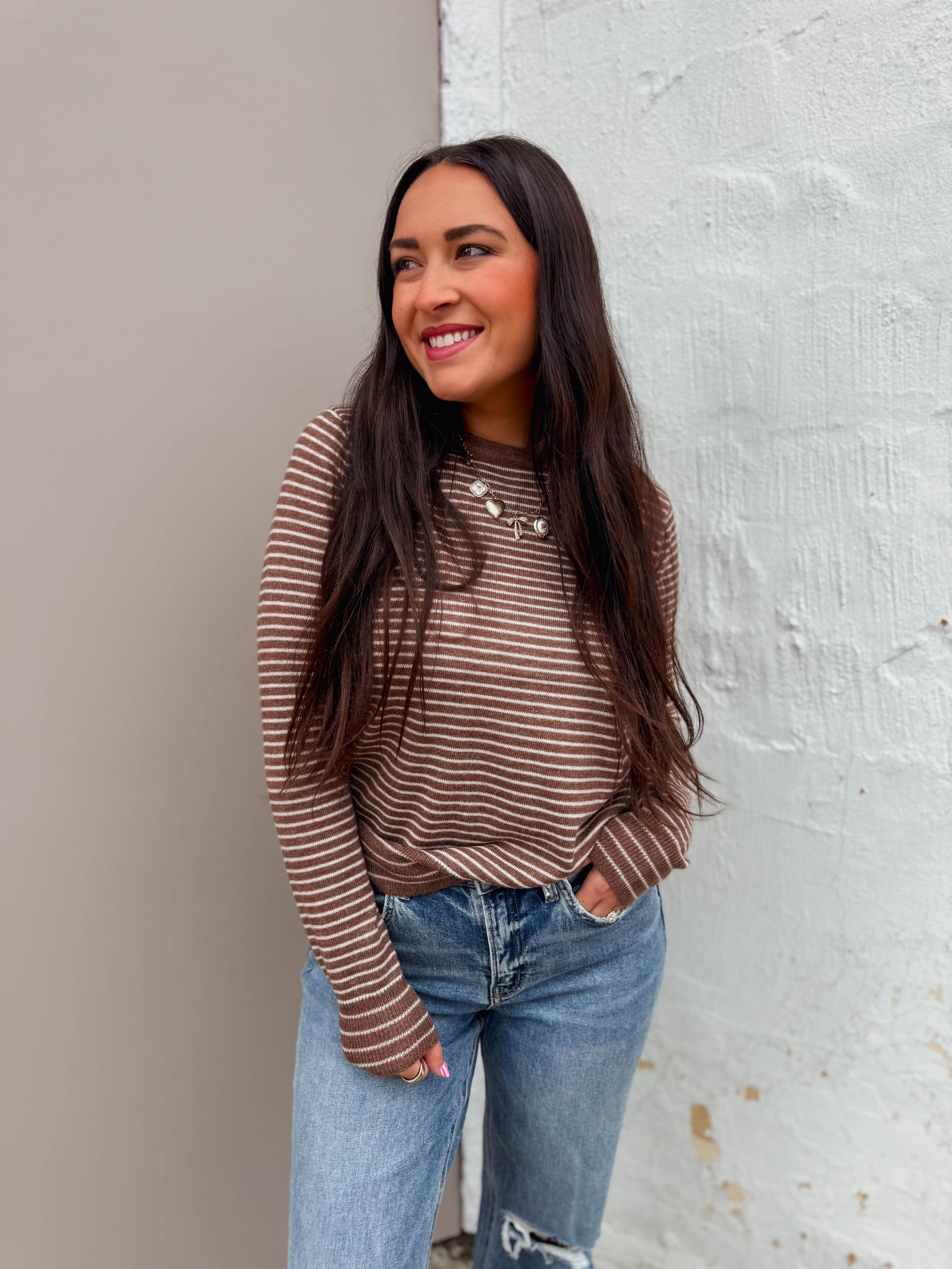 The Mandy Striped Sweater in Caramel features a cozy crew neckline and long sleeves, perfect for all-day comfort. With playful contrast trim and classic pinstripes, it effortlessly transitions from work to weekend. Your new go-to for everyday style!