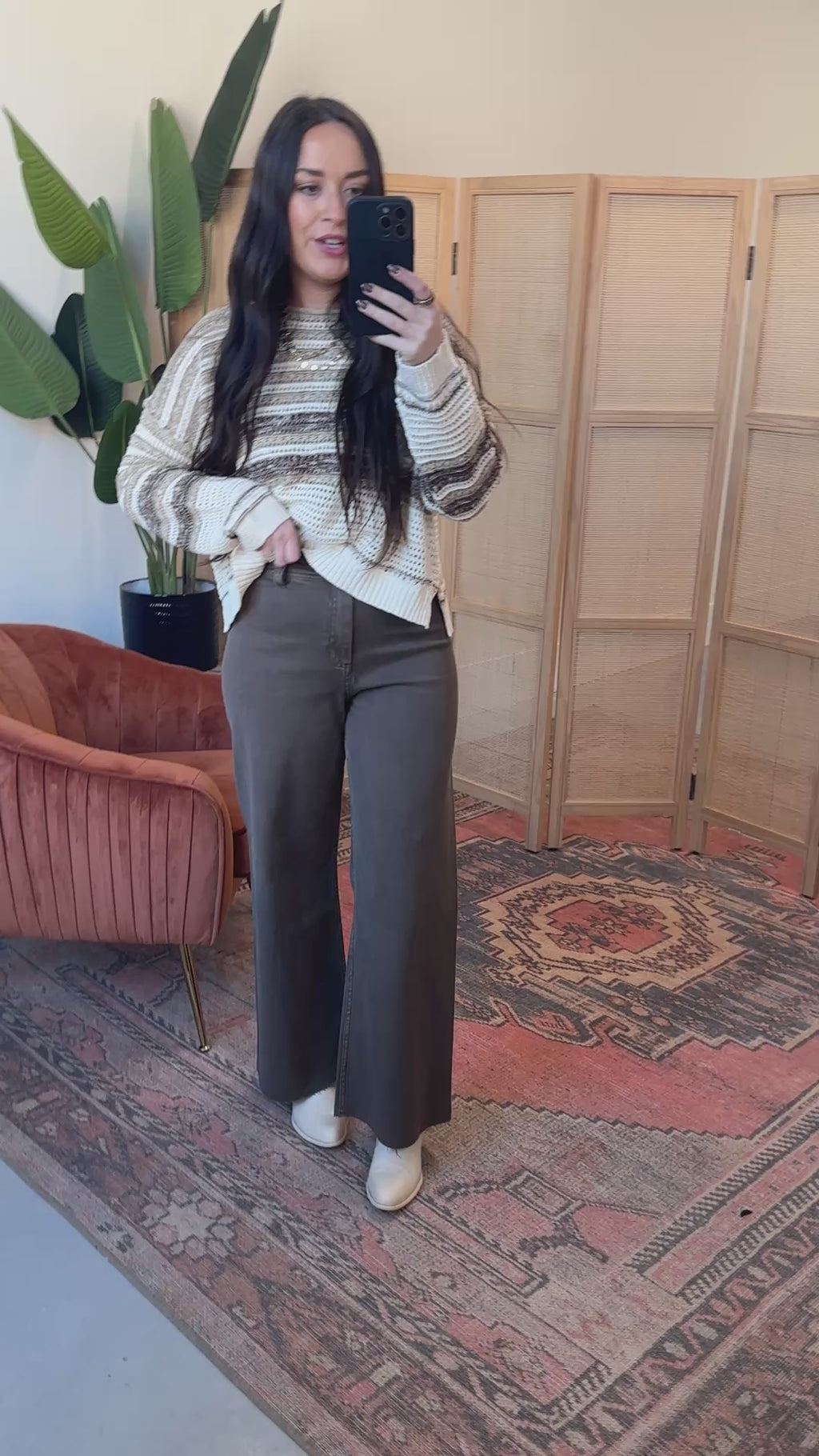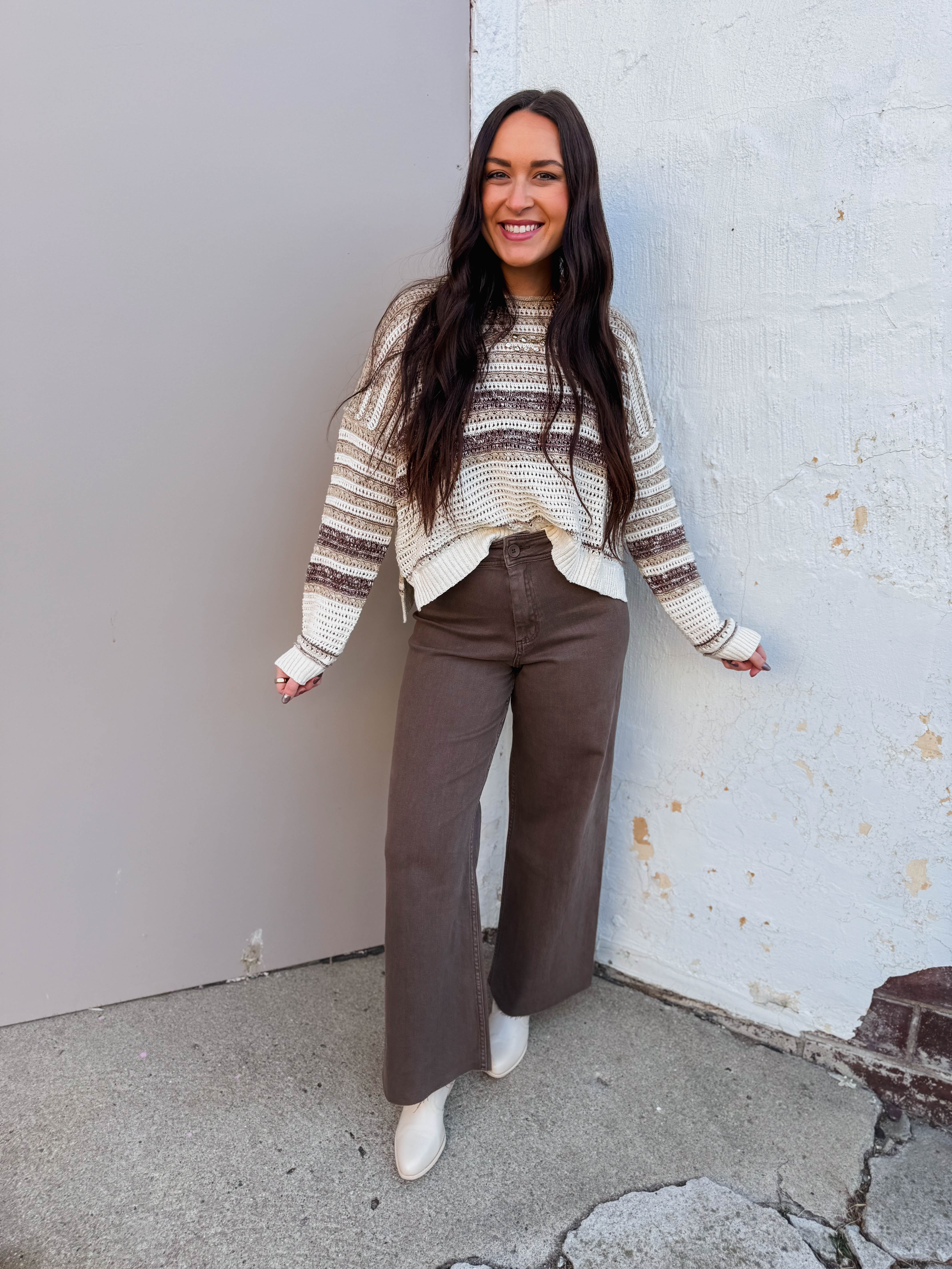 These Rylin Wide Leg Pants in Brown bring a cool, washed denim vibe with a high waist and straight wide leg cut. Featuring belt loops, zip fly, button closure, and handy back pockets, they’re perfect for work or weekend fun. Dress them up or down with ease!