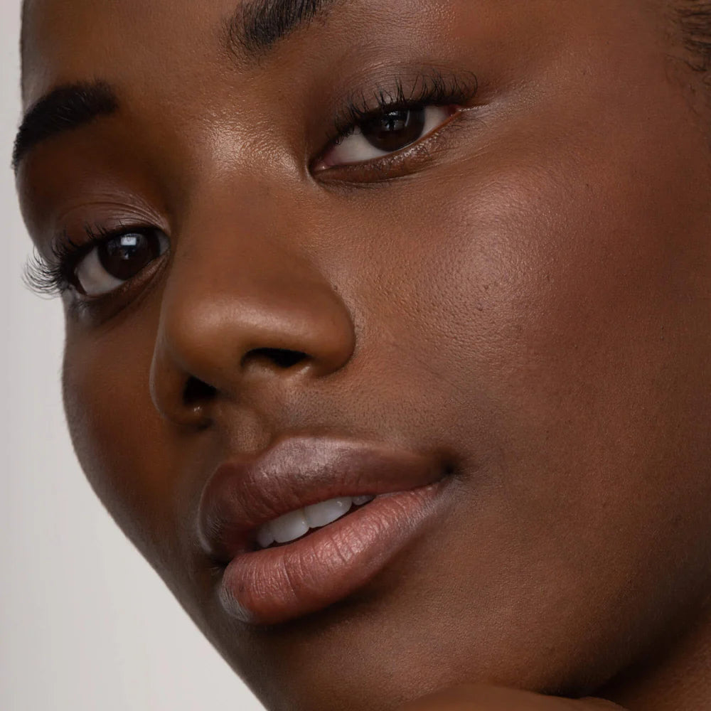 A dark peach colored lip tint. These sheer lip tints feature buildable color, so you can be as bold or as subtle as you wish.