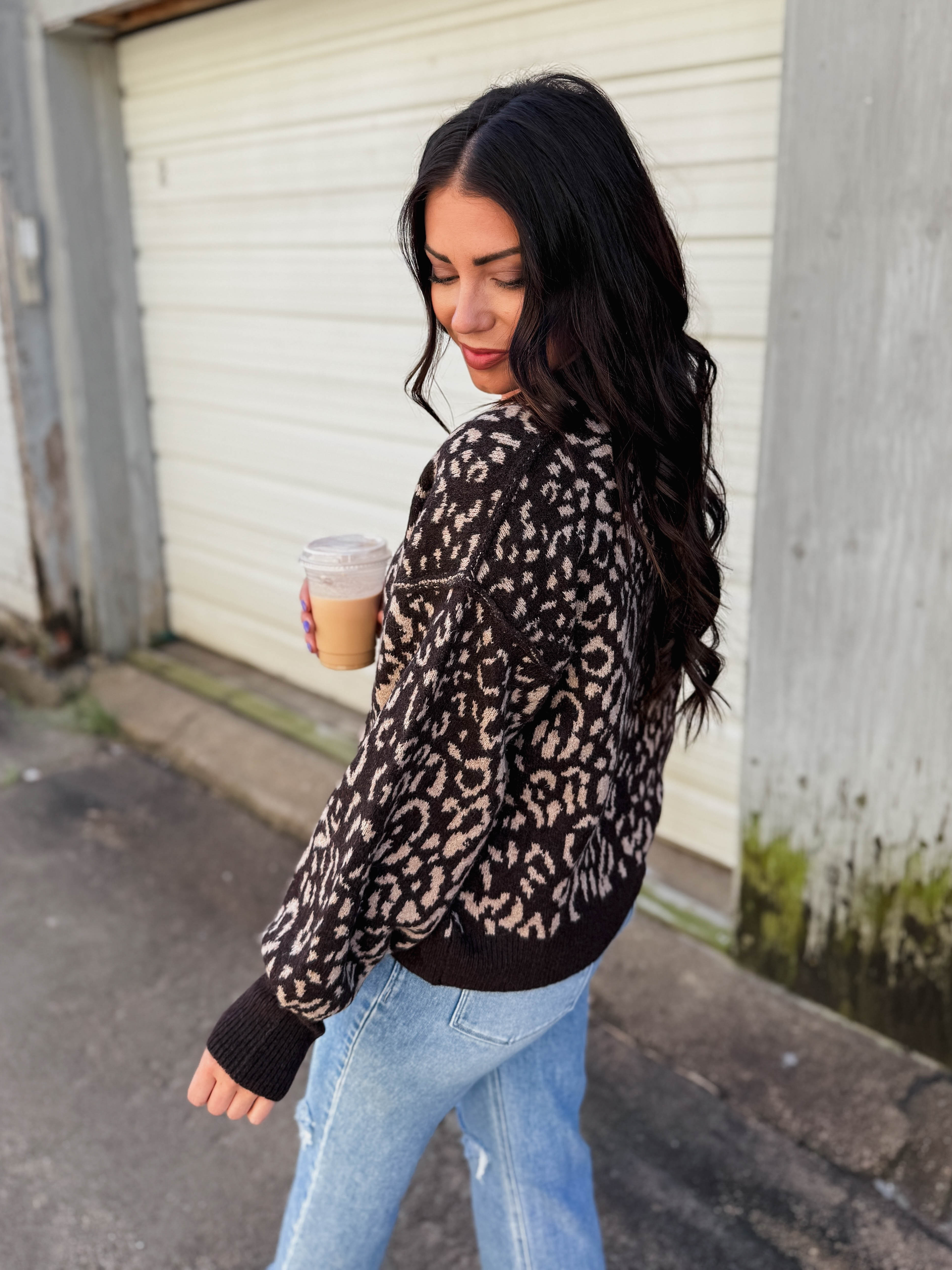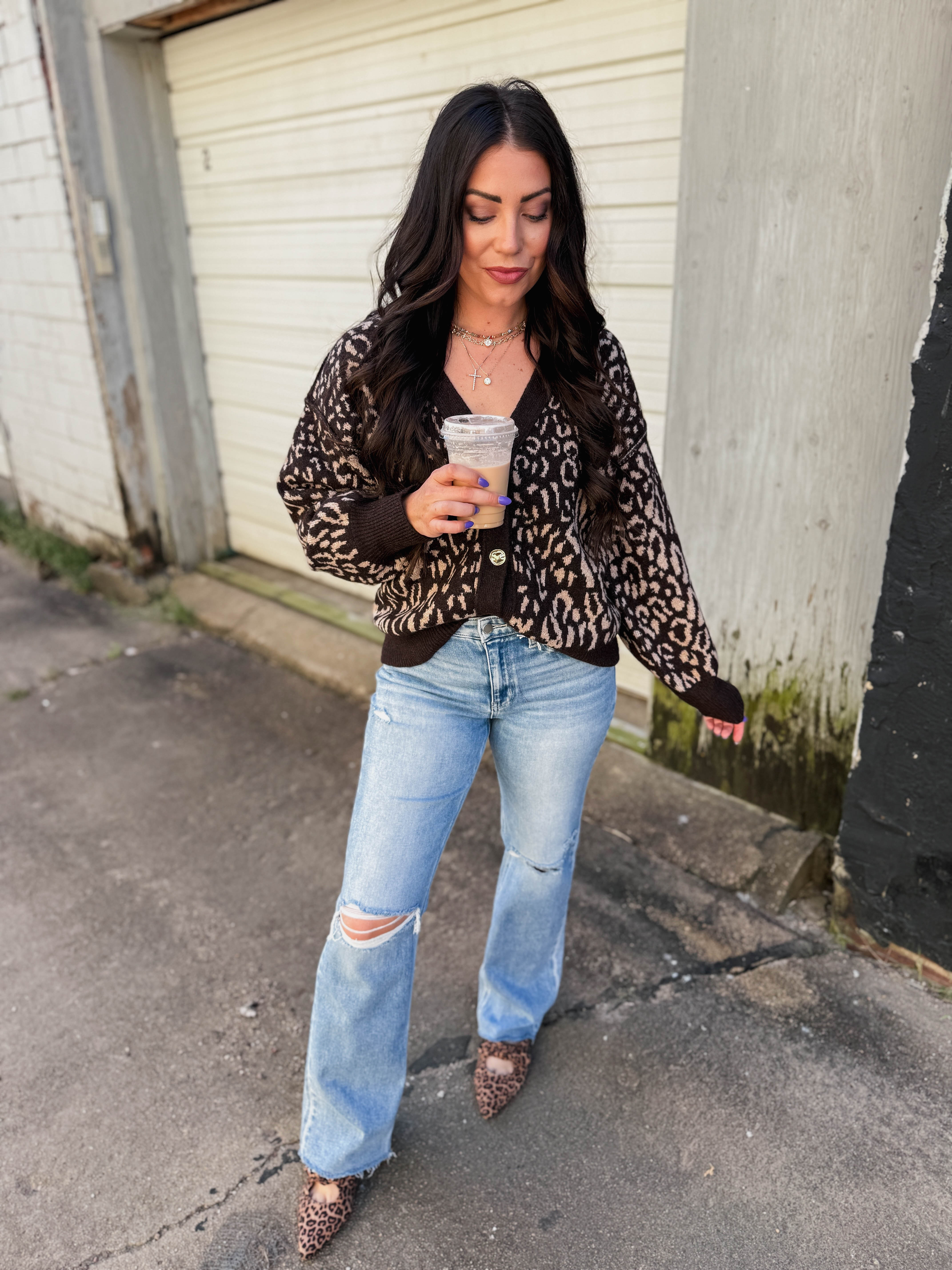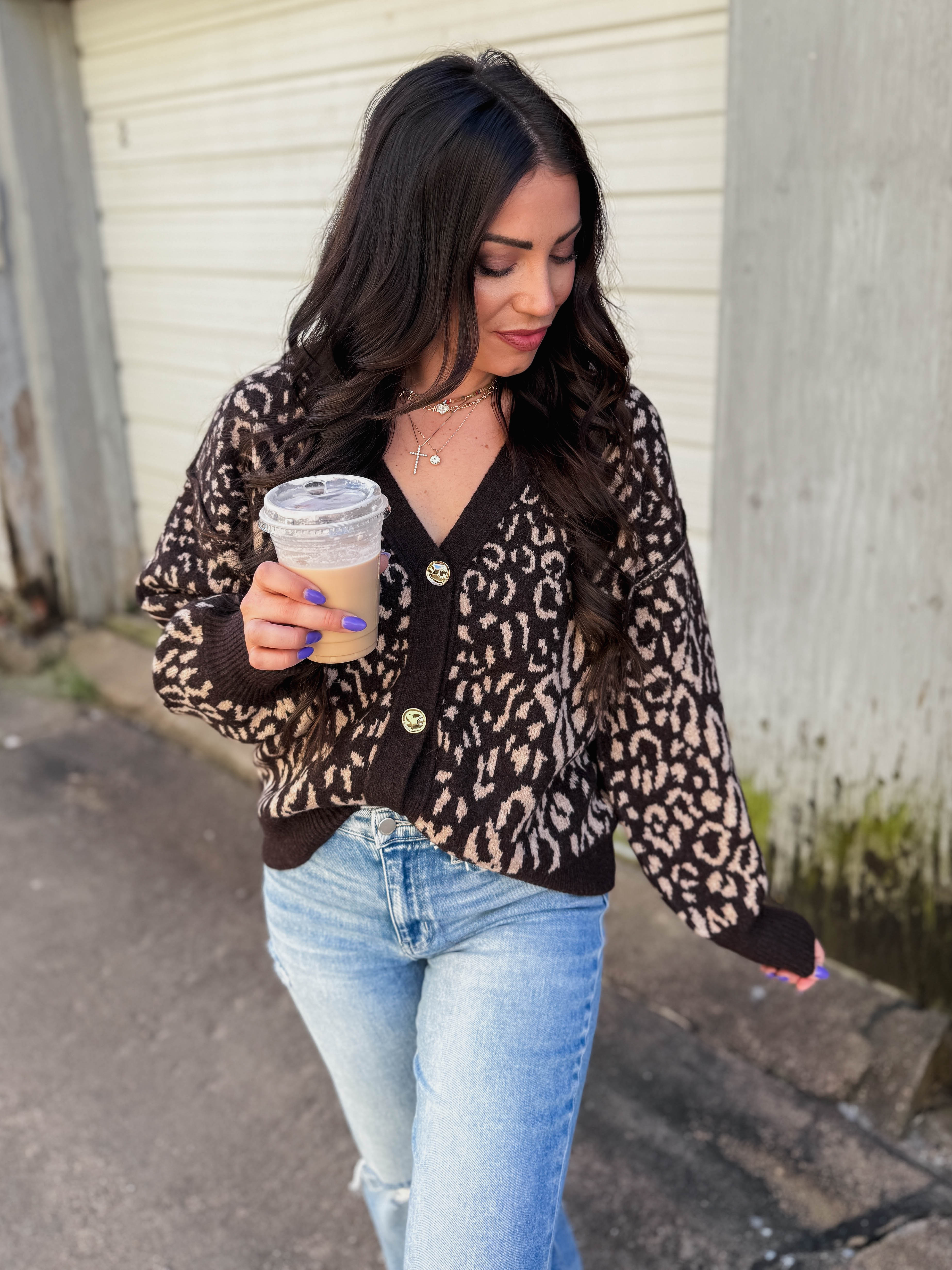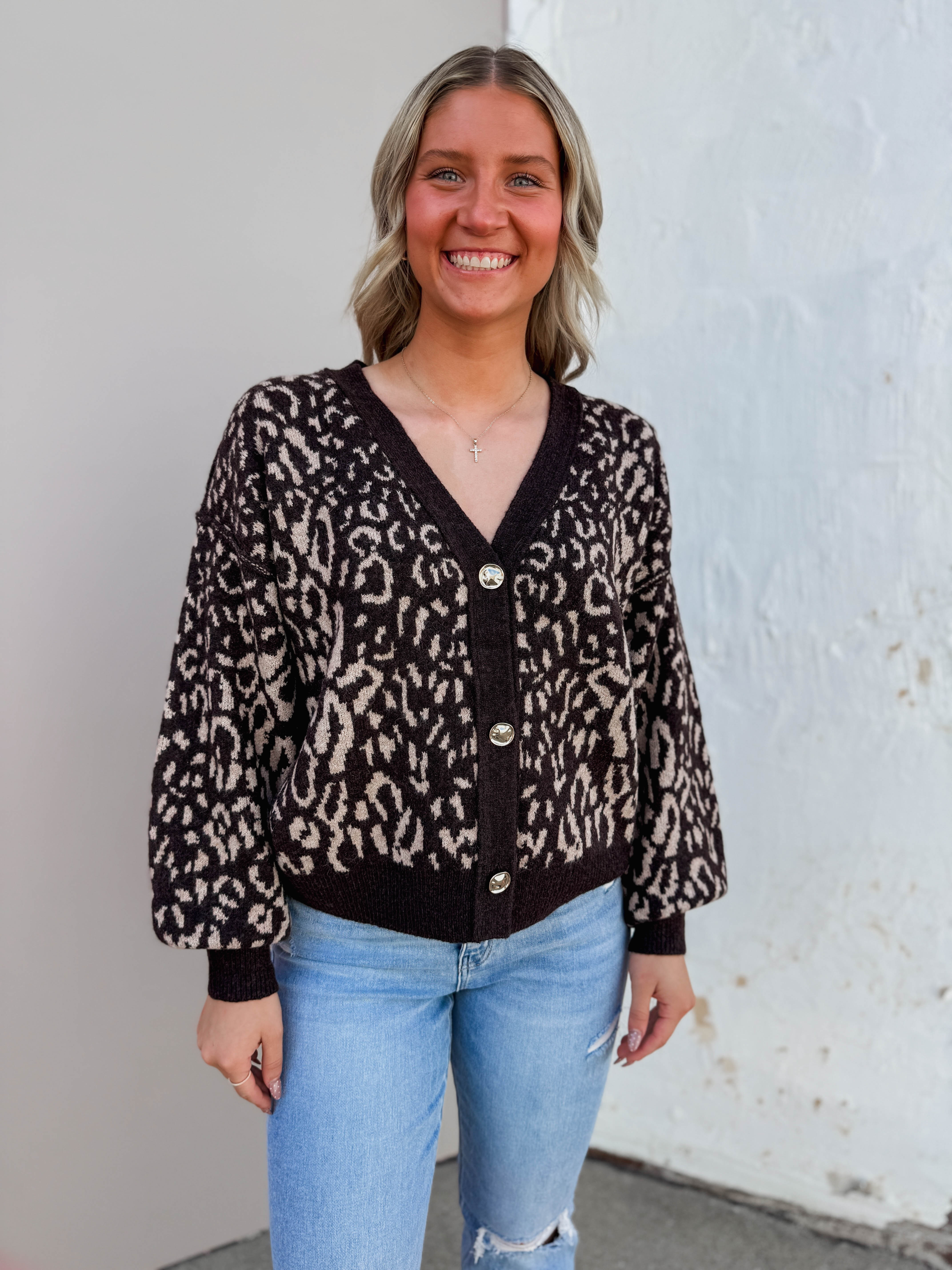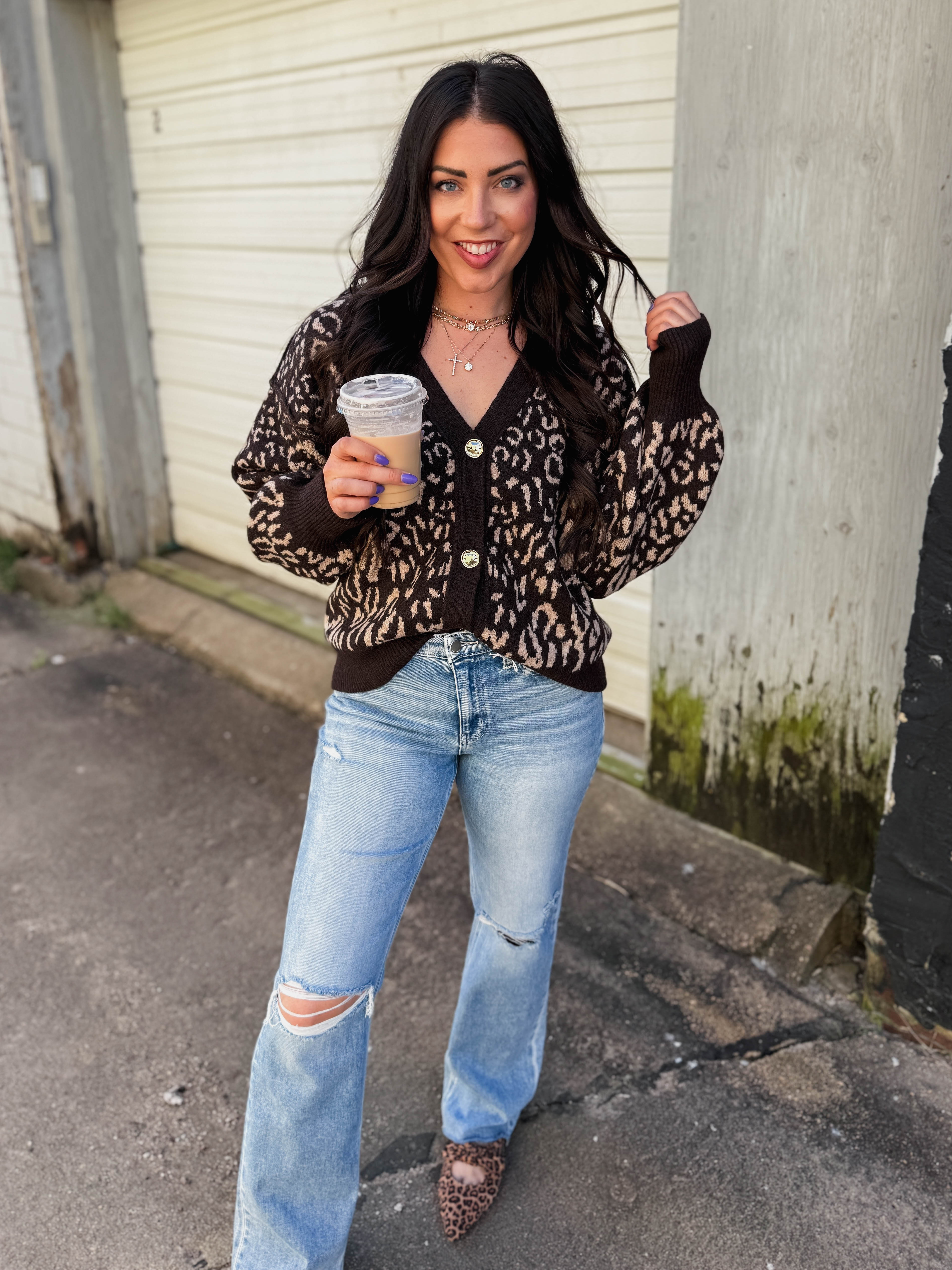 This Paige Leopard Cardigan in Brown adds a wild touch to your wardrobe. Featuring a cozy V-neck, button front, and ribbed hem and cuffs, it's perfect for effortlessly transitioning from work to weekend style. Long sleeves keep you comfy while turning heads.