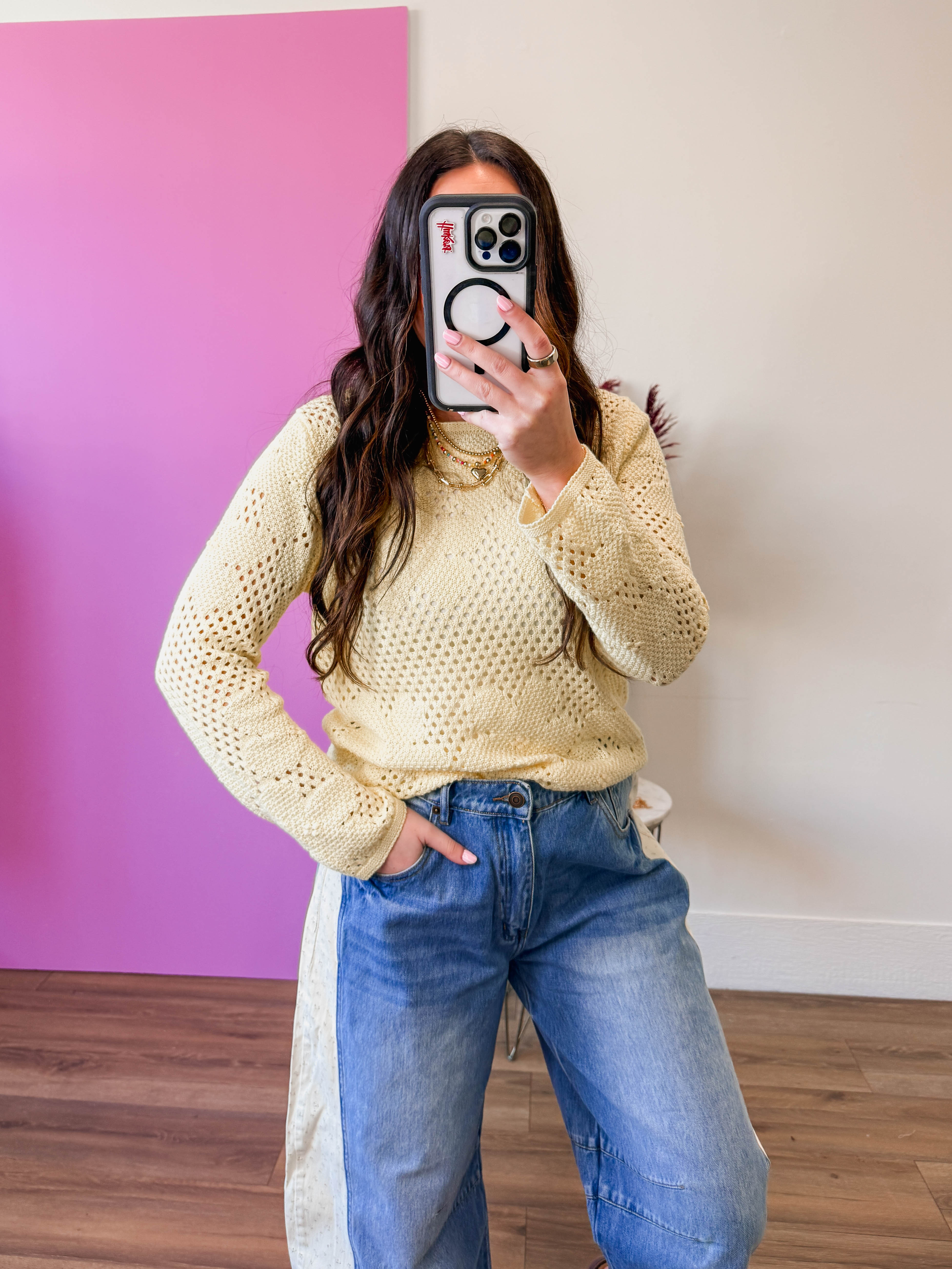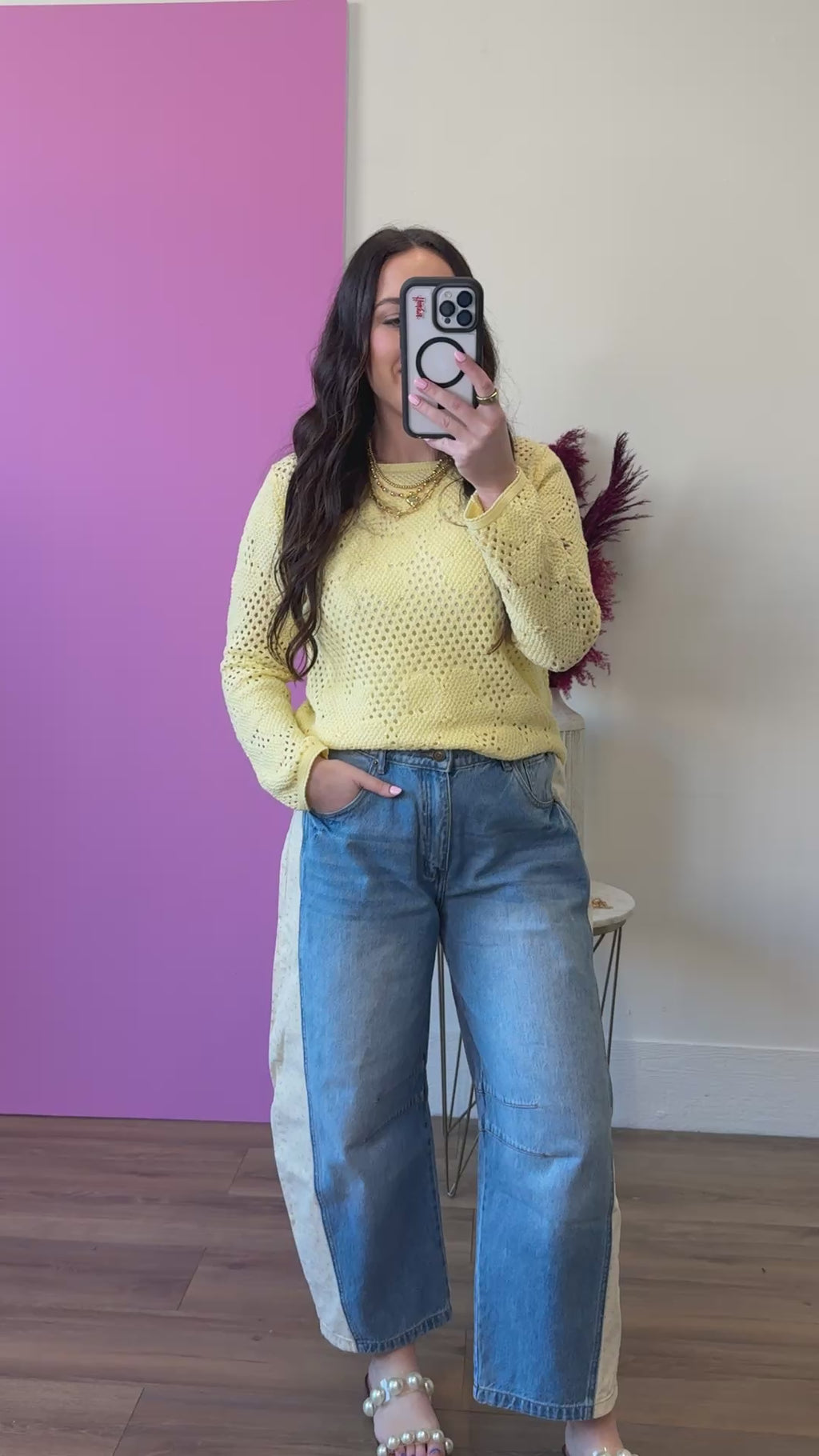 The Daphne Sweater brings effortless charm to your warm-weather wardrobe. This lightweight crochet pullover features a cheerful floral design in a sunny lemon hue that instantly brightens any outfit. Perfect for layering or wearing solo, its breezy construction keeps you comfortable through spring and summer. A cute pop of color that feels both playful and polished.