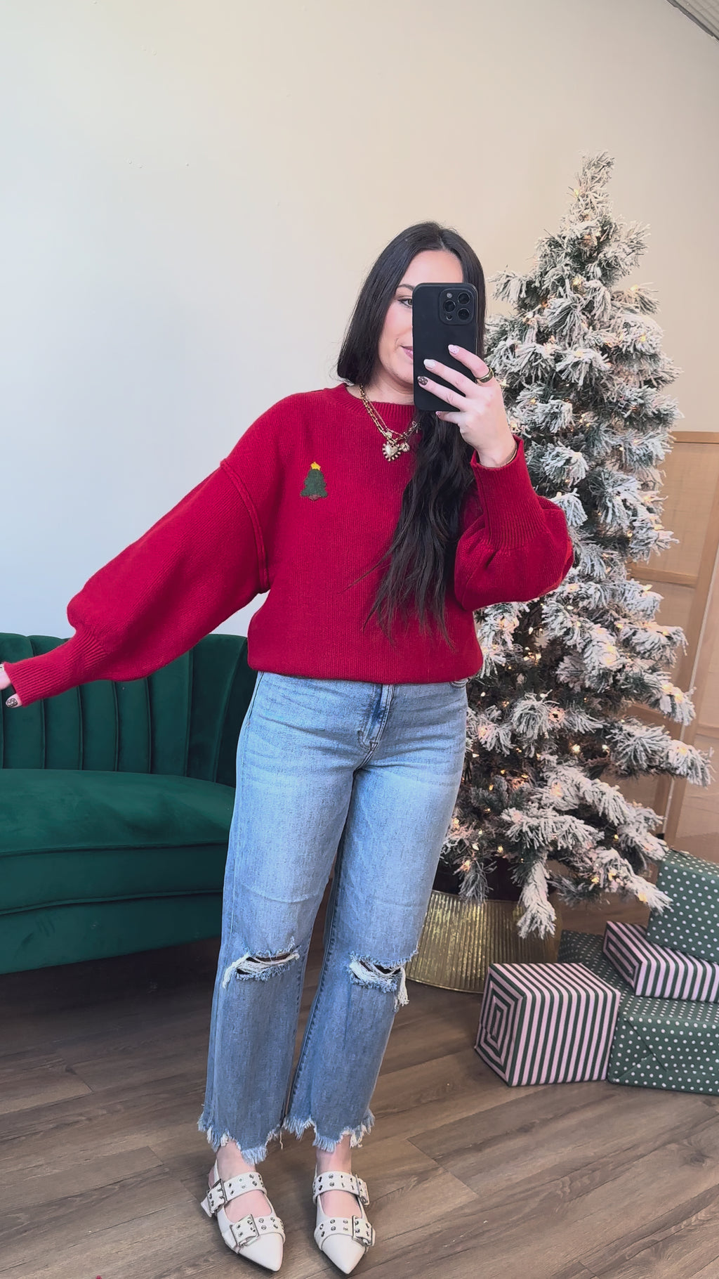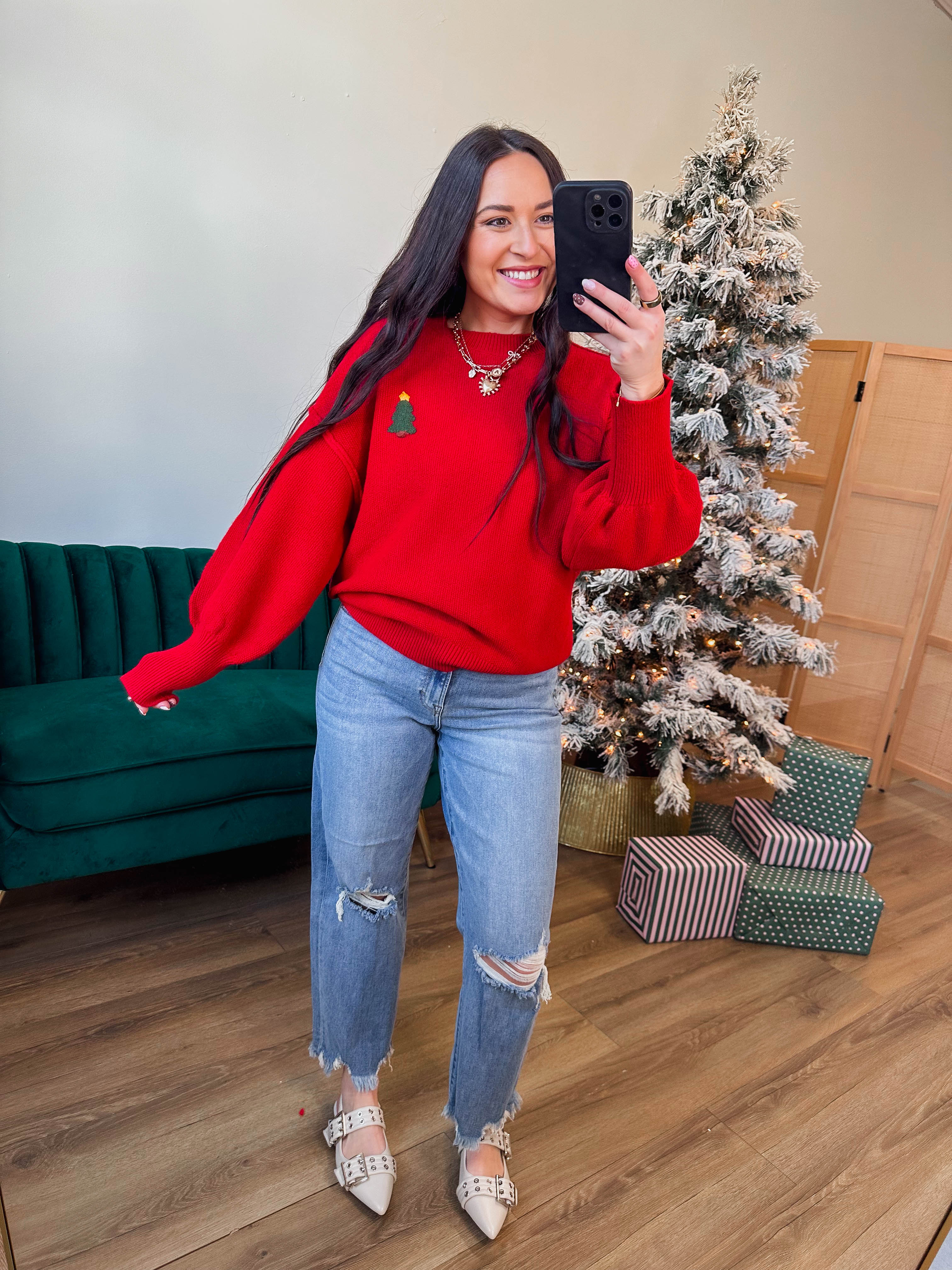 Spread holiday cheer in this festive sweater! Featuring a cheerful Christmas tree patch on the front and bold varsity lettering spelling "Merry Christmas" across the back, it's the perfect cozy layer for seasonal celebrations. The classic crew neckline and long sleeves keep you warm while the multicolor design adds playful personality to your holiday wardrobe.