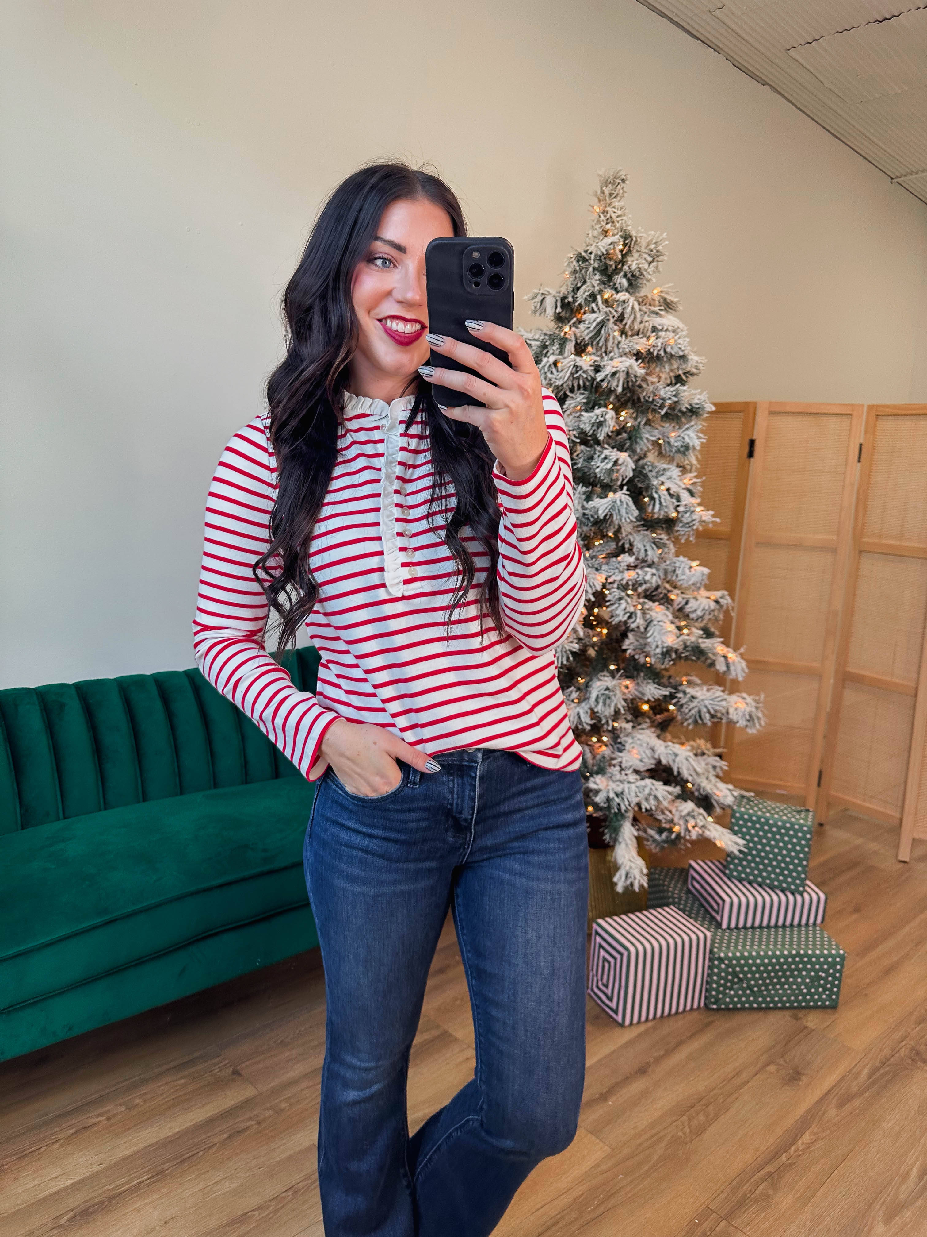 The Raya Striped Top is your new go-to for effortless style. This comfy top features a charming ruffle neck collar and long sleeves that transition seamlessly from work to weekend. The stripe pattern adds visual interest while the soft, stretchy fabric keeps you feeling great all day—dress it up or down with ease.
