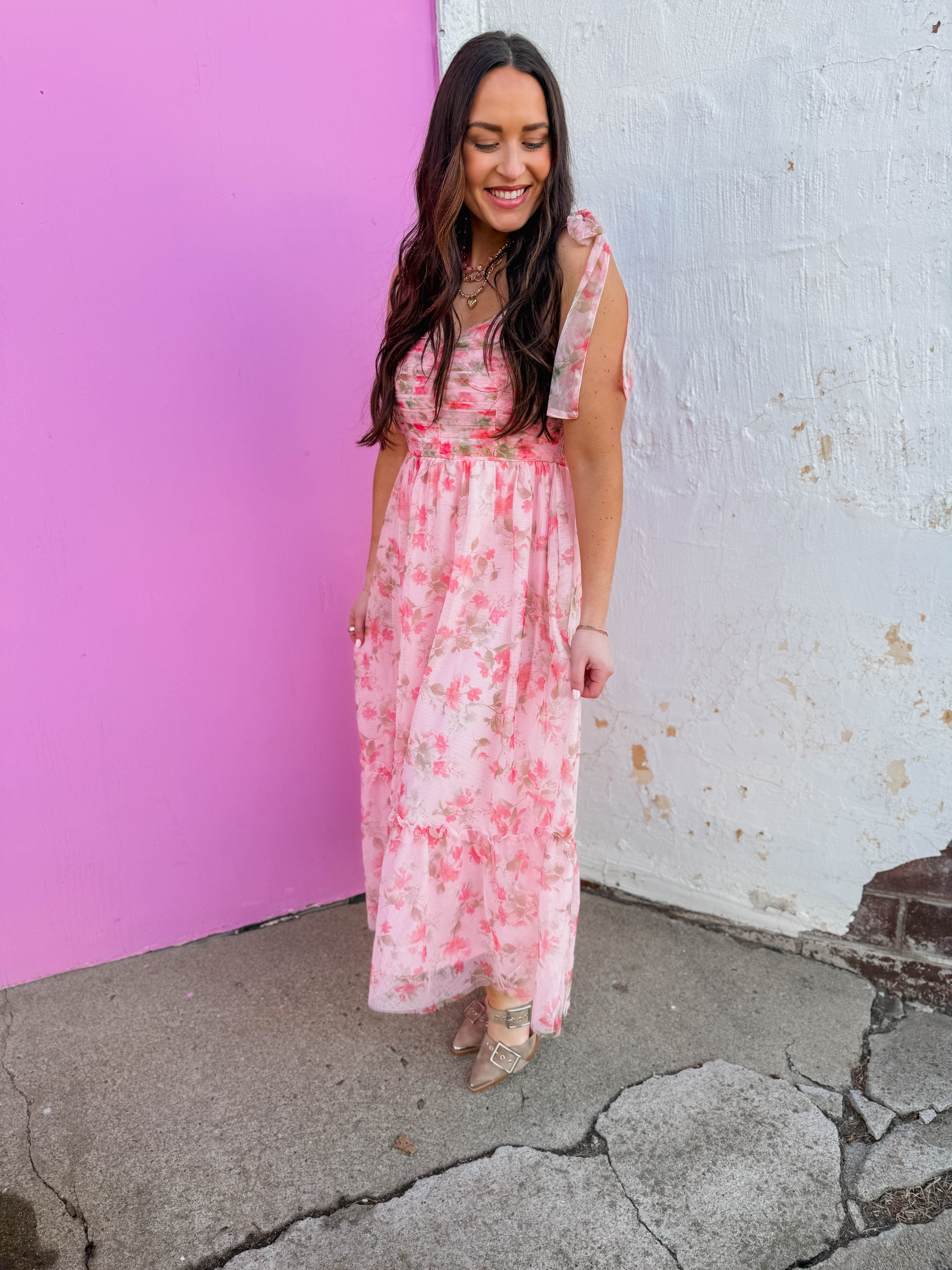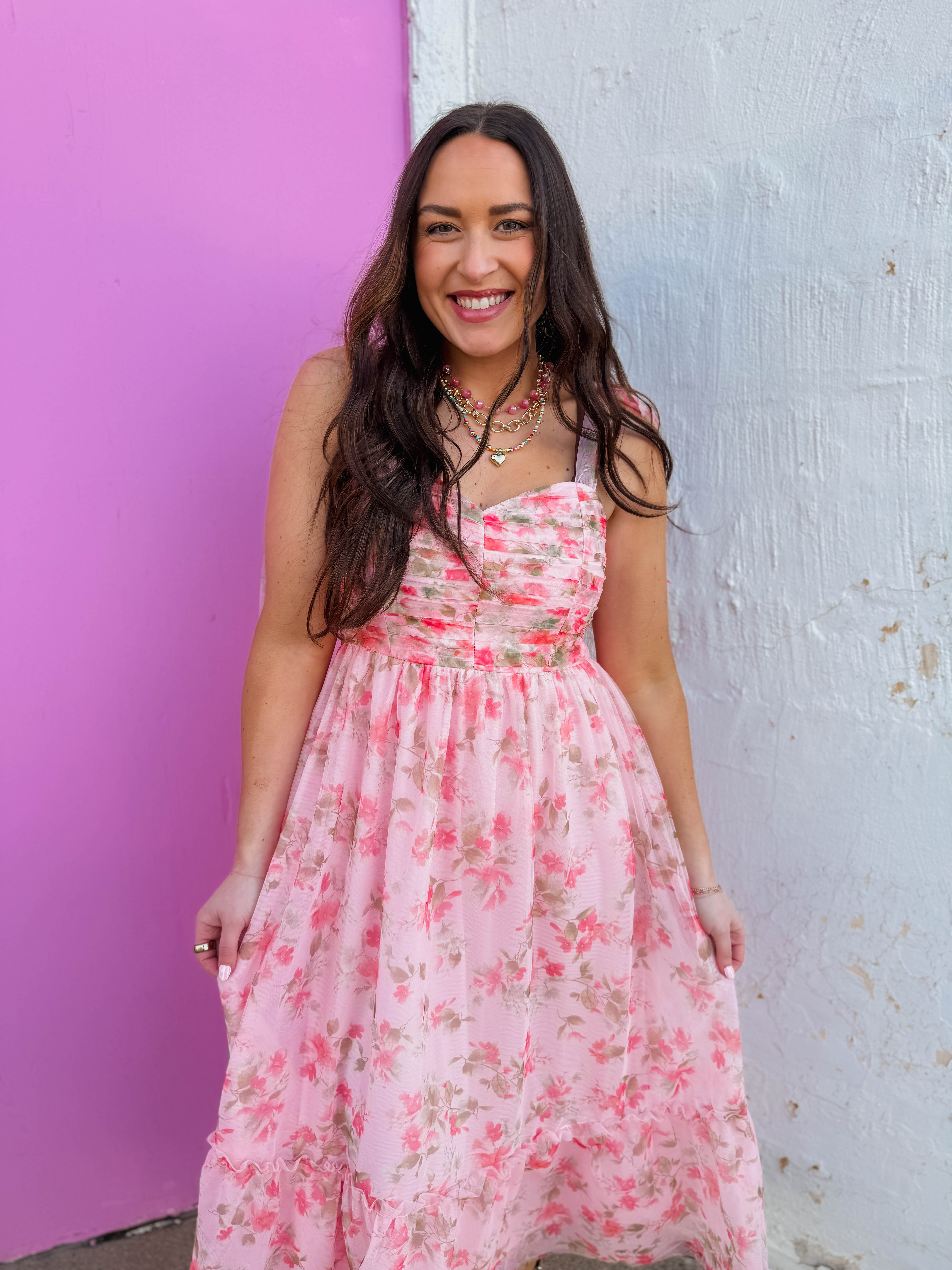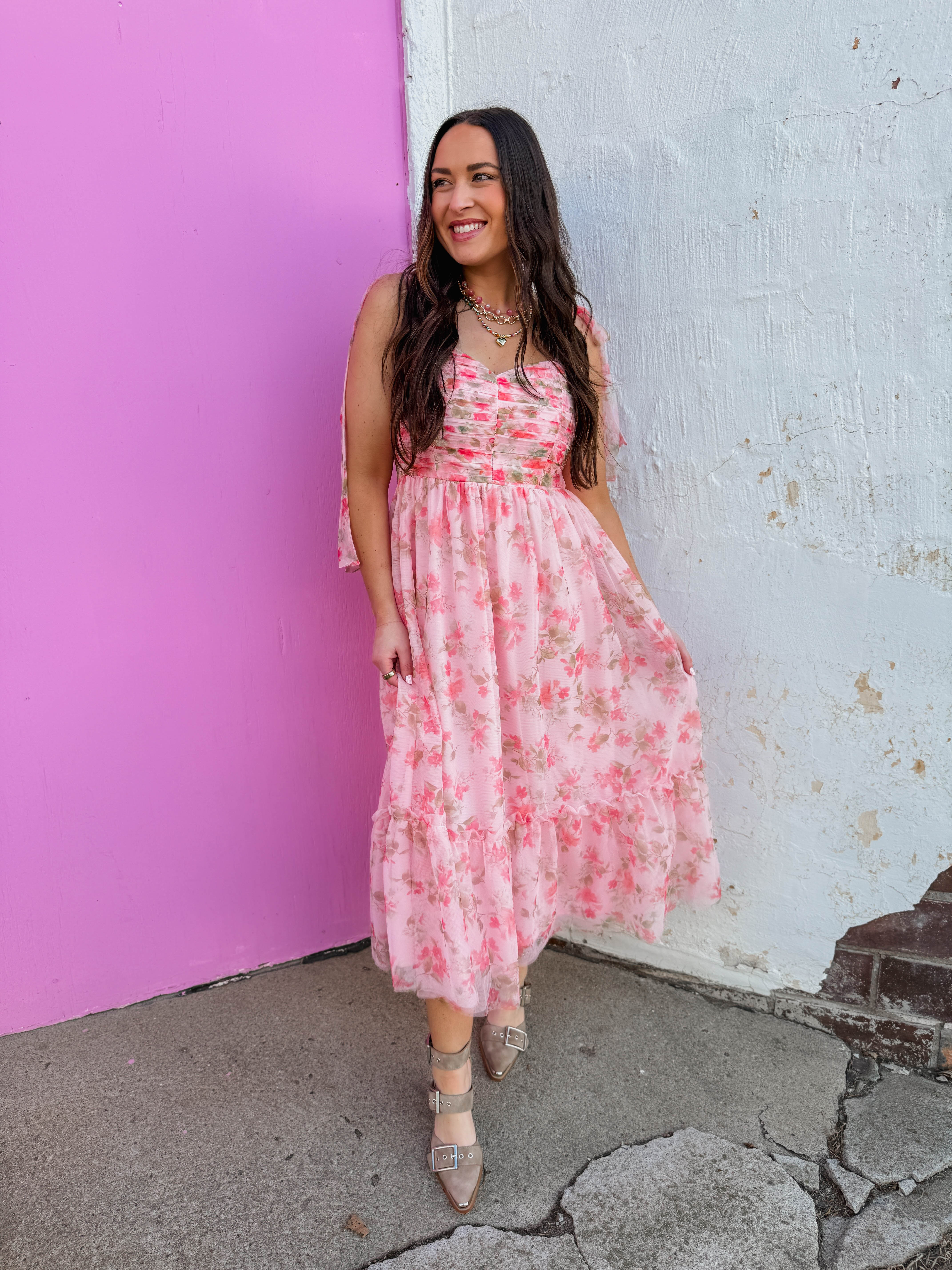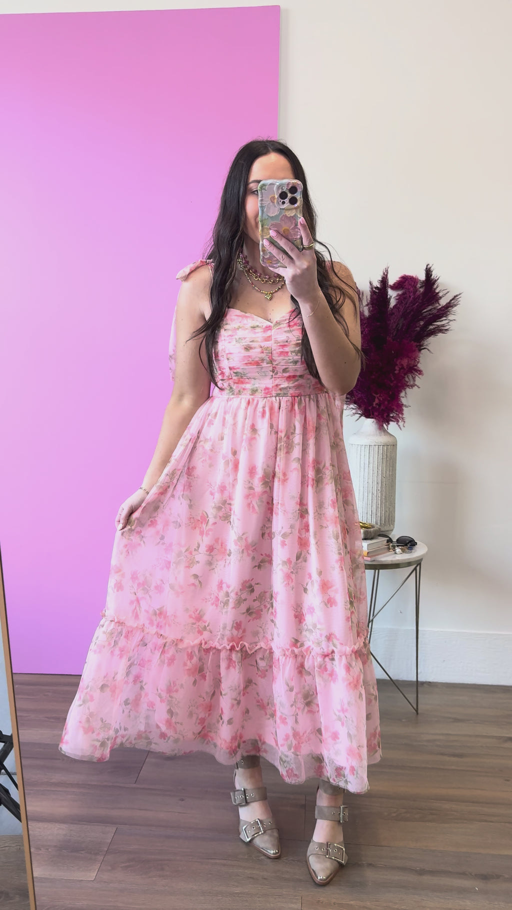 Twirl into spring and summer in this charming midi dress. Soft pink floral chiffon floats beautifully with playful, feminine details perfect for weddings, getaways, and every celebration in between. Effortlessly cute and ready for adventure.