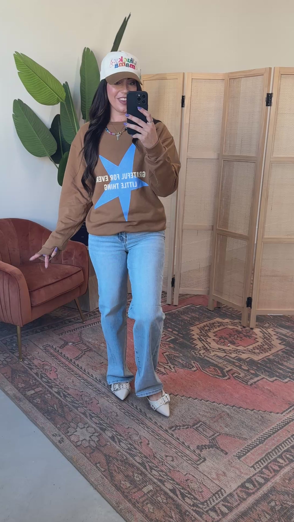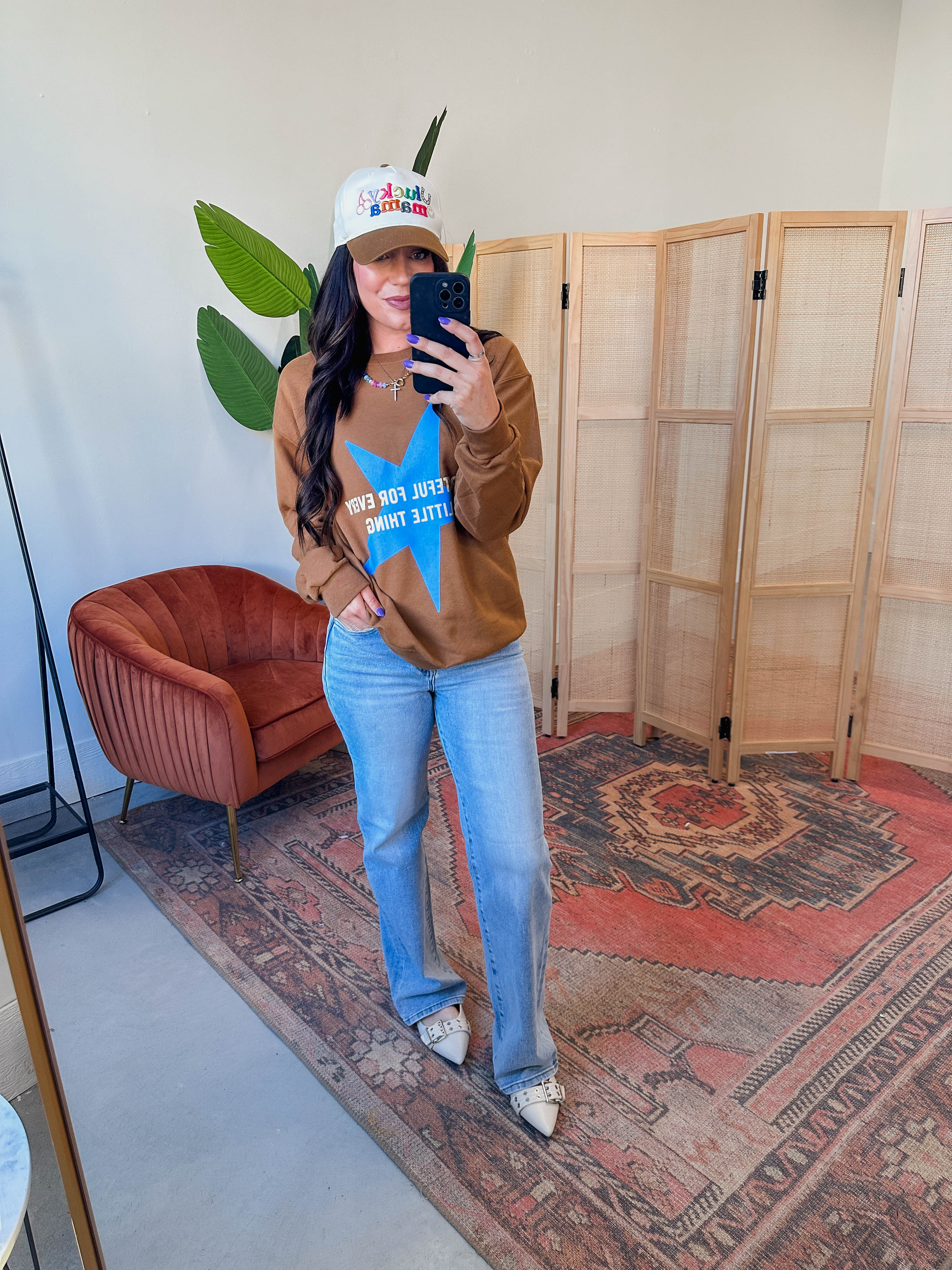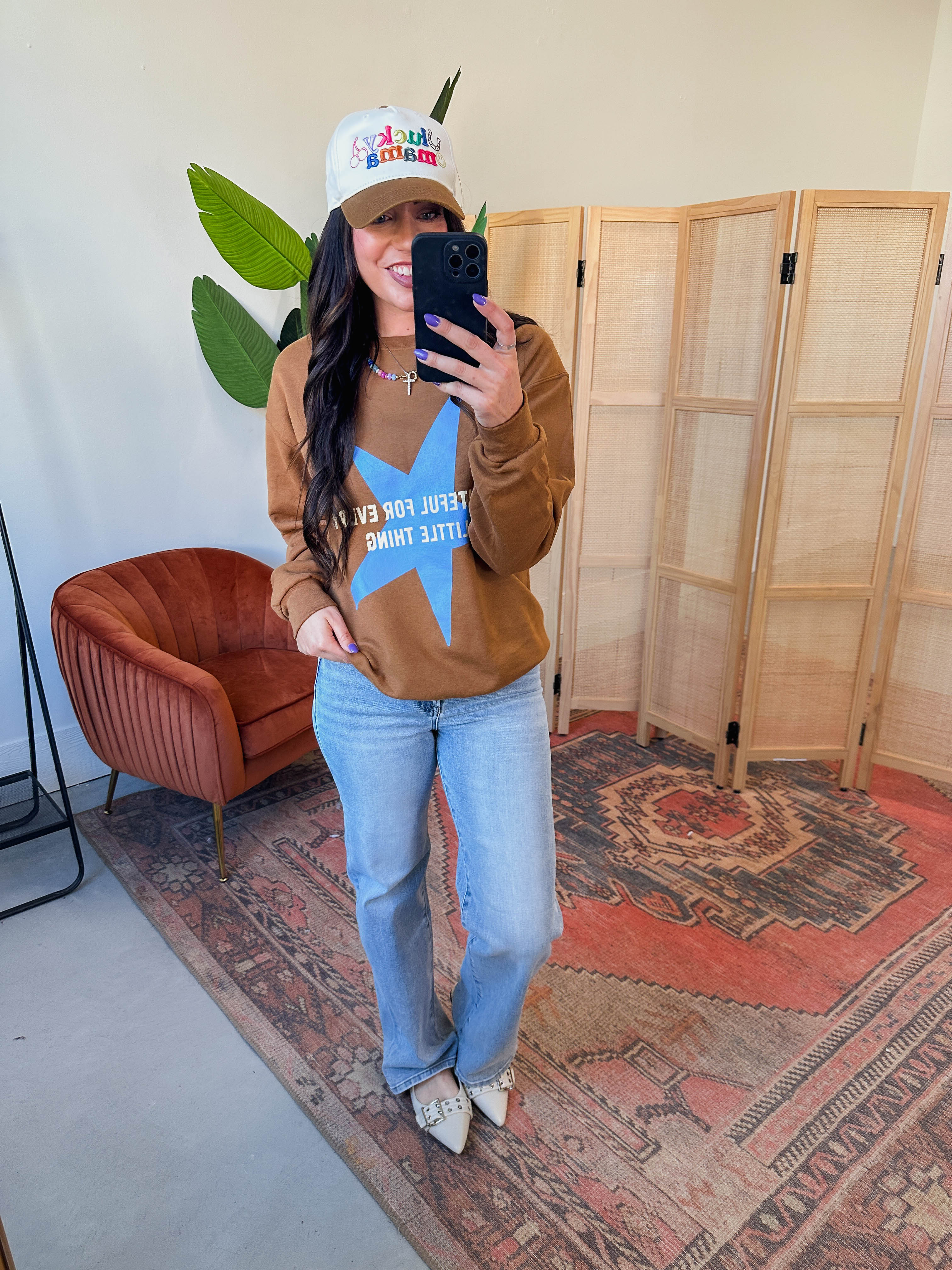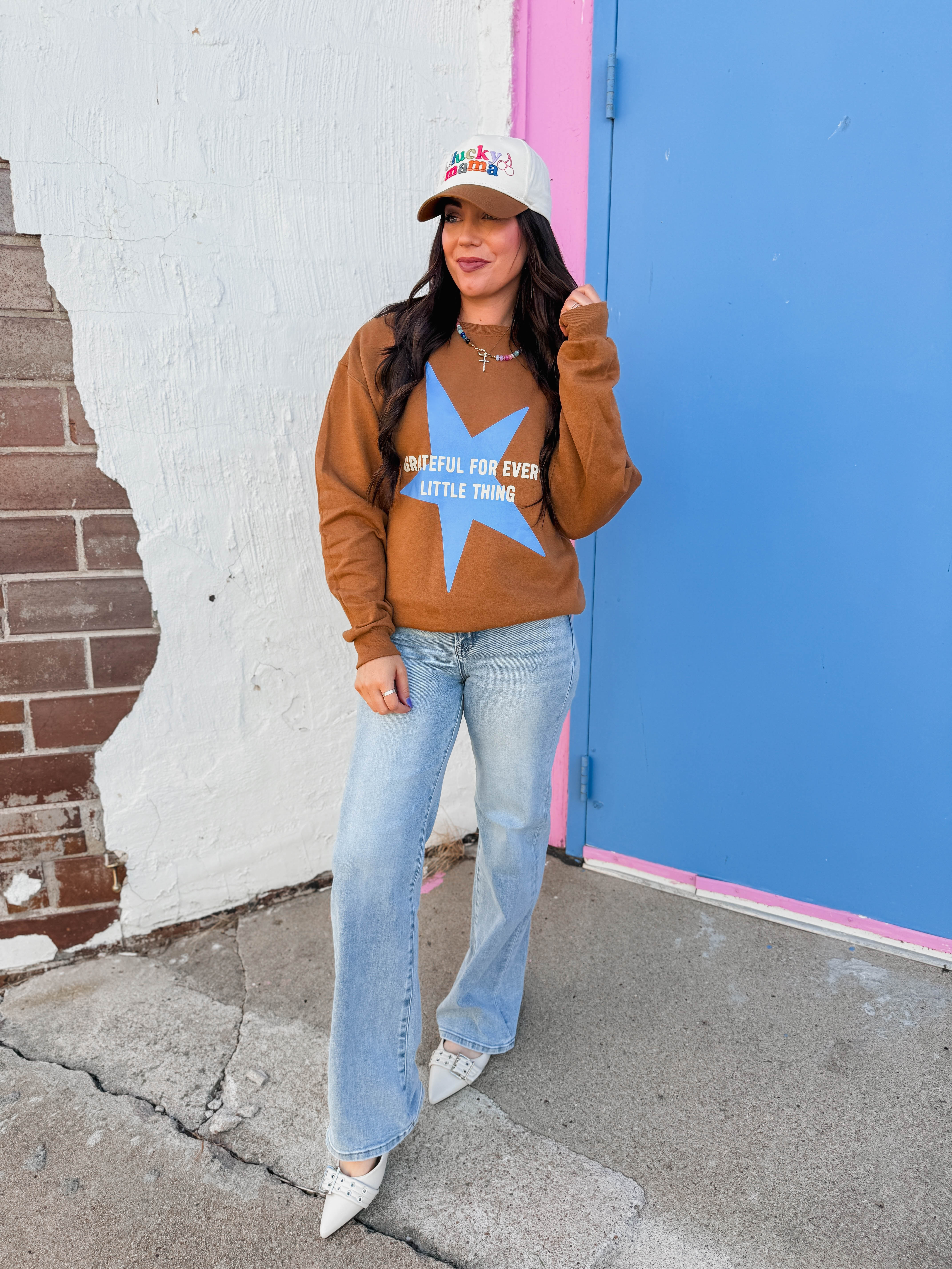 Cozy up in the Grateful For Every Little Thing Crewneck! This fleece-lined sweatshirt features a cute grateful star graphic, long sleeves, and a classic crew neckline—perfect for adding a trendy, comfy touch to your look.