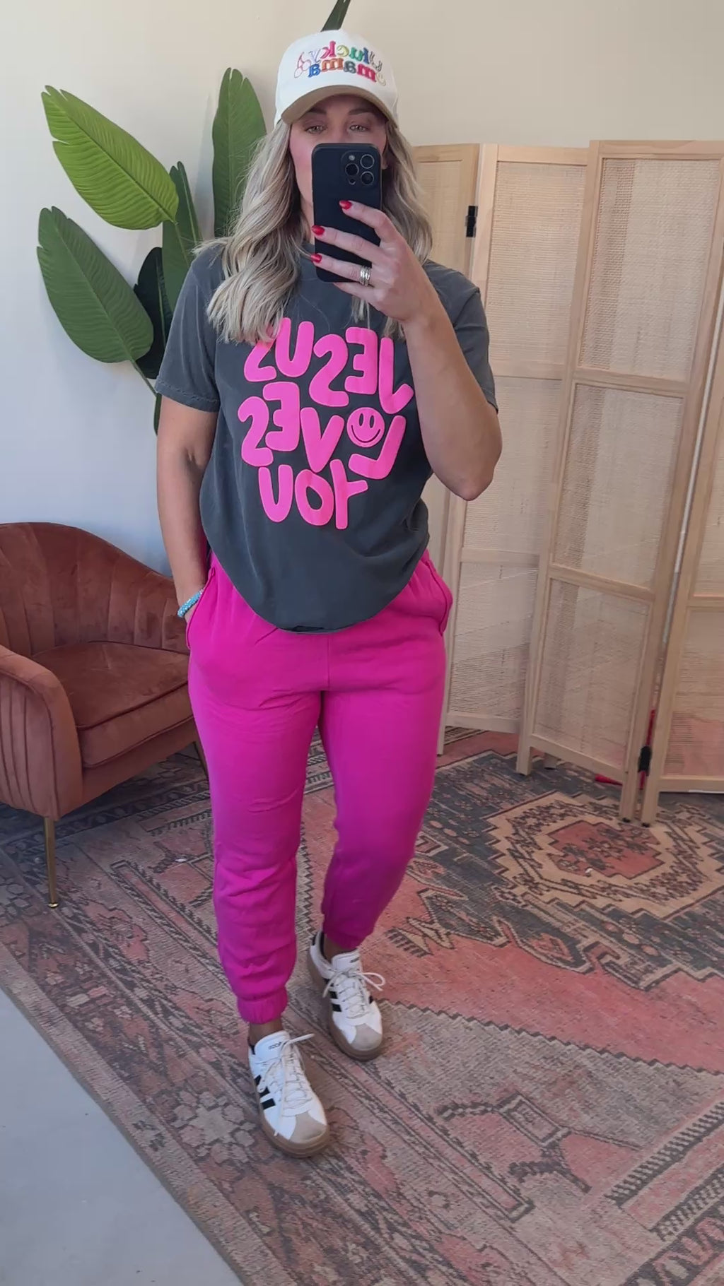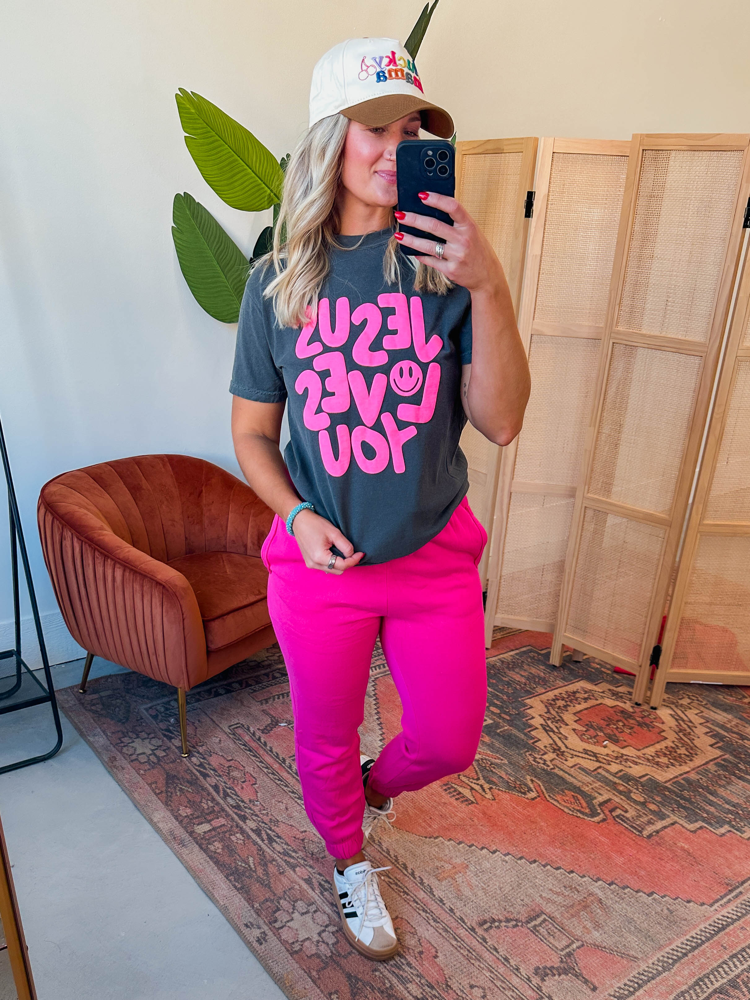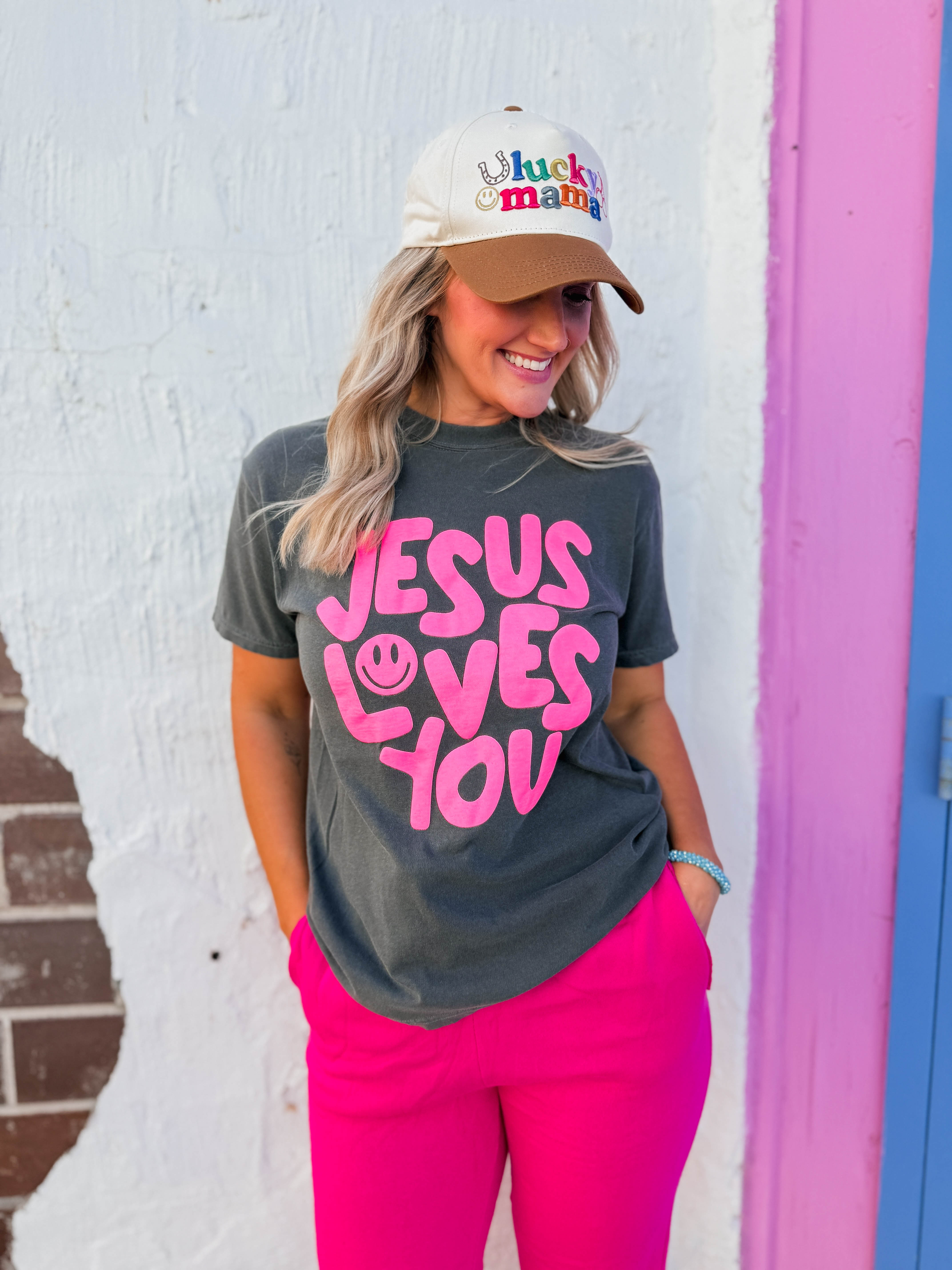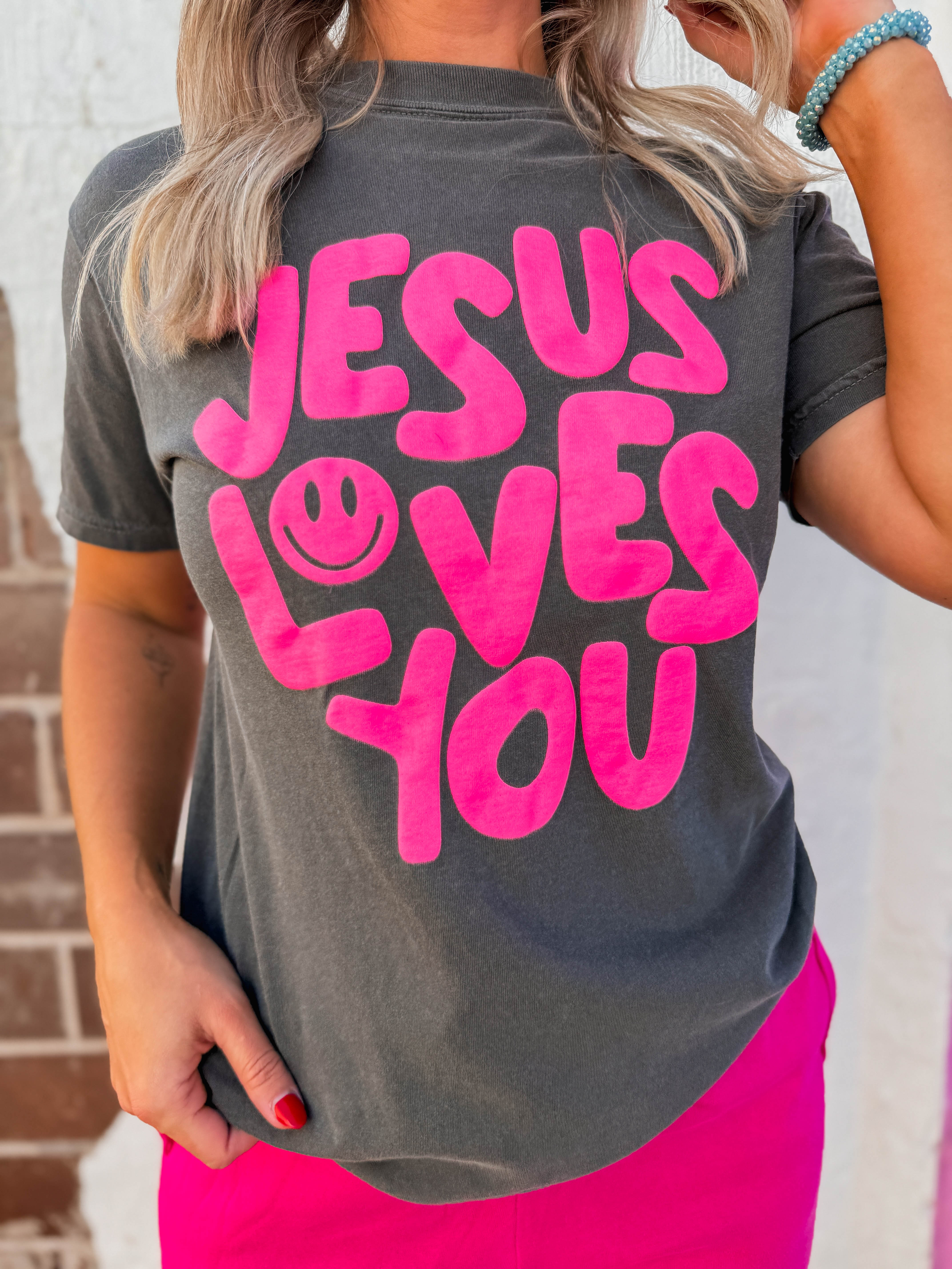 This Smiley Jesus Loves You Puff Tee adds a fun, uplifting vibe to your look. Featuring a crew neckline and short sleeves, it’s perfect layered under cardigans or jackets. Wear it oversized with bikers or leggings for easy, comfy style with a cheerful message.