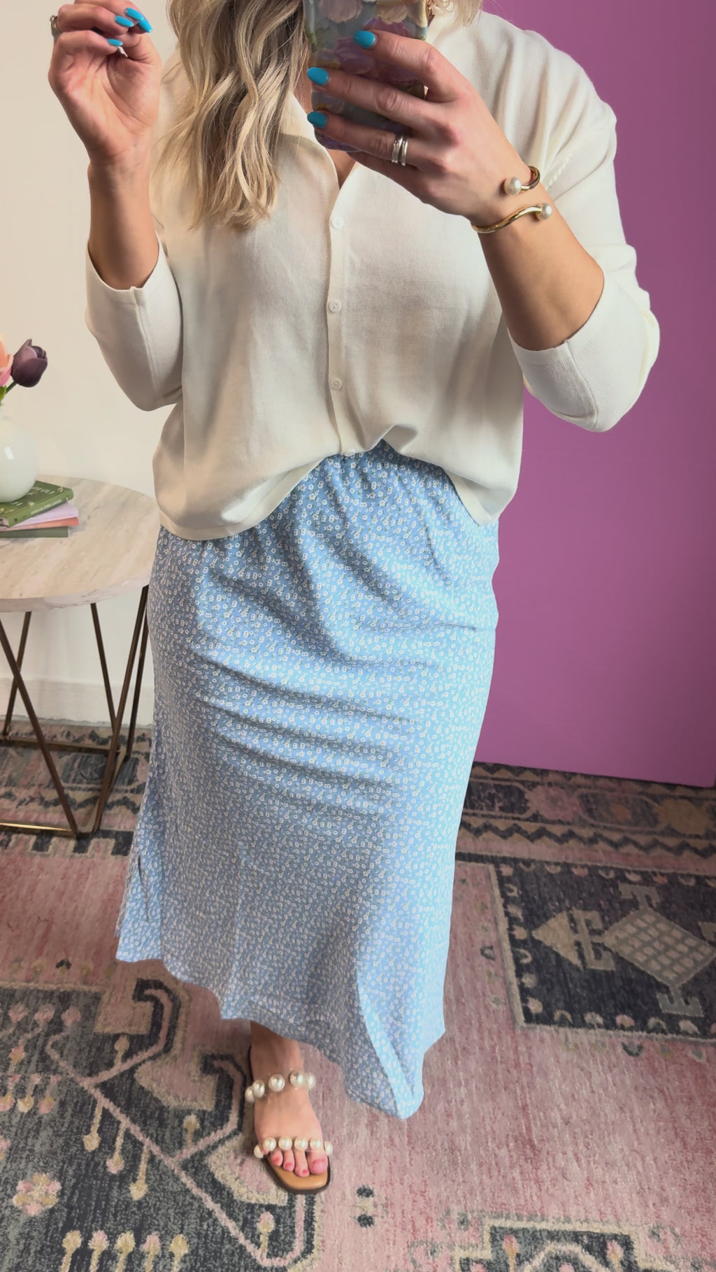 Twirl into spring and summer in this charming blue and white midi skirt. Featuring a delicate ditsy floral print, it's the perfect piece for everything from casual outings to special occasions. Dress it up with heels and a blouse or keep it relaxed with sneakers and a tee—this versatile skirt does it all.