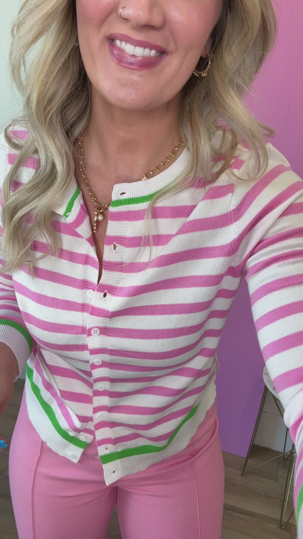 Stripes meet style in this versatile Camille Cardigan. Featuring a classic crew neckline, long sleeves, and charming contrast trim, it's the perfect layer for any occasion. The button-front closure and striped pattern make it effortlessly chic—dress it up for the office or down for weekend vibes. Your new go-to piece for work-to-weekend transitions.
