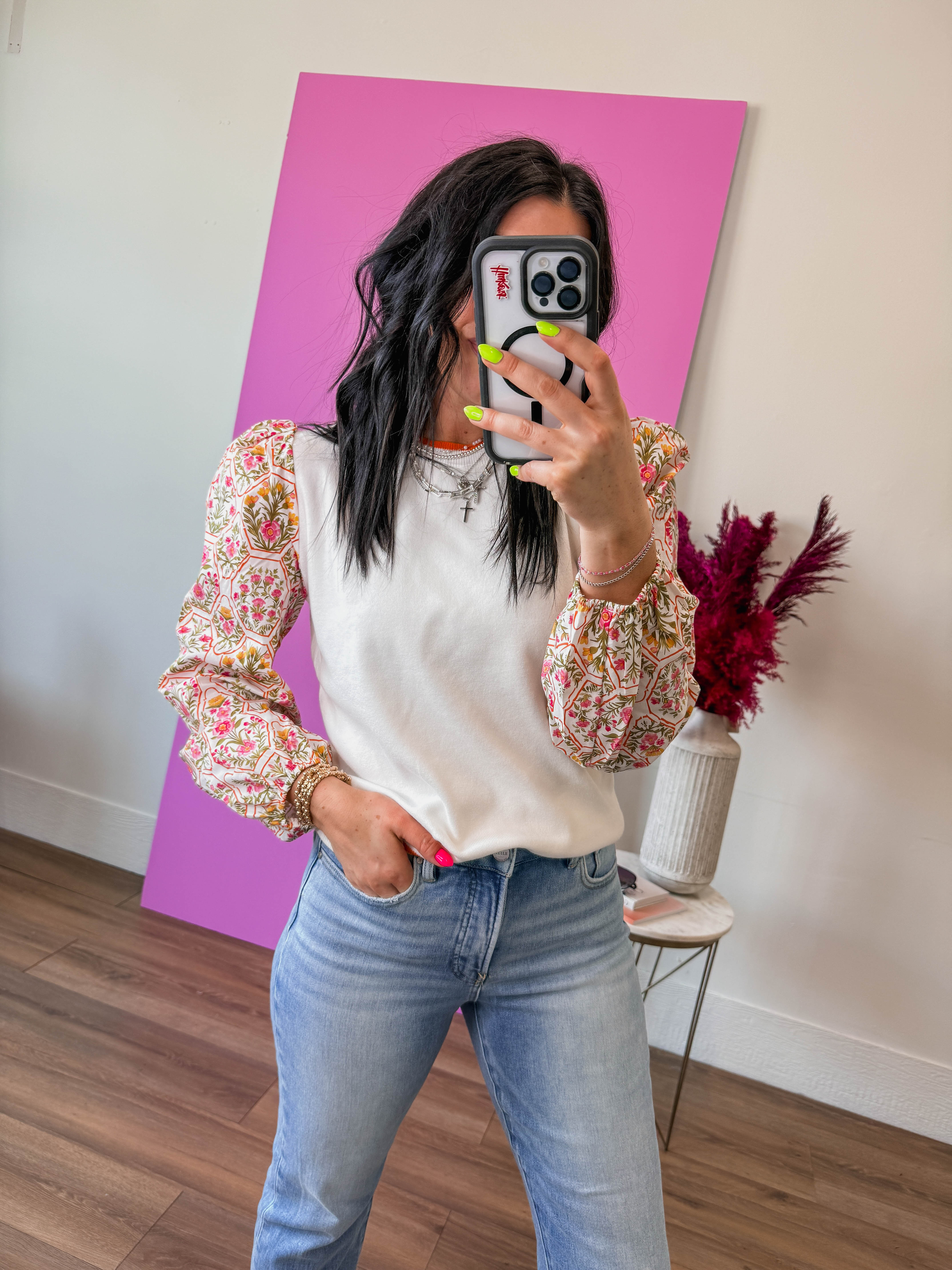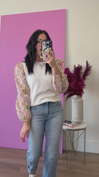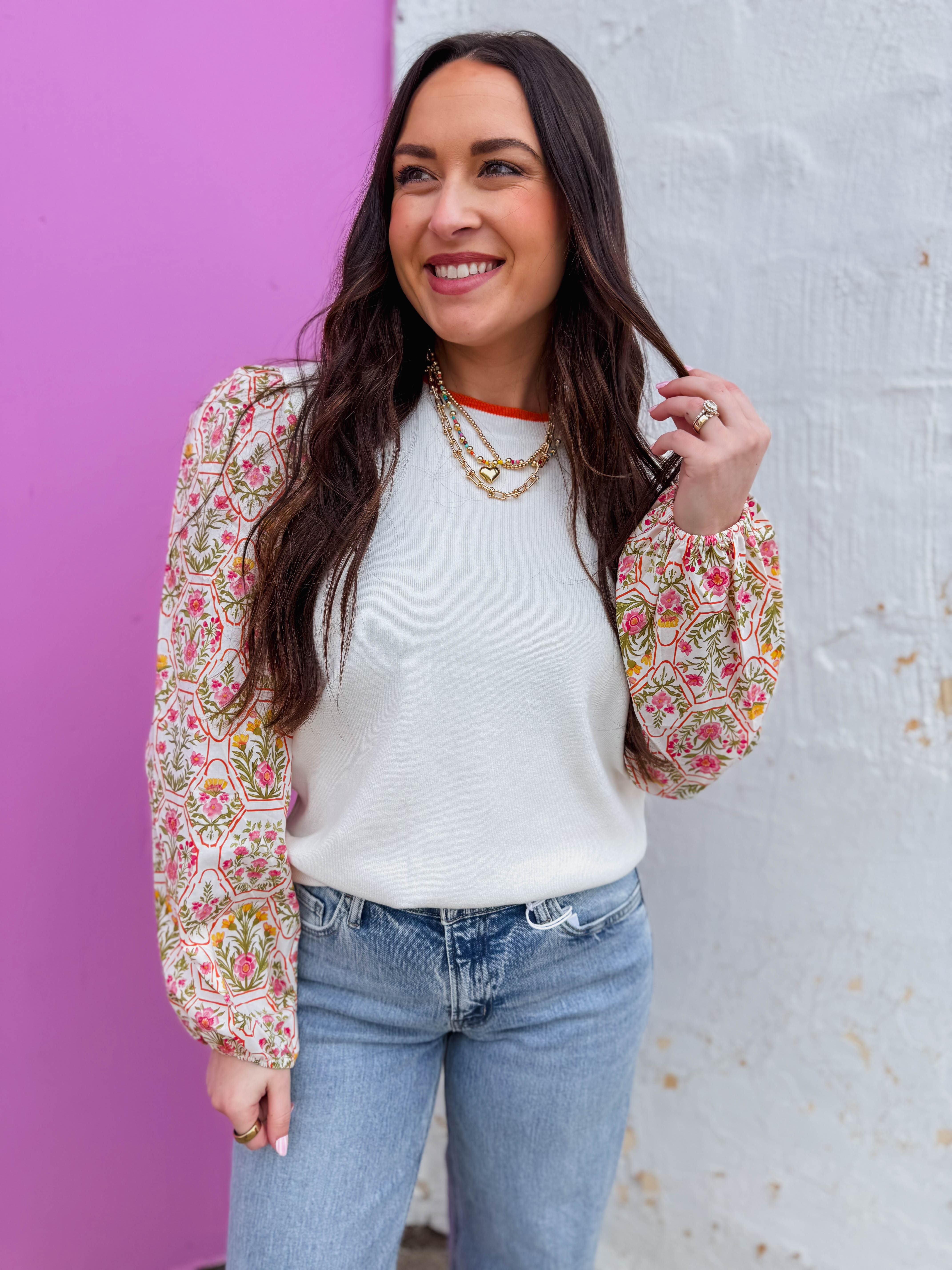 The Cleo Knit Top is your go-to sweater for any season. Featuring eye-catching botanical print sleeves that add personality to a classic knit silhouette, this piece transitions effortlessly from casual to polished. Pair it with dark denim for a refined look or light denim for something more relaxed. Versatile, charming, and endlessly wearable.