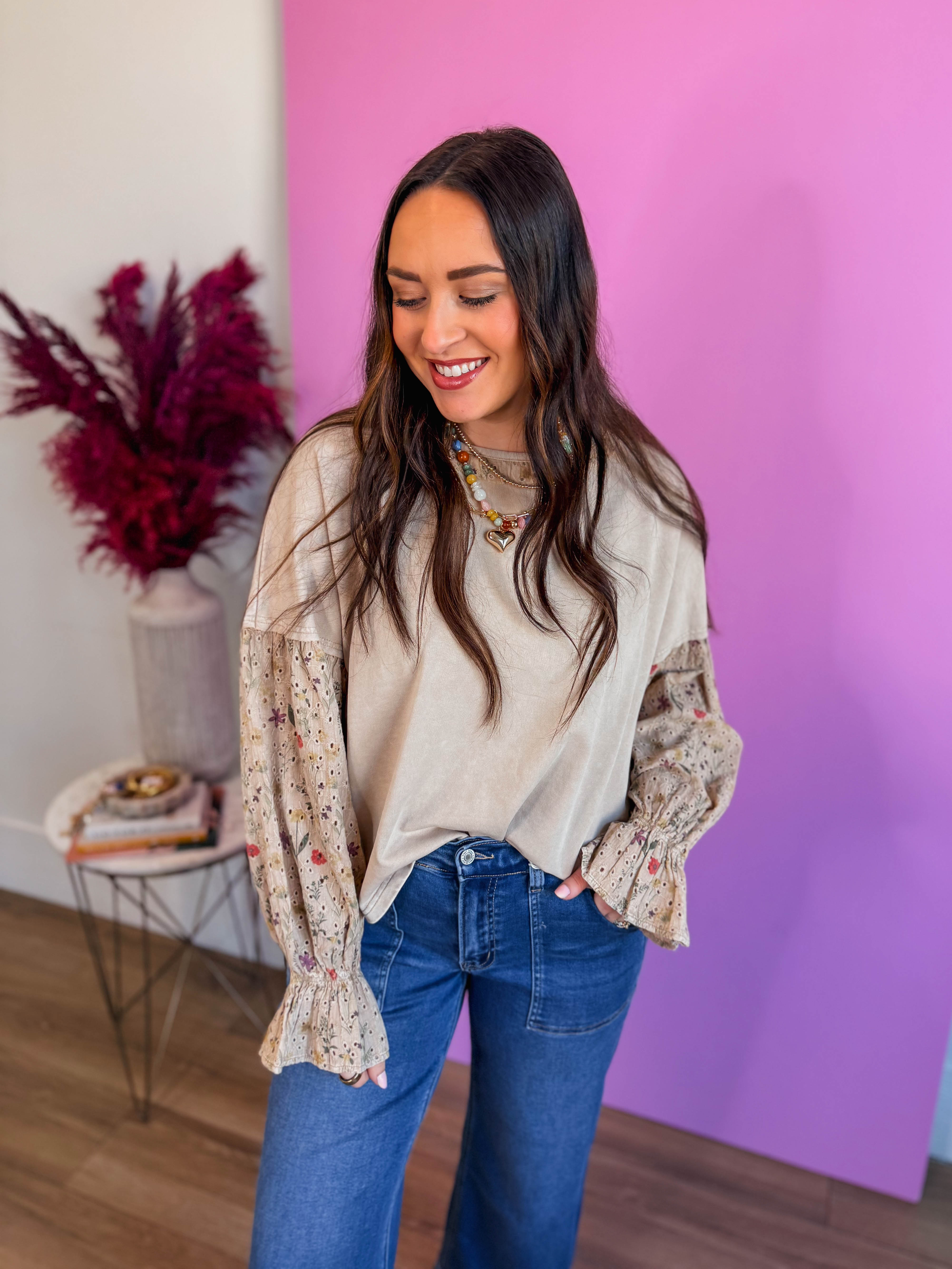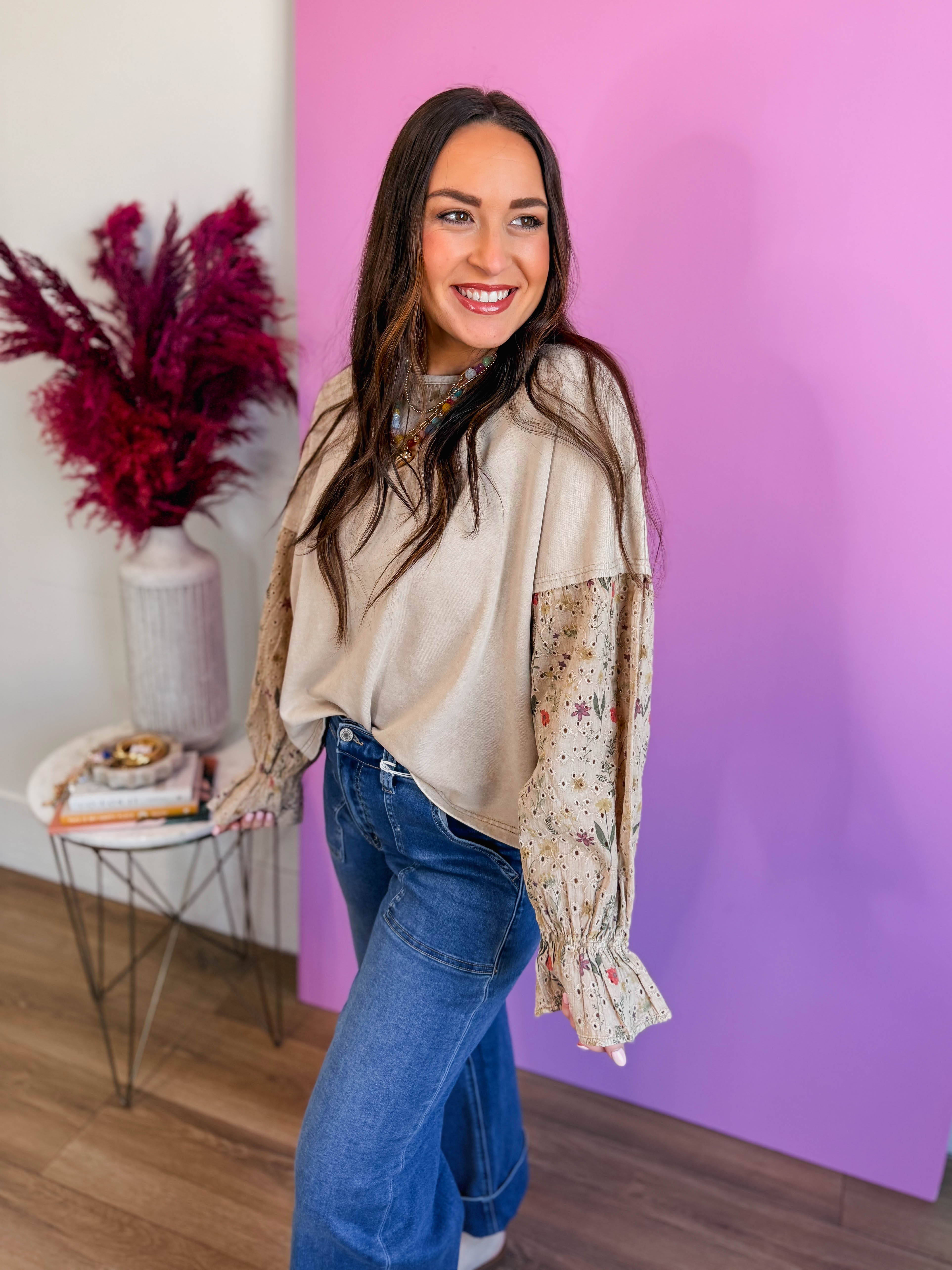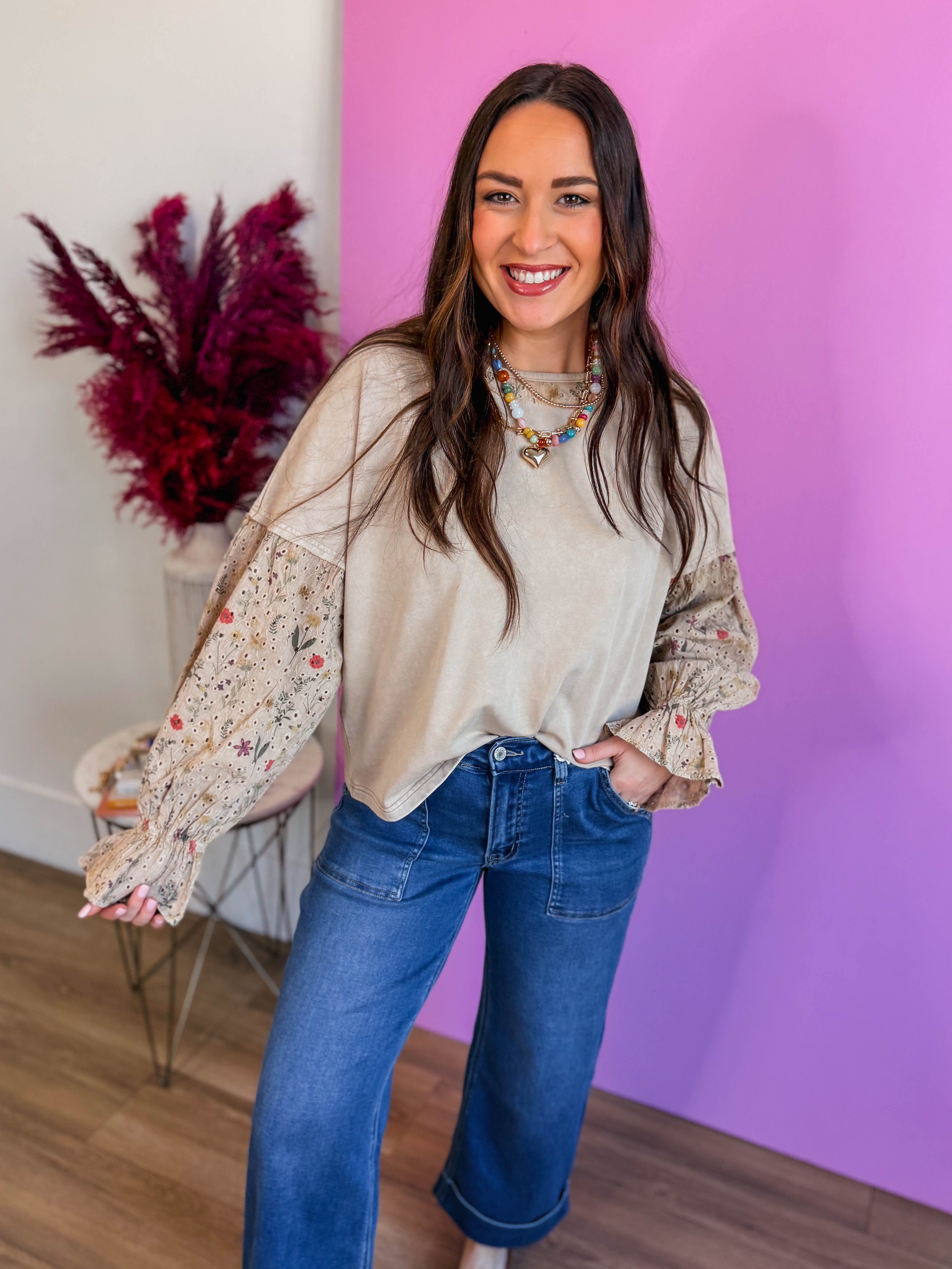 The Eleanor Top is your go-to piece for effortless style. This charming mixed media top pairs soft cotton with delicate floral eyelet for a fresh, textured look. The round neckline features crisp contrast trim, while playful bell sleeves add movement and flair. A surprise eyelet detail adorns the back, making it just as cute from behind. Perfect for layering year-round, this versatile top brings a touch of whimsy to any outfit.