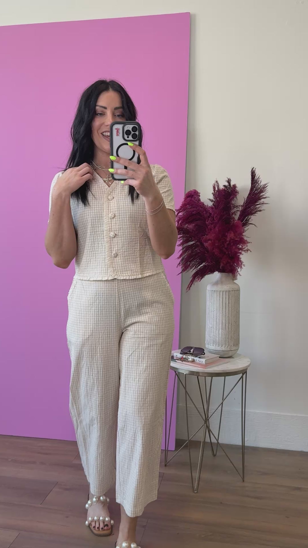 The Emery Gingham Pants bring timeless charm to your everyday wardrobe. The classic pattern and neutral beige tone make them incredibly versatile—pair them with our matching top for a coordinated look, or style them with your favorite tees and blouses for endless combinations. The straight leg silhouette offers comfortable, all-day wear. Perfect for casual outings, work settings, or relaxed weekends, these pants are a foundational piece that works hard in your closet.