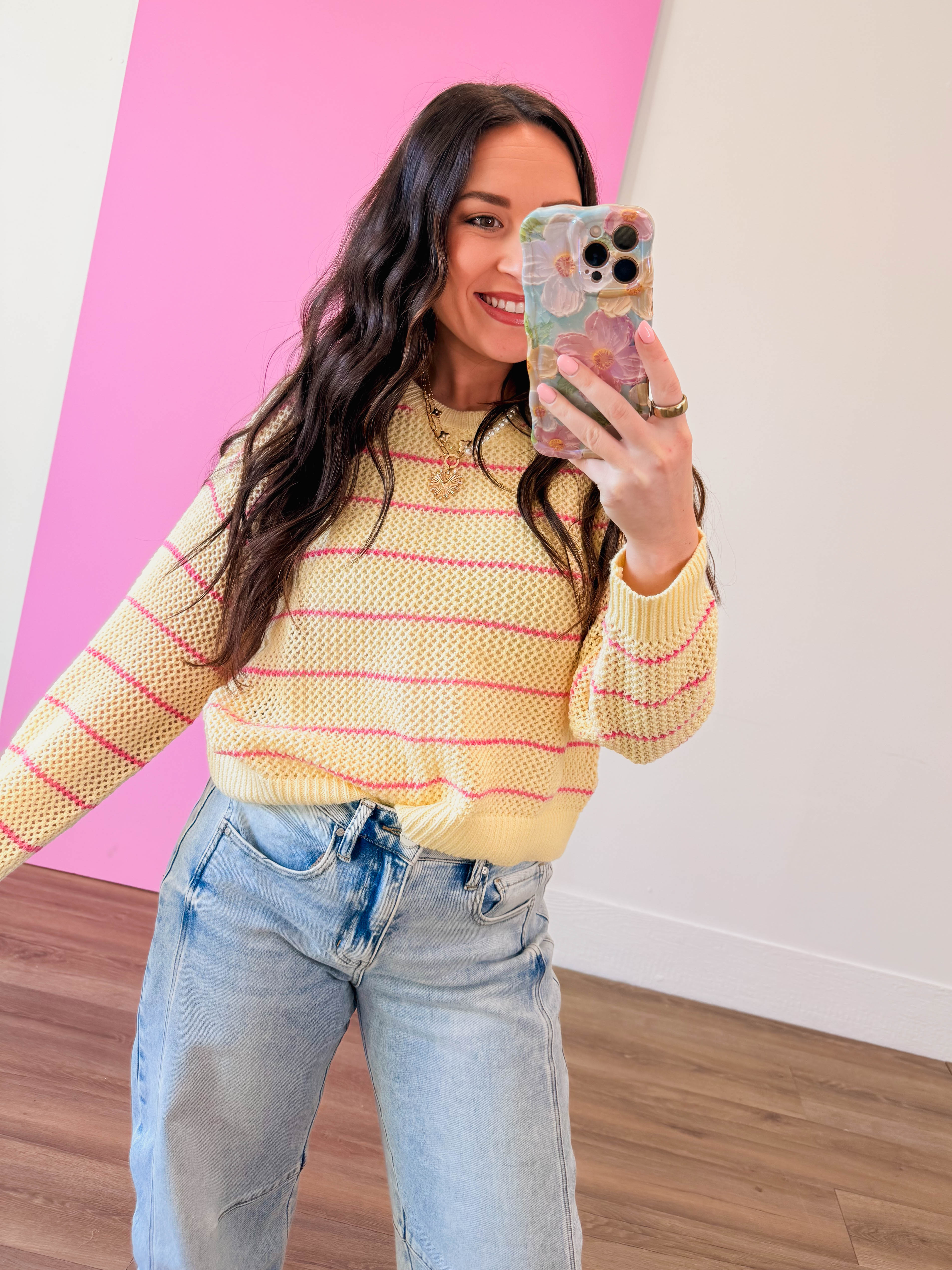Meet your new seasonal favorite! The Kenna Striped Sweater is the perfect lightweight layer for warmer days. Featuring a crew neckline, long sleeves, and an open knit design, this pullover strikes the ideal balance between cozy and breathable. The fun striped pattern adds a pop of personality, while the semi-sheer fabric keeps things fresh and flowy. Toss it on over a tank or even your swimsuit—either way, you've got effortless spring and summer style covered.
