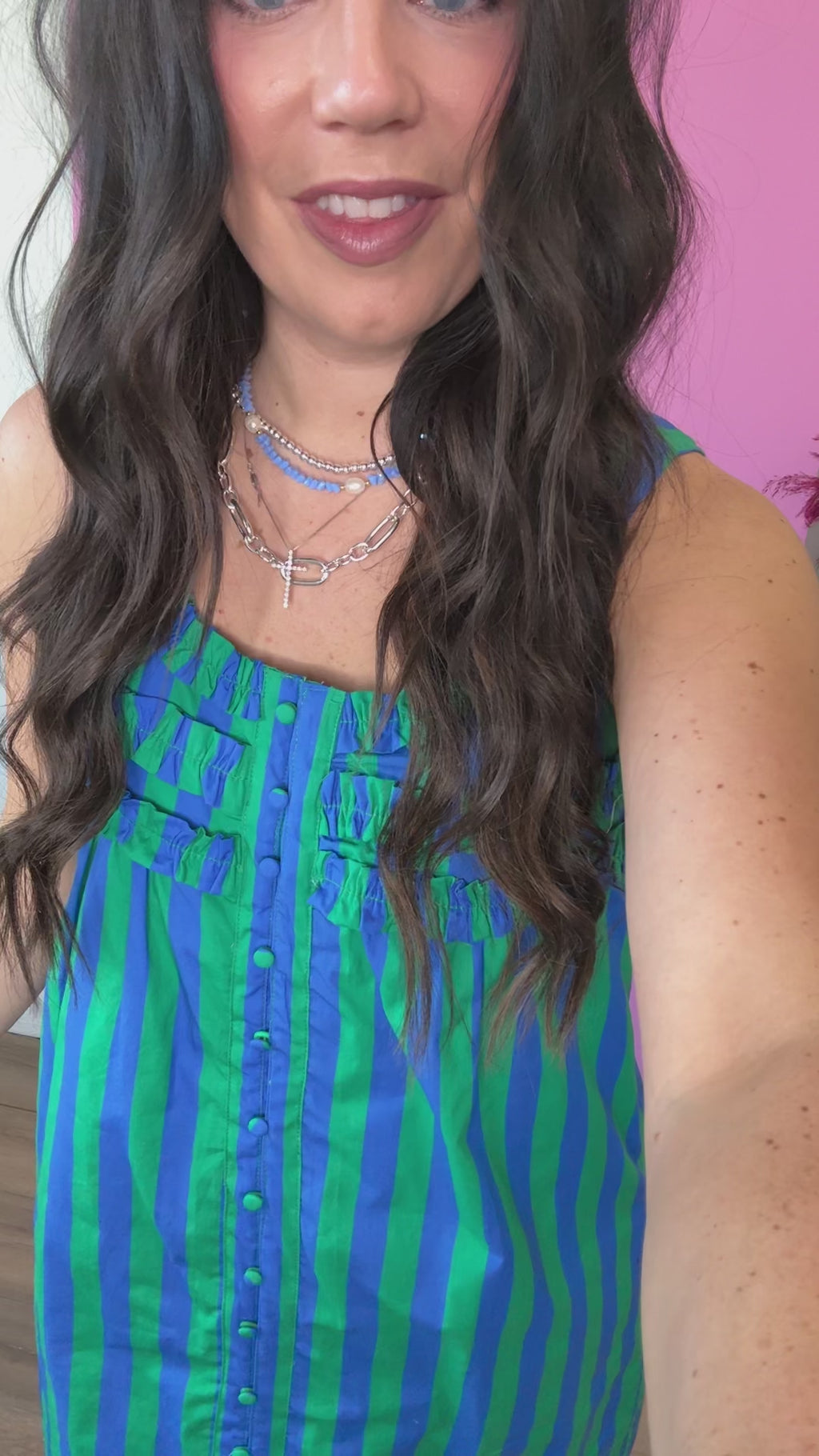 Playful stripes meet feminine charm in this mini dress that's ready to turn heads. The button-front closure adds an easy, breezy vibe while delicate ruffles frame the neckline for extra flair. Perfect for adding a fun pop of color and pattern to your everyday rotation, this dress transitions effortlessly from casual outings to weekend adventures. A wardrobe essential that celebrates bold style with a lighthearted twist.