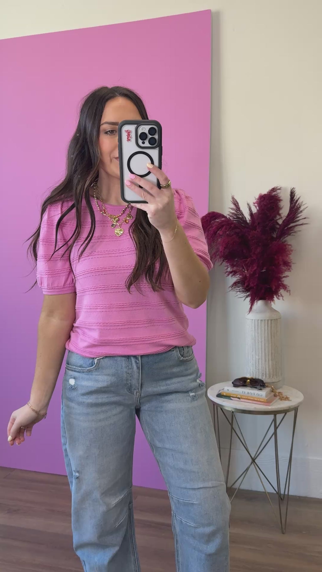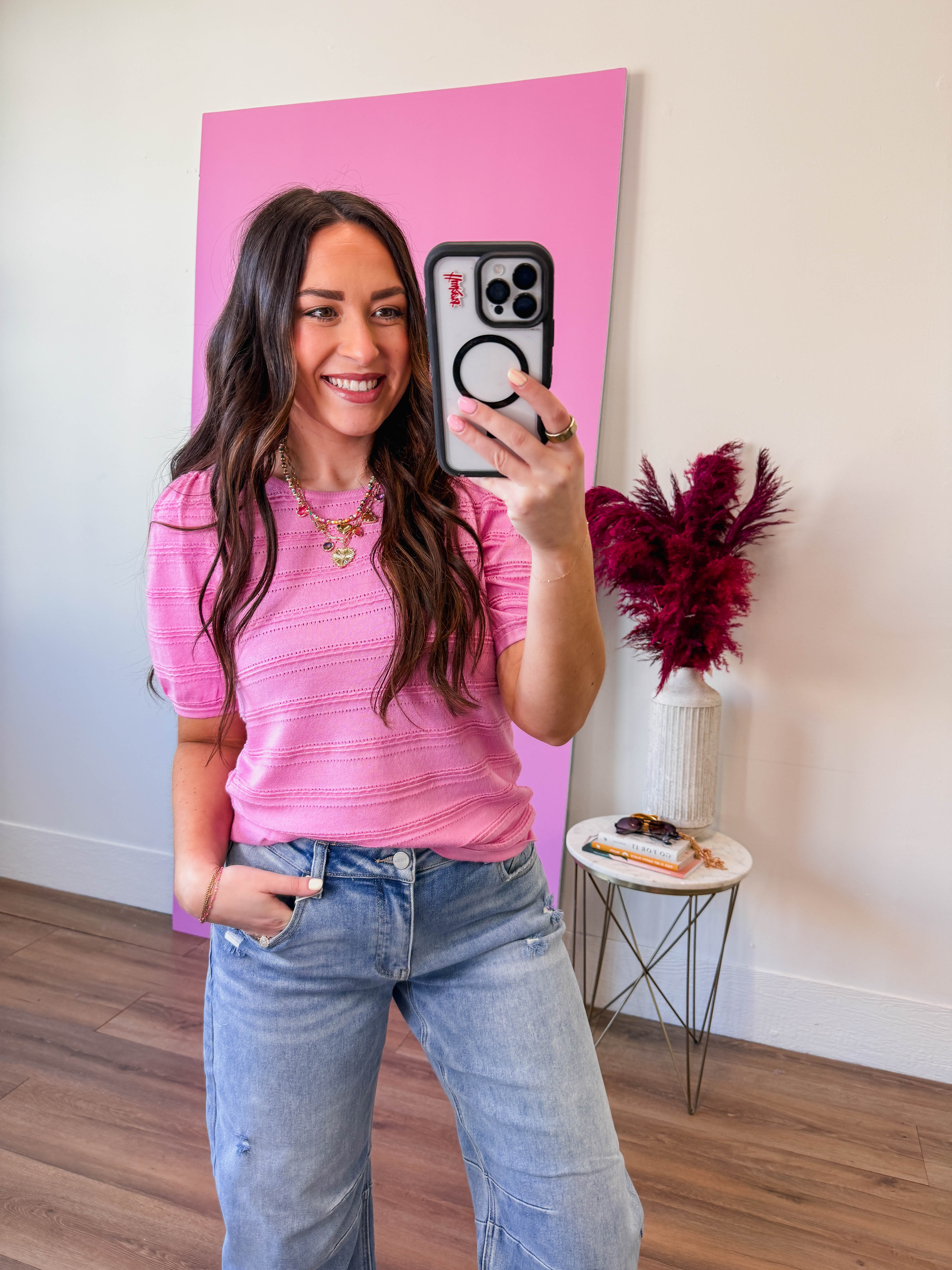 The Lindy Knit Top brings effortless charm to your warm-weather wardrobe. This lightweight sweater features a classic round neckline and playful half balloon sleeves that add movement and personality. Textured striping creates visual interest while keeping things breezy and breathable—perfect for layering or wearing solo. A cute pop of color and texture that transitions seamlessly from spring into summer.