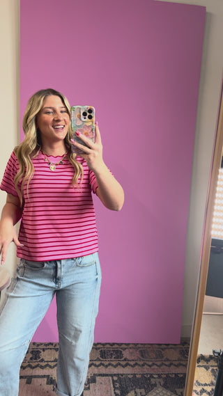 The Lizzie Striped Tee brings playful style with bold red and pink stripes and charming scalloped edges. Crafted from soft, stretchy fabric, it moves with you all day while keeping things fun and flirty. Perfect for anyone who loves a pop of color with comfort.