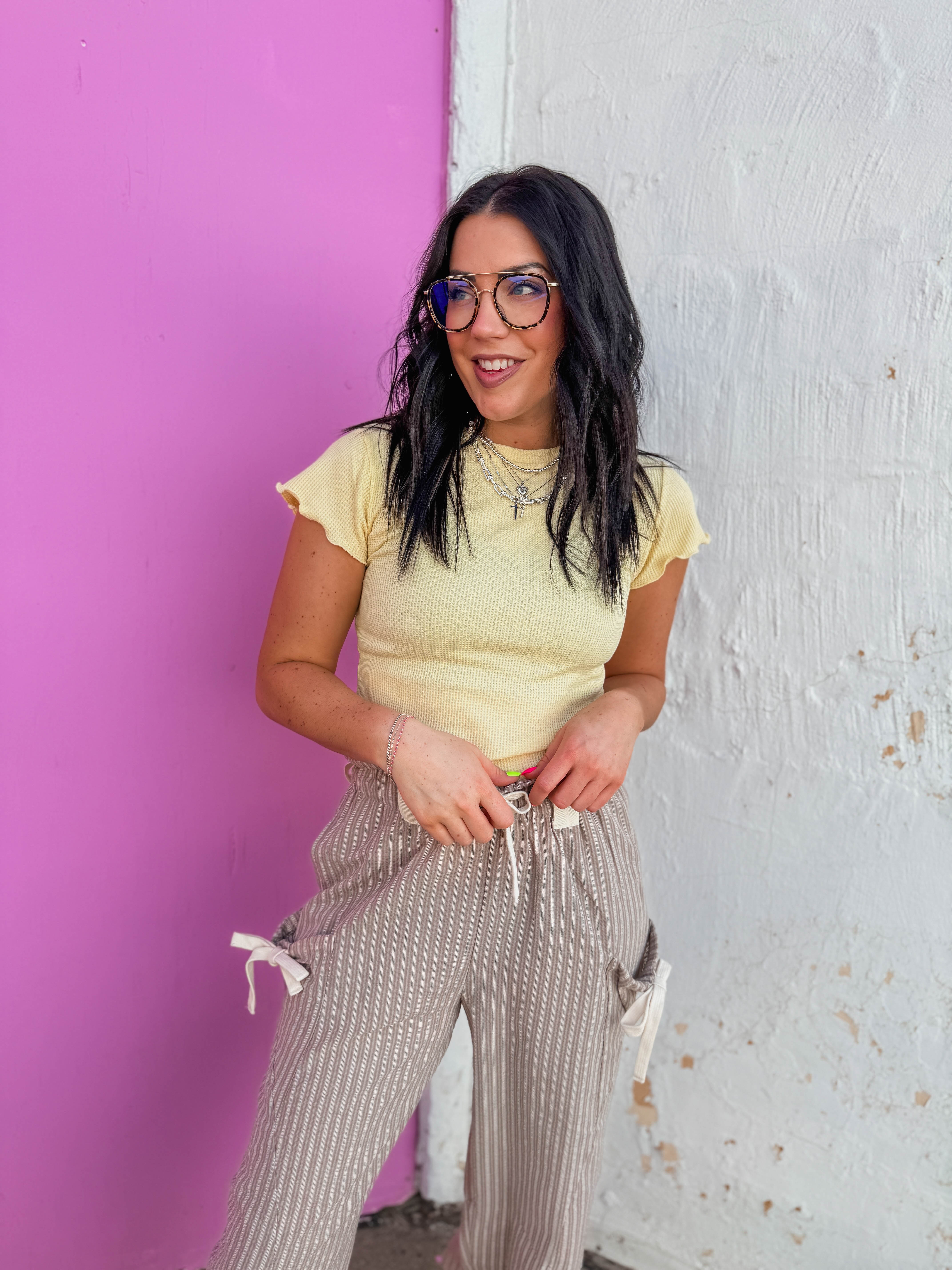 Elevate your basics with the charming Lola Waffle Knit Tee. The lightweight waffle knit fabric provides breathability while maintaining a simple, versatile silhouette. Perfect for year round, this tee pairs effortlessly with shorts, skirts, or jeans for countless casual combinations. The lettuce hem brings a fun, finished look that feels both trendy and timeless, making it a standout piece that works great on its own or layered under jackets and cardigans.