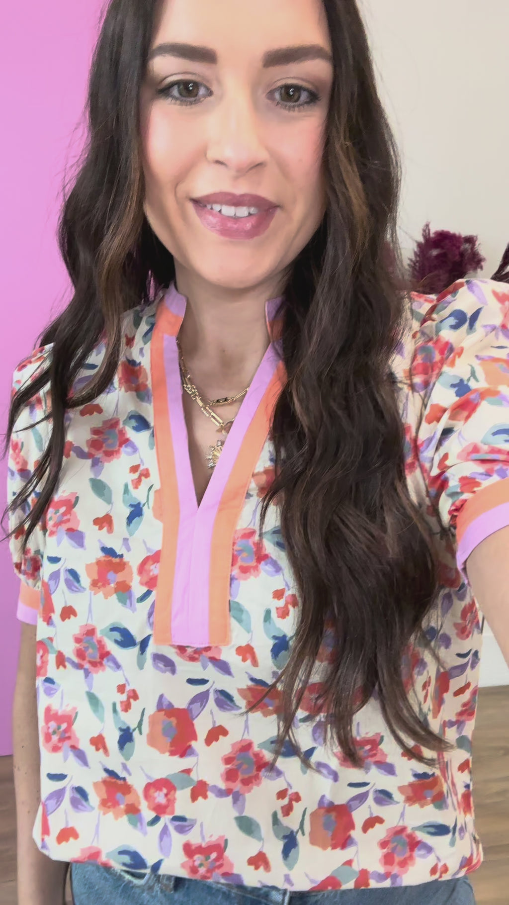Meet your new go-to blouse. The Maggie Floral Top features a chic V-neckline and playful puff sleeves that add instant charm. Bursting with colorful florals and finished with contrasting trim, it's the perfect pick-me-up for your wardrobe. Dress it down on weekends or pair it with tailored trousers for work—this versatile top does it all with style and personality.
