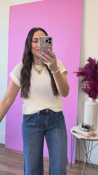 Effortlessly chic and oh-so-wearable, this striped knit top brings breezy vibes to your warm-weather wardrobe. The open weave keeps things light and airy, while the crew neckline and short sleeves offer timeless appeal. Side slits add a flirty touch of movement, making it perfect for casual days or dressed-up occasions. A playful spring and summer essential.