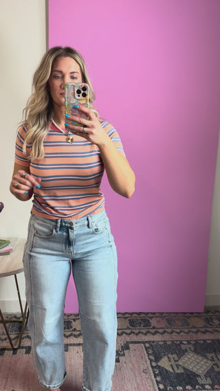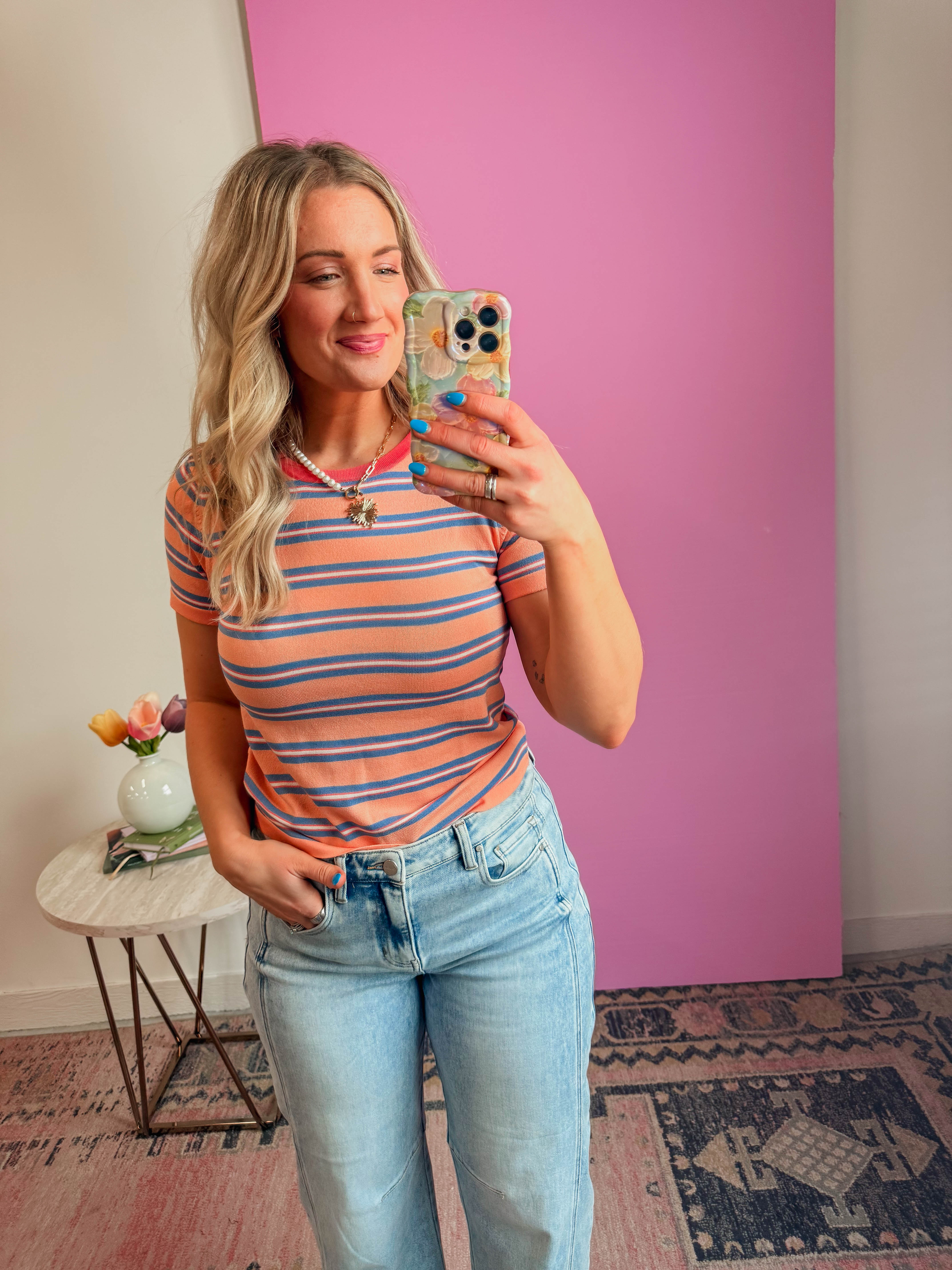 Make a statement with the Teagan Striped Tee. Bold multicolor stripes bring playful energy to your warm-weather wardrobe, while the soft, stretchy fabric keeps you comfortable all day long. Perfect for spring and summer adventures, this fun and trendy piece pairs effortlessly with your favorite basics.