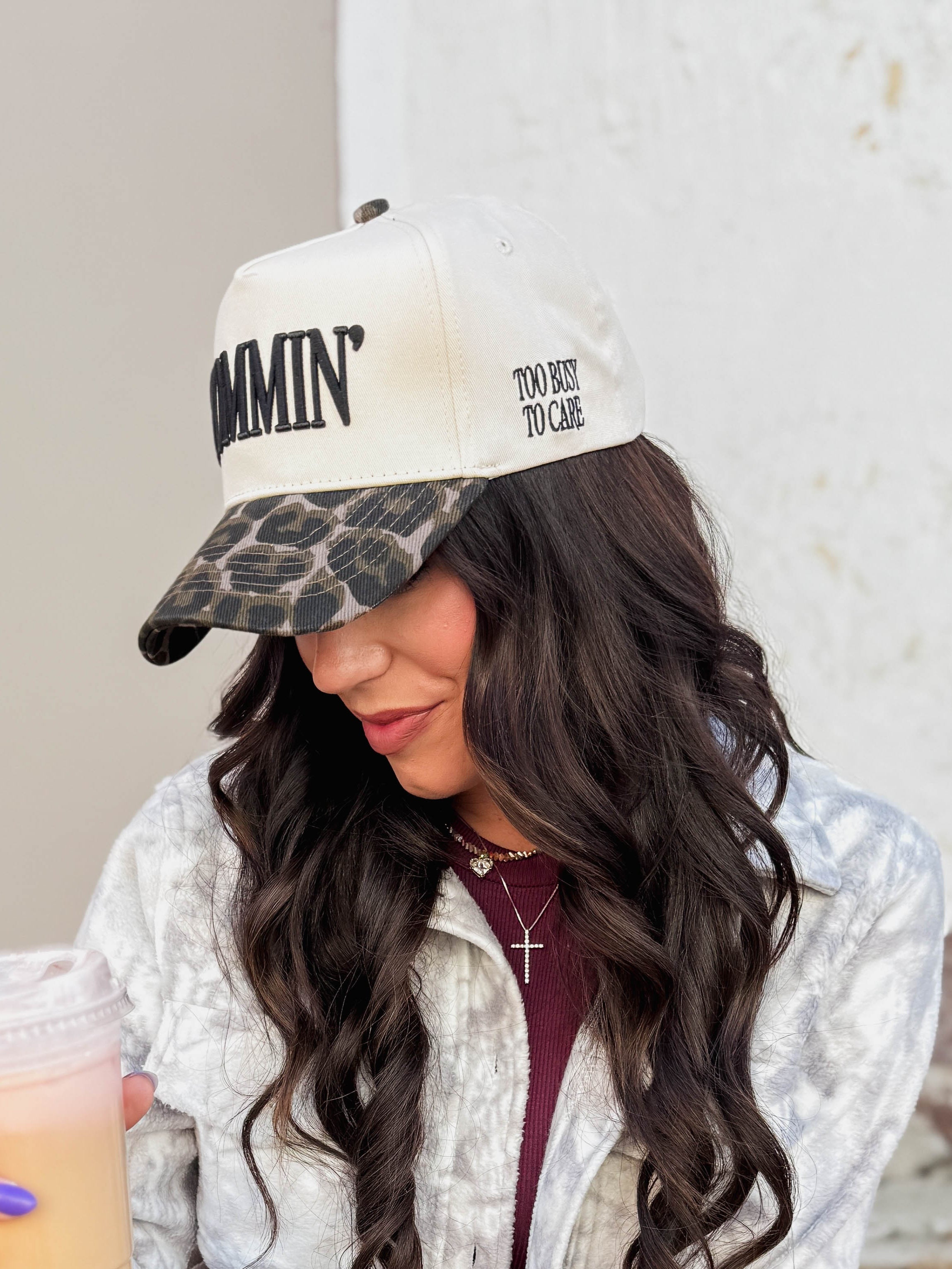 - MOMMIN' - this tone on tone hat is perfect for year round use! - Additional side embroidery that says "Too Busy To Care" - Black Vintage Hat with embroidery on the front + side - Snapback adjustable closure!