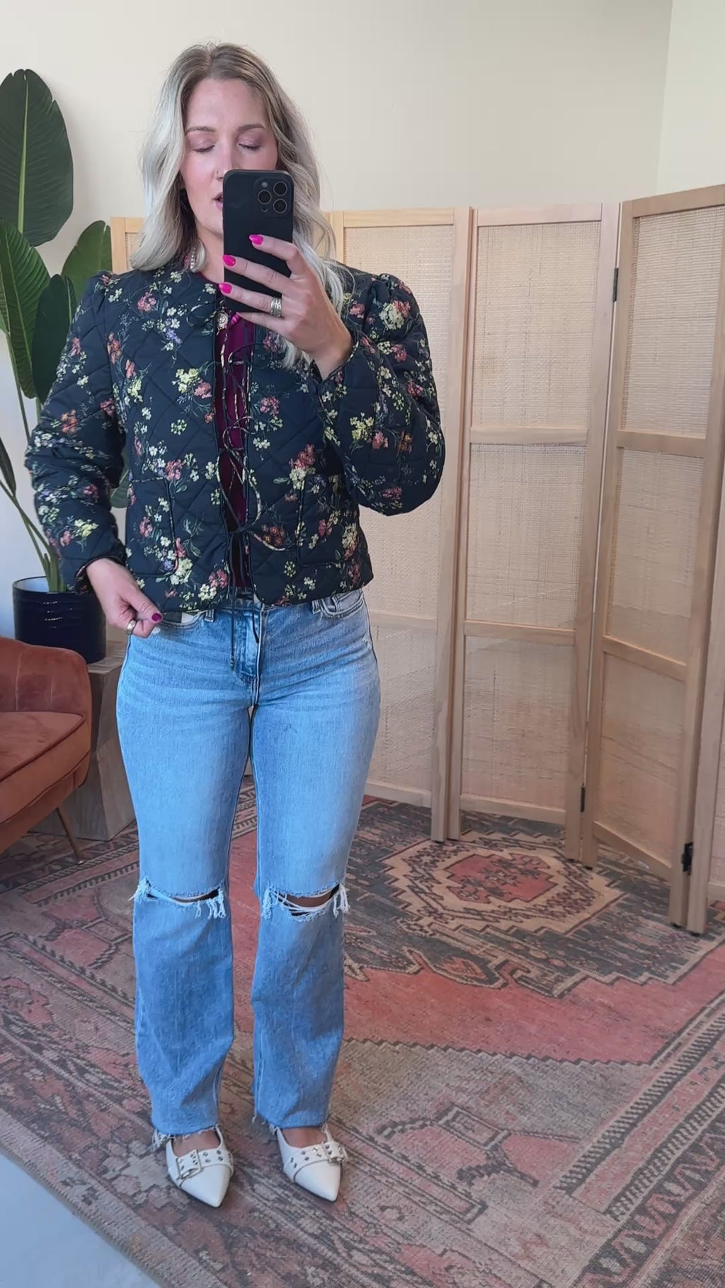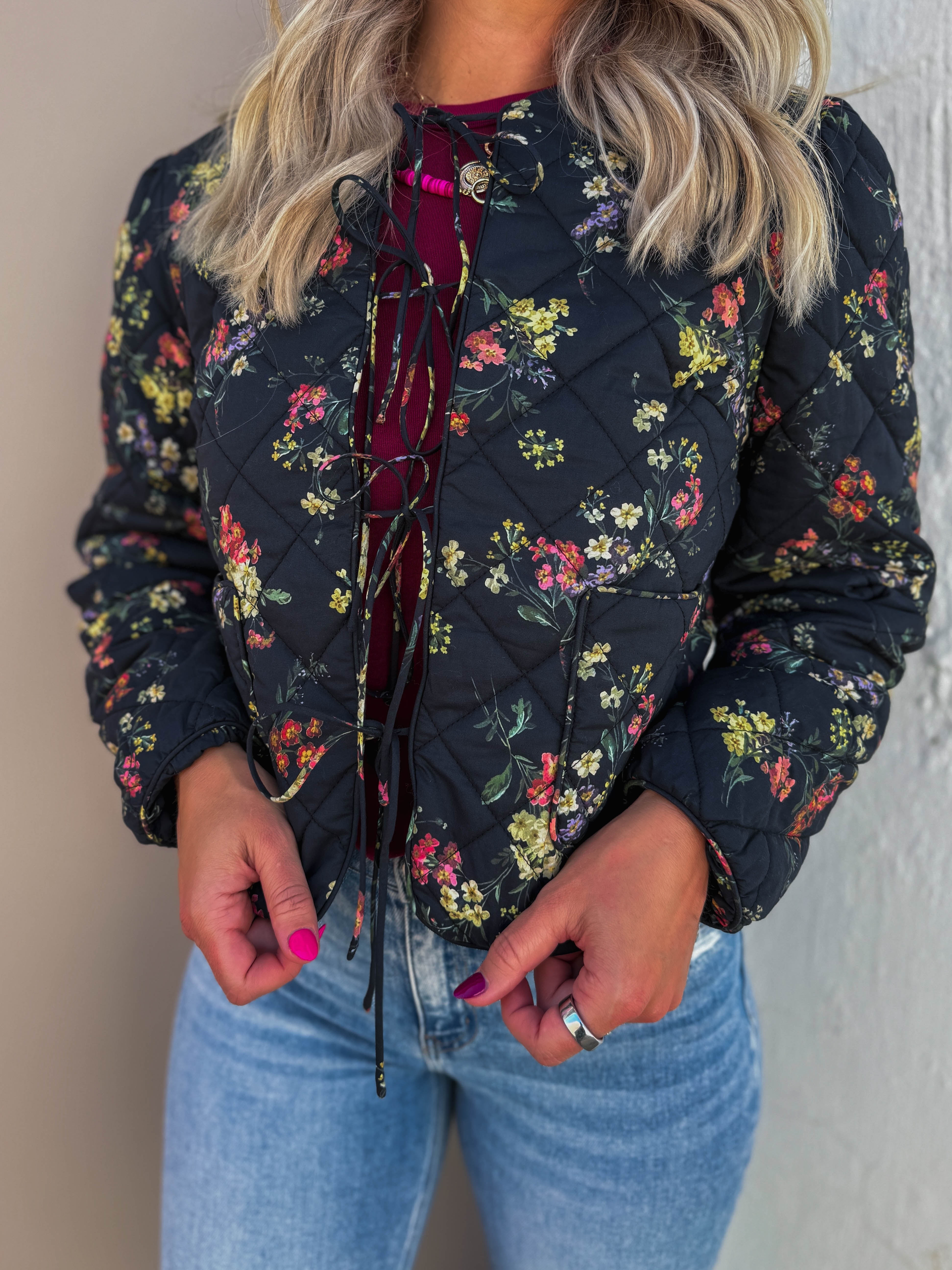 This playful Chelsy Floral Quilted Jacket in Black adds charm to your fall and winter wardrobe. Featuring a cute diamond quilted pattern, long sleeves, and a self bow tie front closure, it's perfect from work to weekend. Front patch pockets add practical flair to this fun floral print jacket.