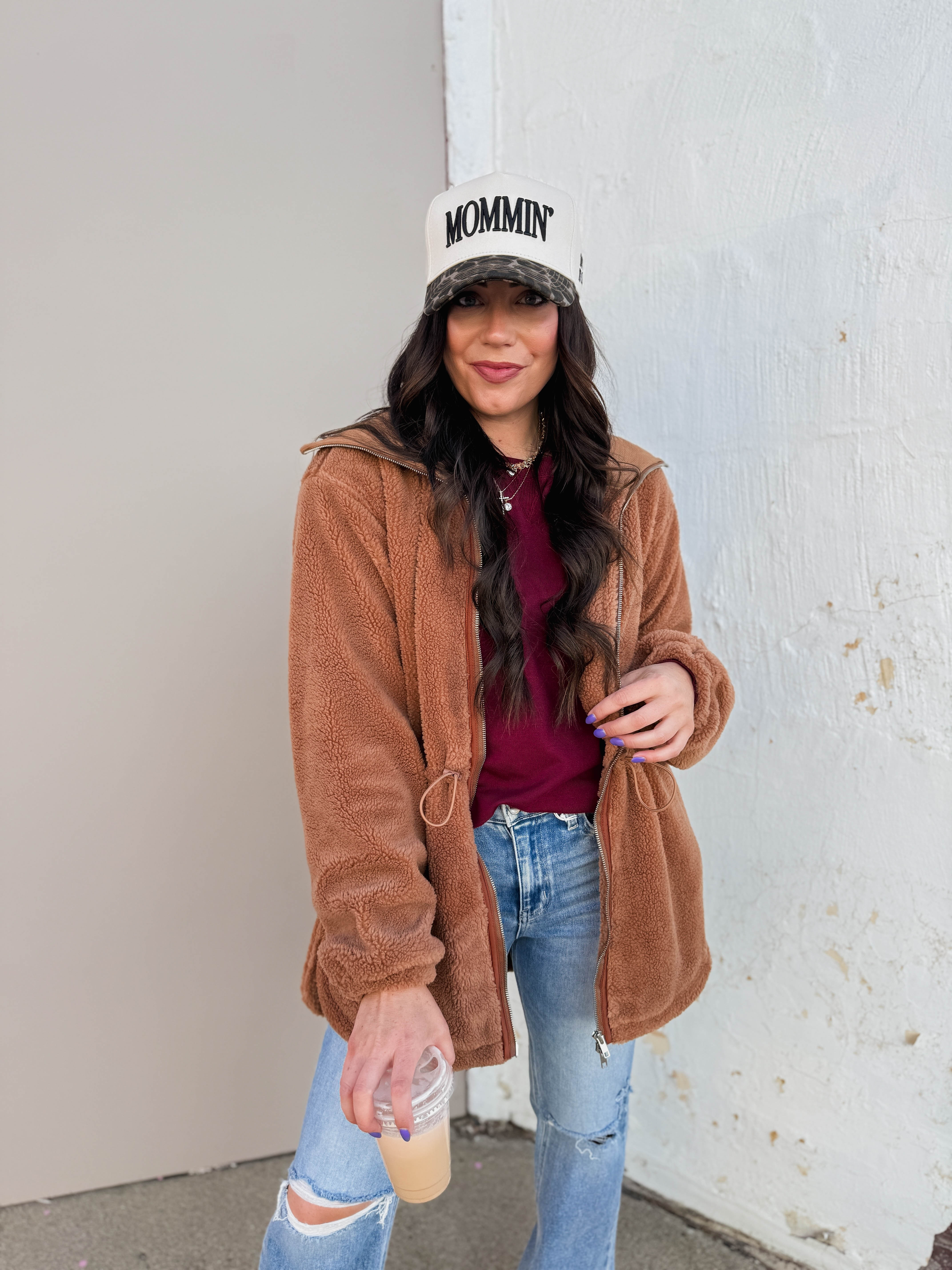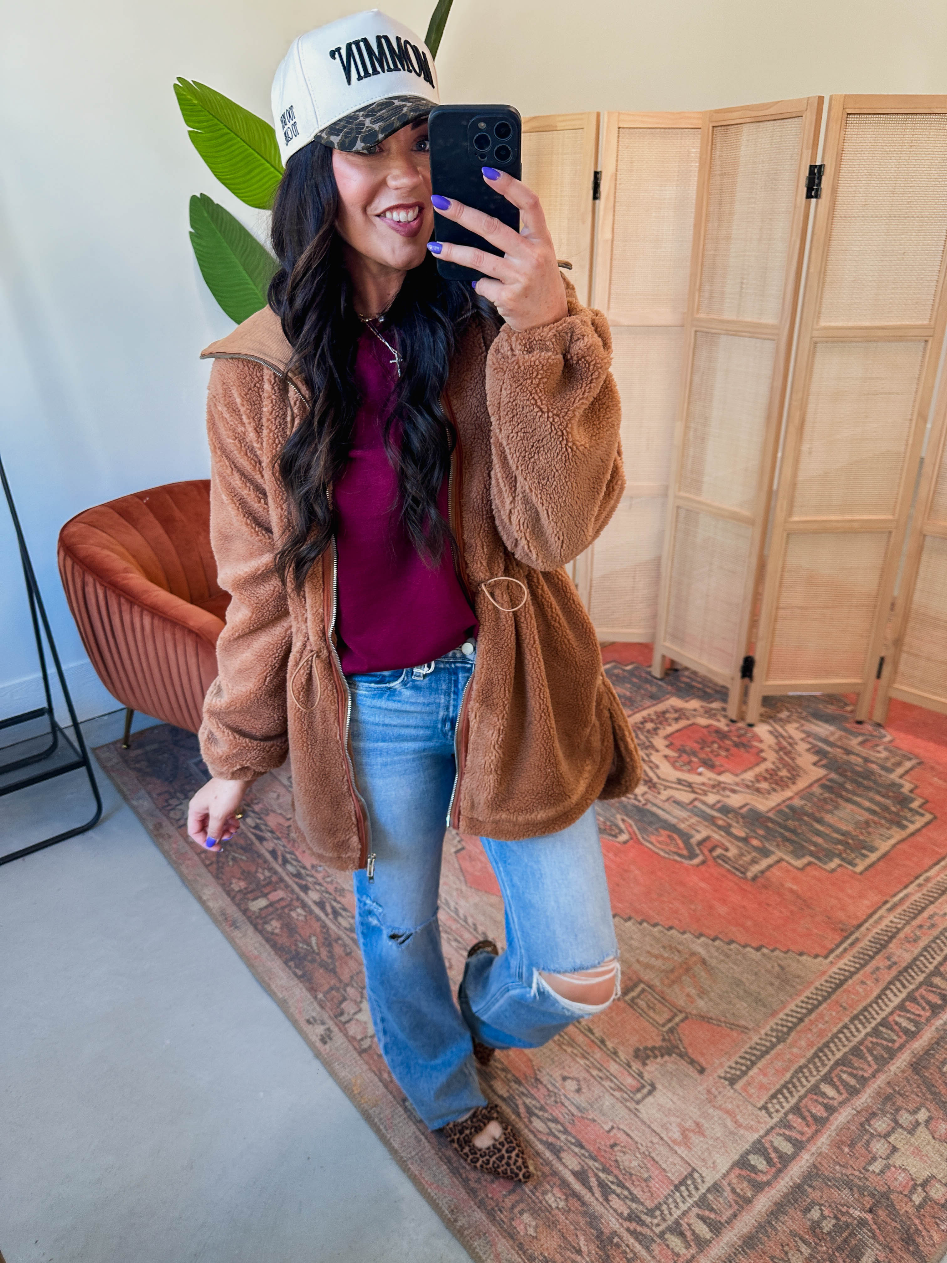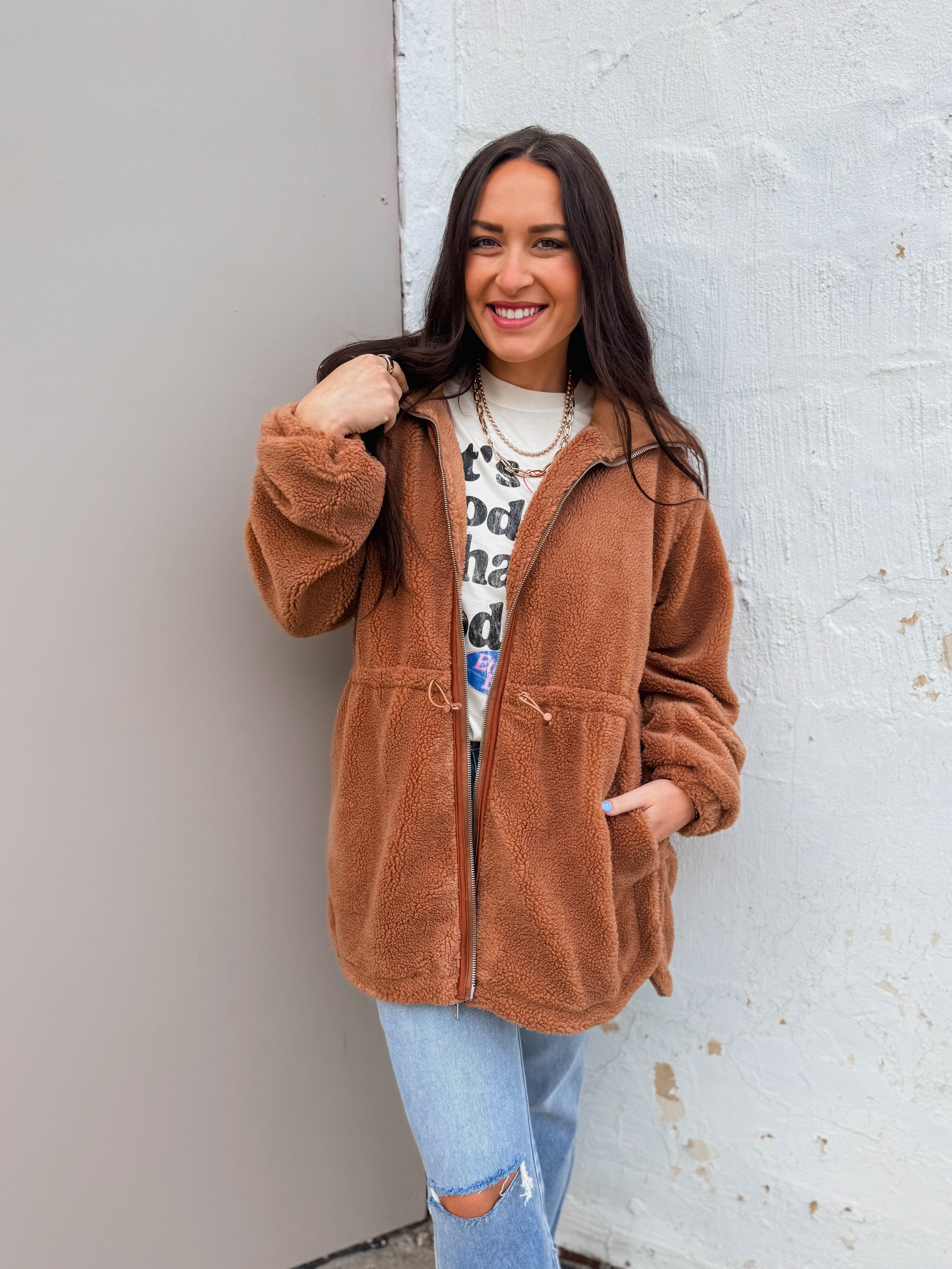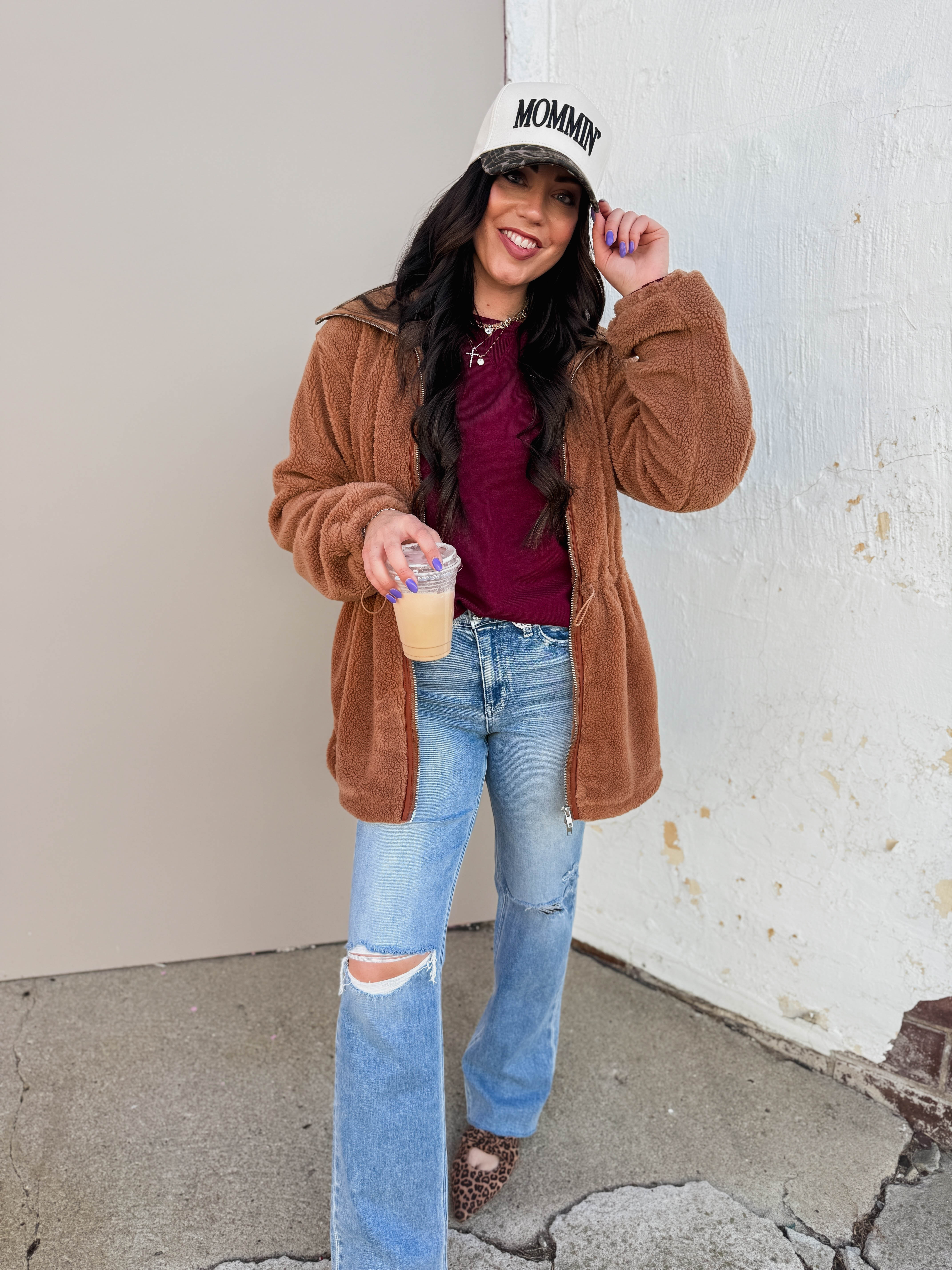 Cozy up in the Codi Sherpa Jacket! With its oversized ribbed collar, cinched waist, and curved hem, it’s the perfect comfy layering piece for fall. Slip on the long sleeves, zip up the two-way front, and stash your hands in the side pockets—easy style meets all-day comfort.