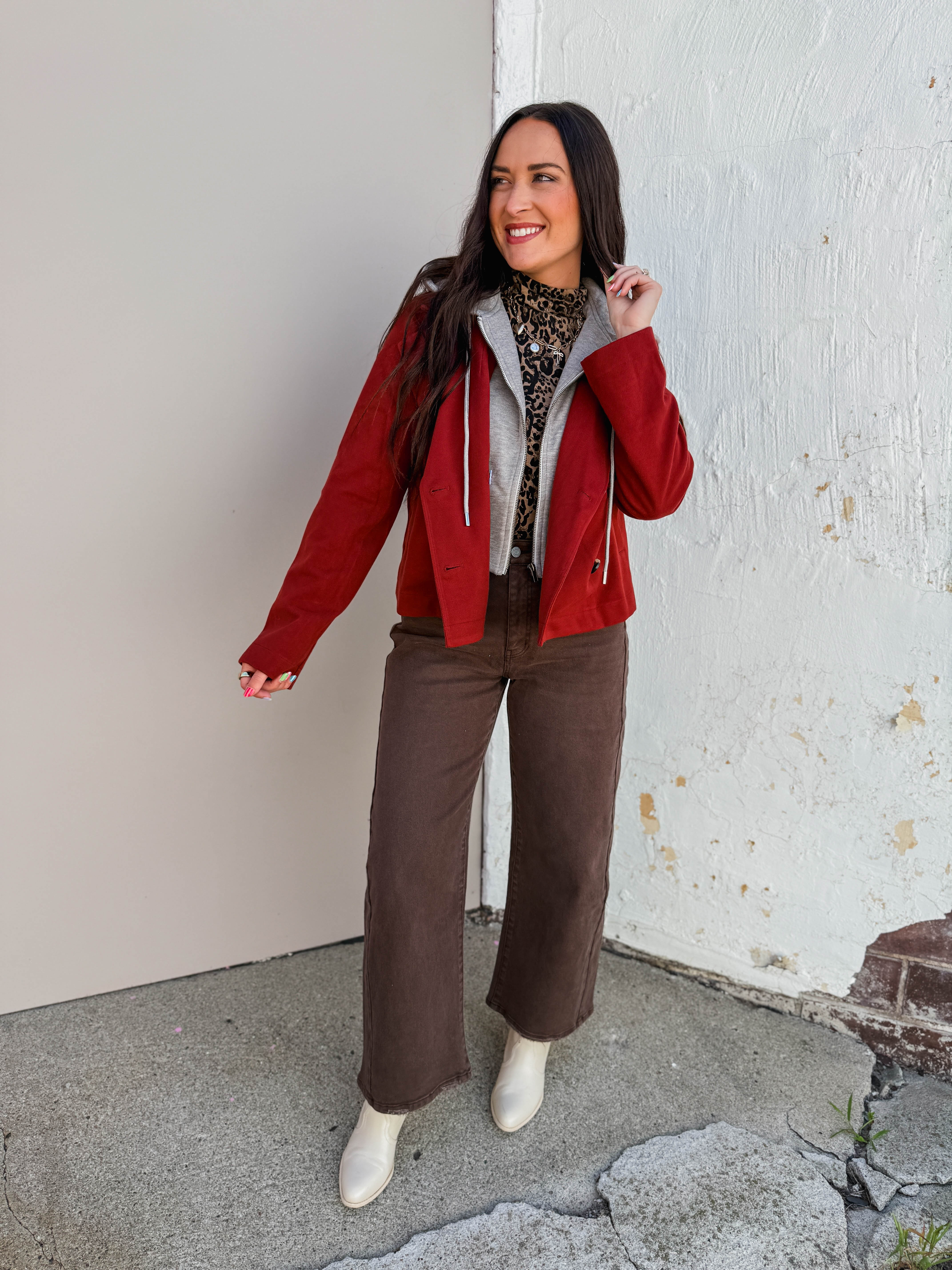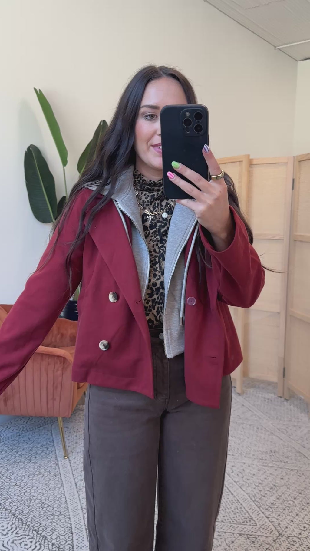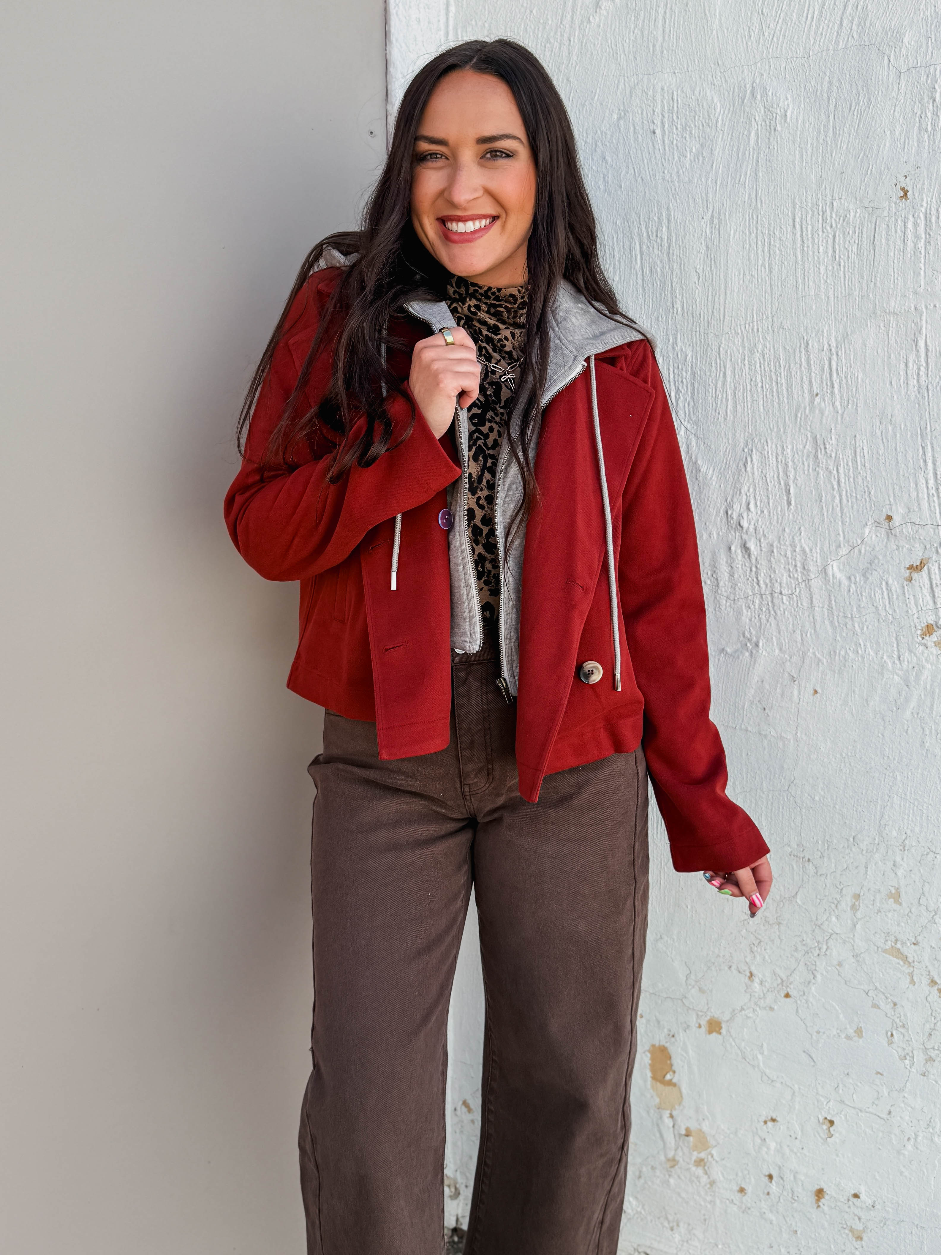 Meet the Helen Jacket—a cozy twofer hoodie with a collared neckline and button front. Long sleeves and handy side pockets make it perfect for layering through fall’s chill. Easy, comfy, and ready for anything!