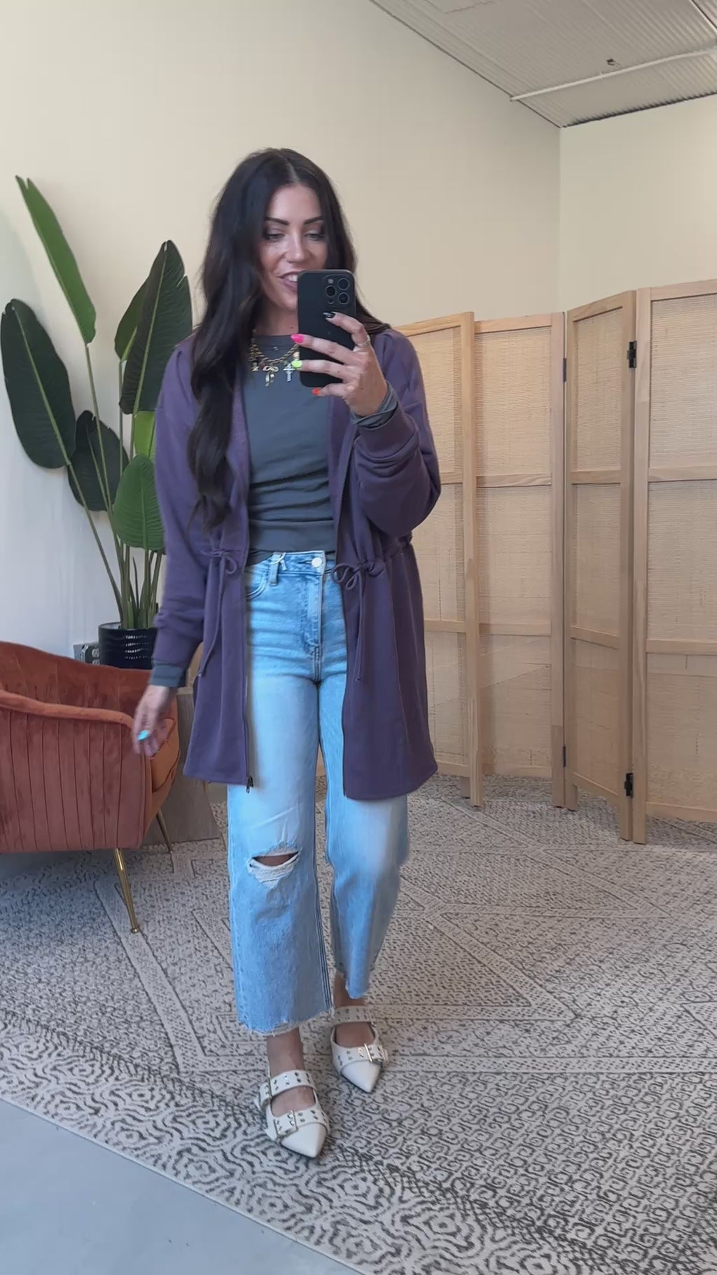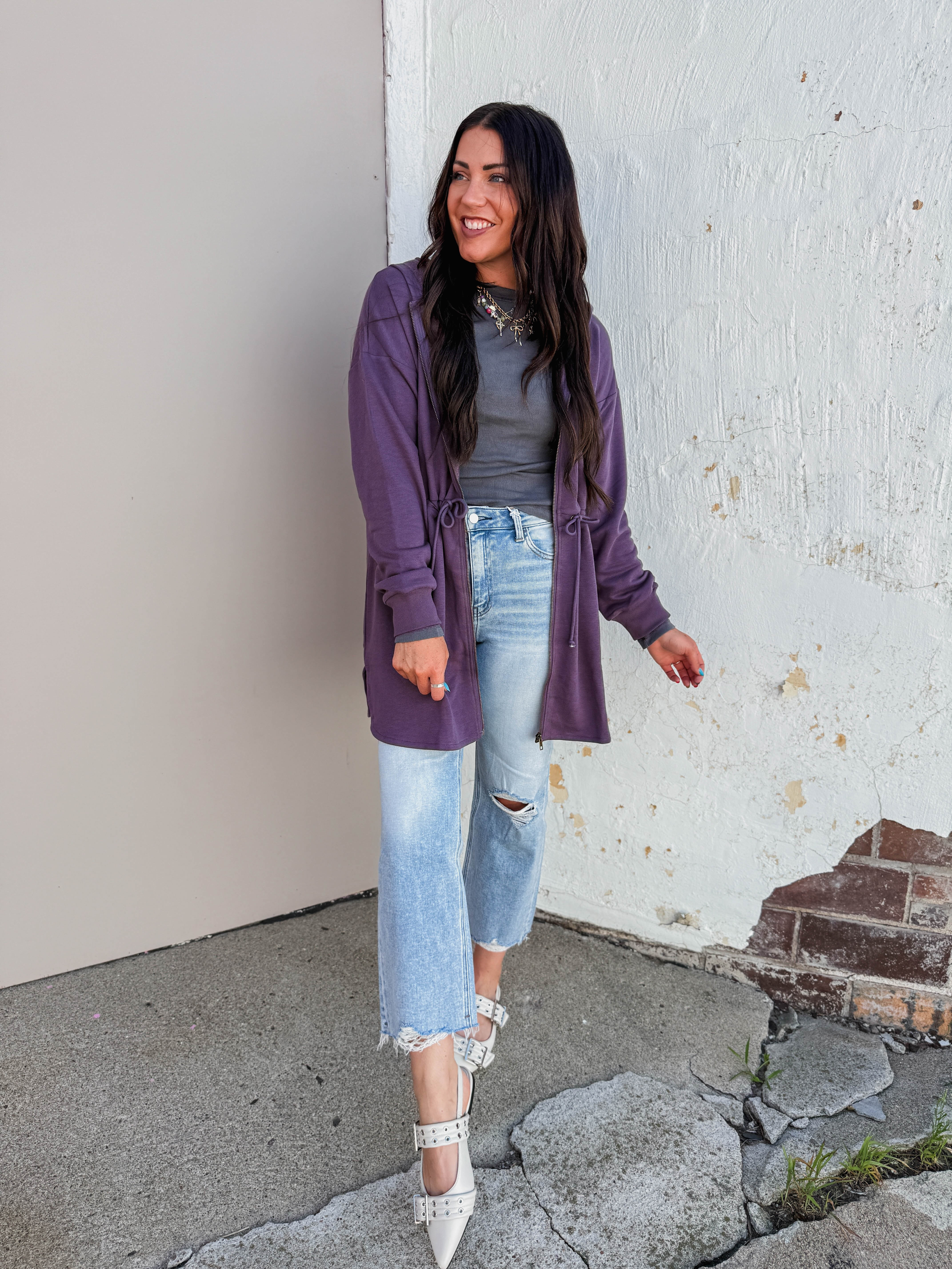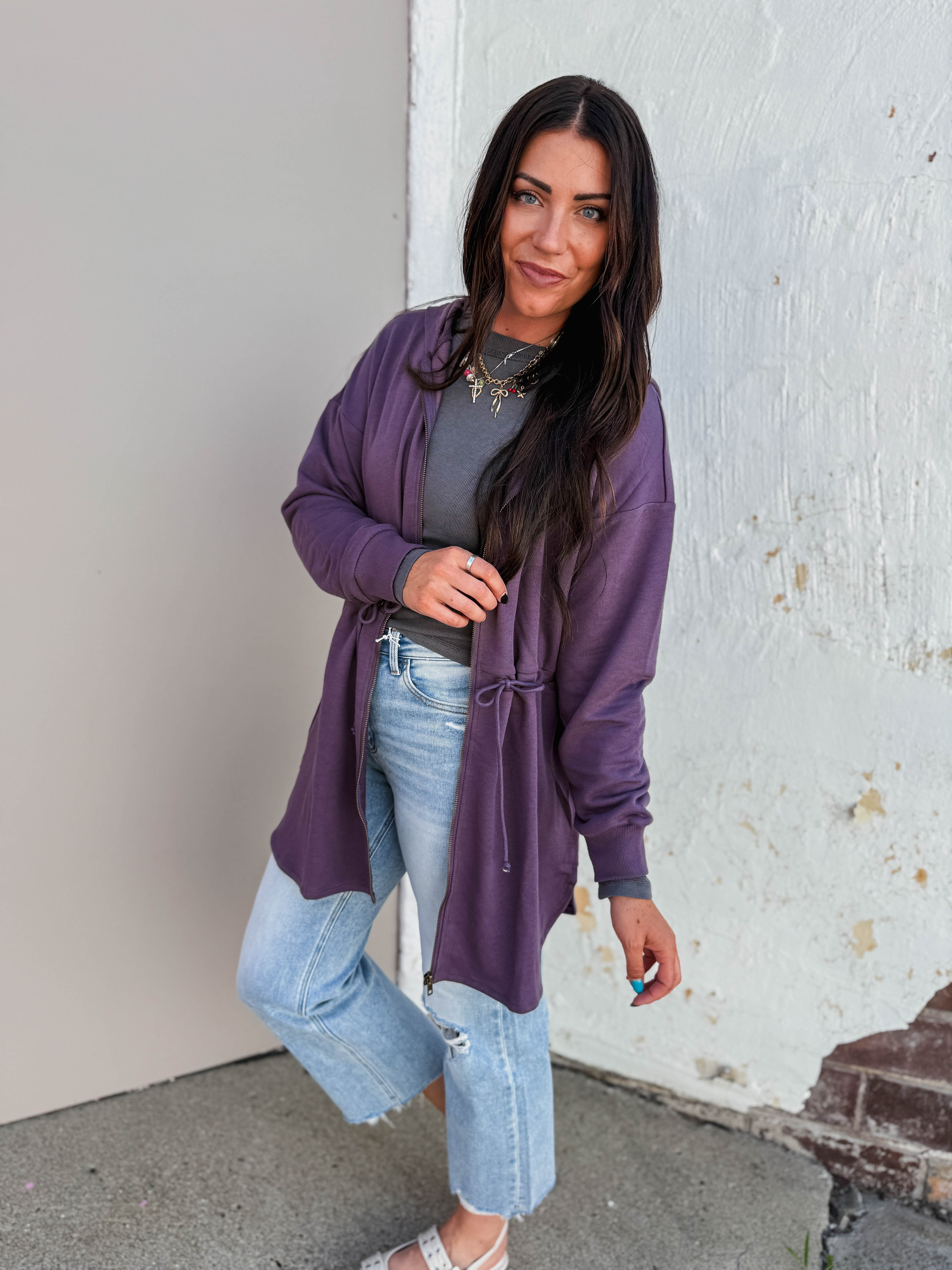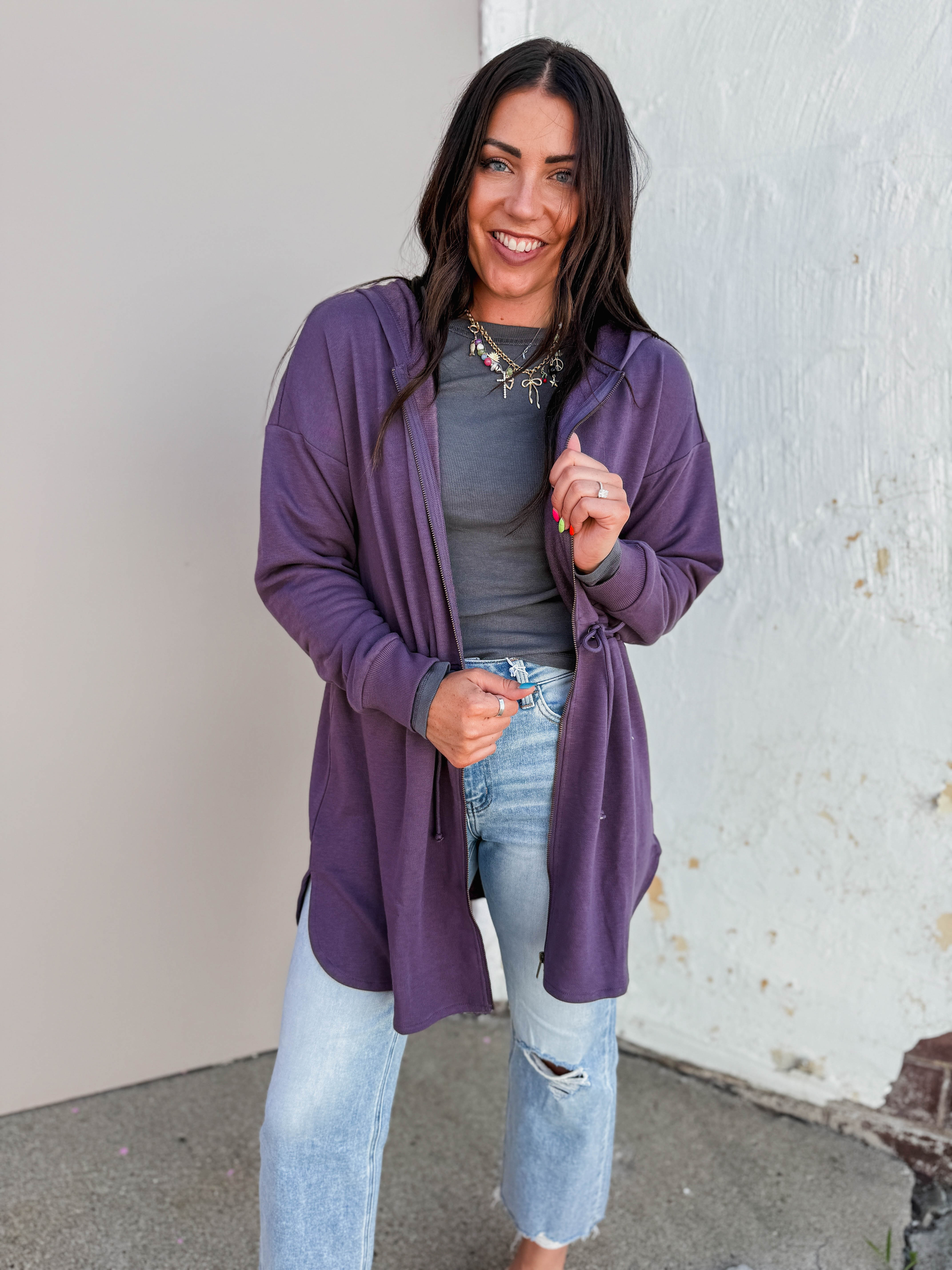 Stay cozy all day with the Jamie Hooded Jacket in Purple. Featuring a drawstring waist for a perfect fit, long sleeves, and a zip front closure, this French terry hoodie effortlessly transitions from work to weekend. Soft, comfy, and ready for anything!