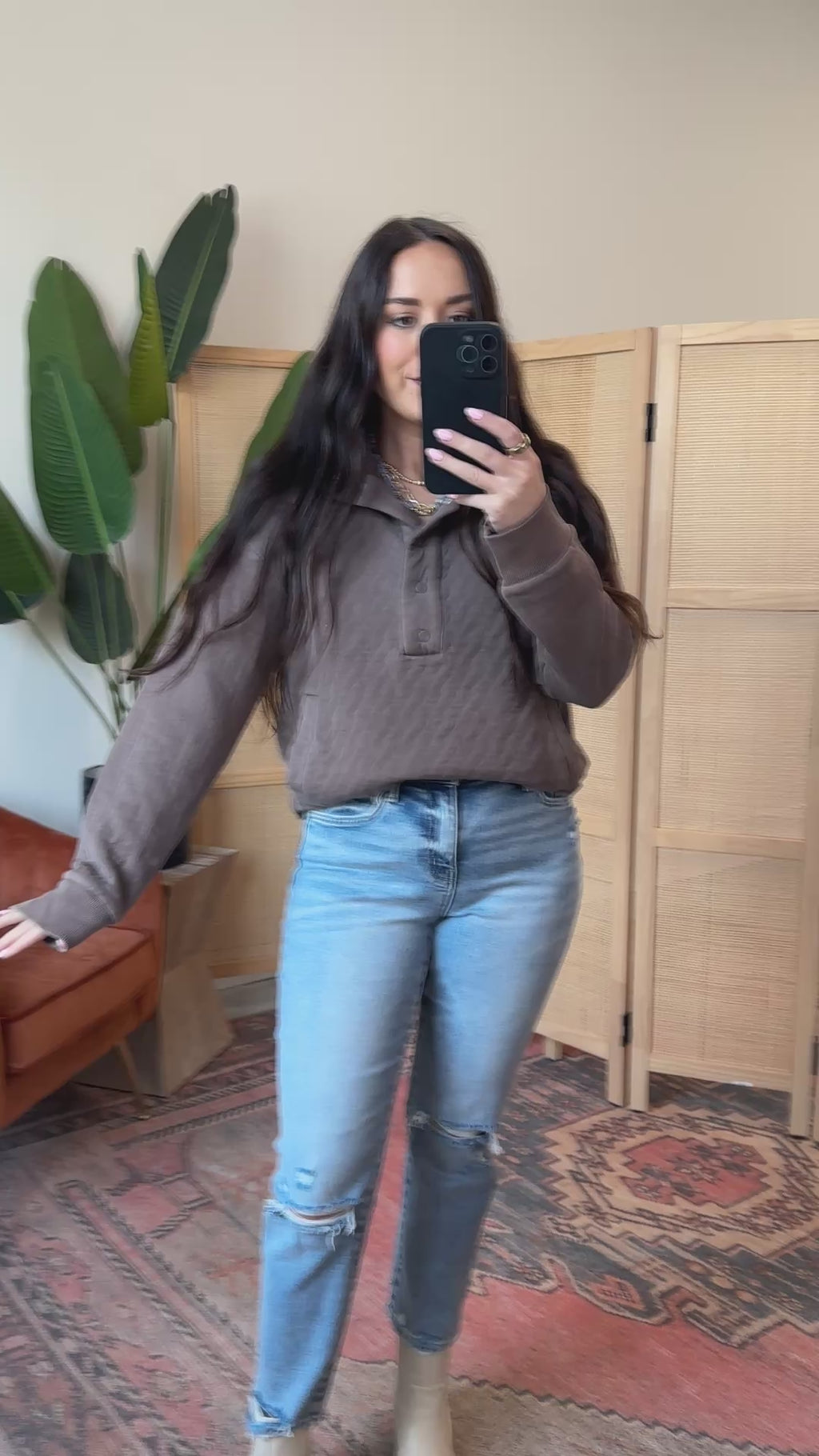 Cozy up in the Kyra Pullover, featuring a collared neckline and half snap buttons for easy style. Its textured fabric and kangaroo pocket keep it cute and comfy, perfect for crisp fall and chilly winter days.