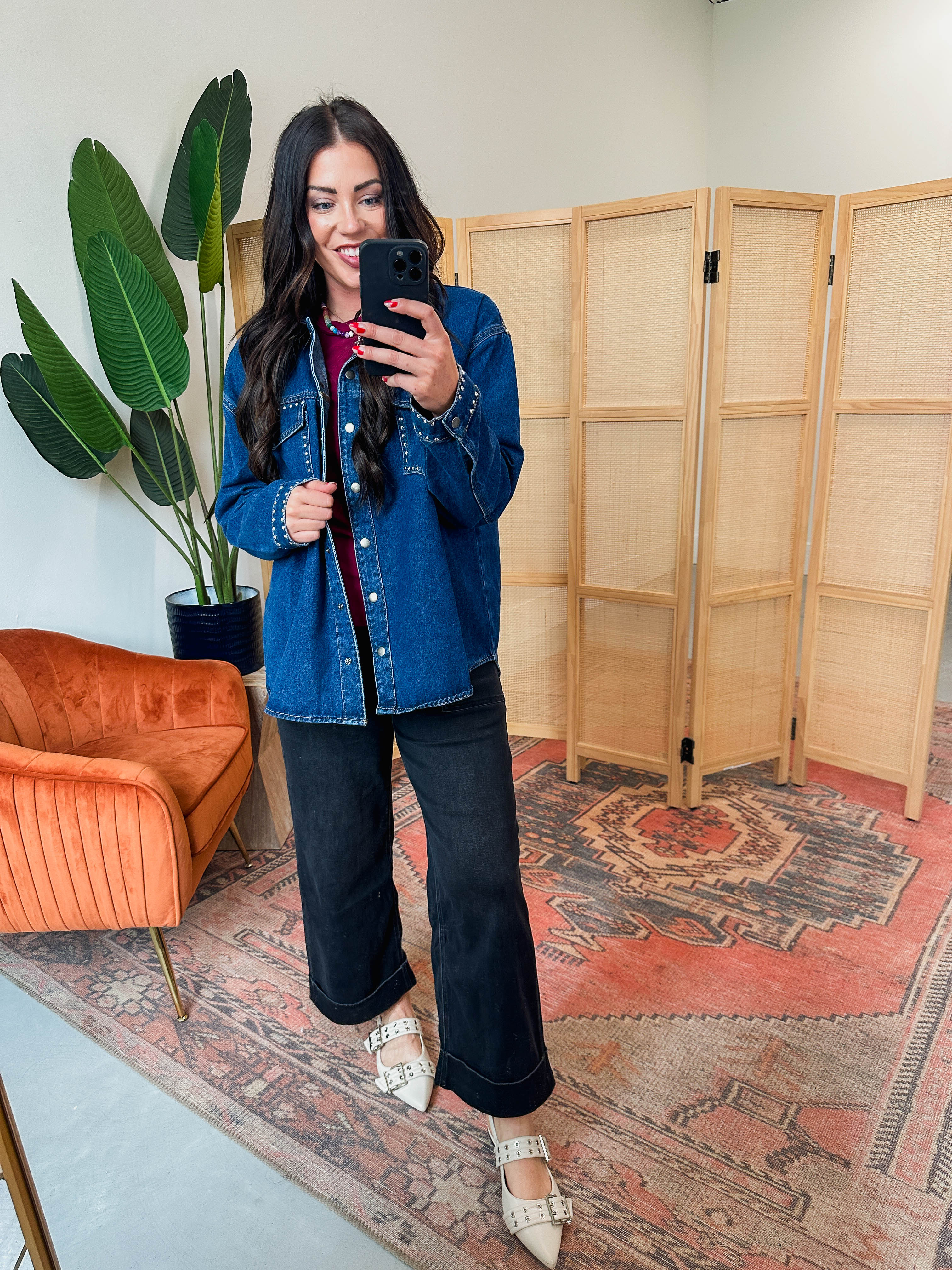 Make a standout statement with the Nora Studded Denim Jacket. Featuring a classic collared neckline, long sleeves, and front button closure, this jacket is dressed up with edgy studded details. Perfect for concerts, rodeos, or adding a little attitude to your everyday look.