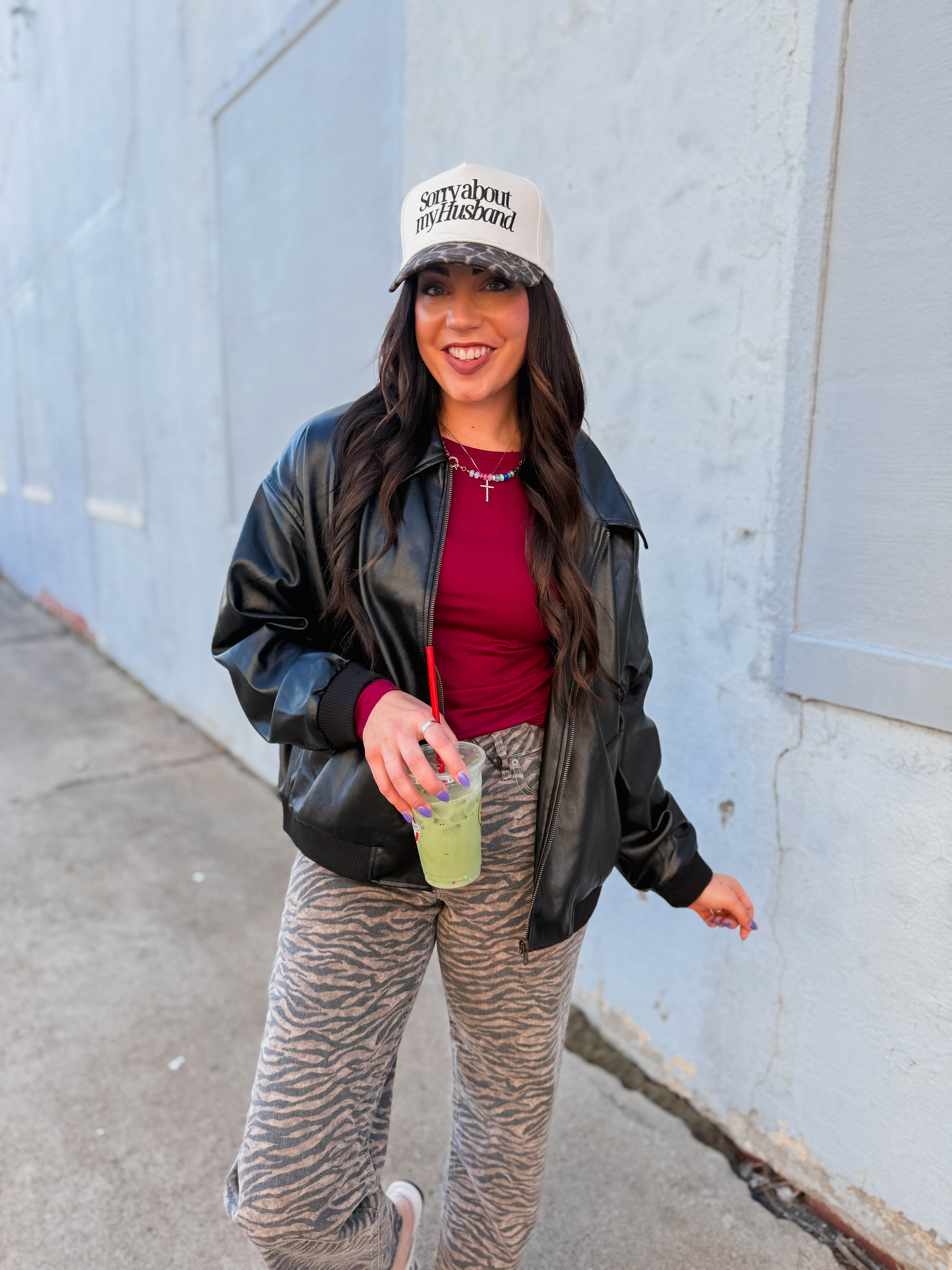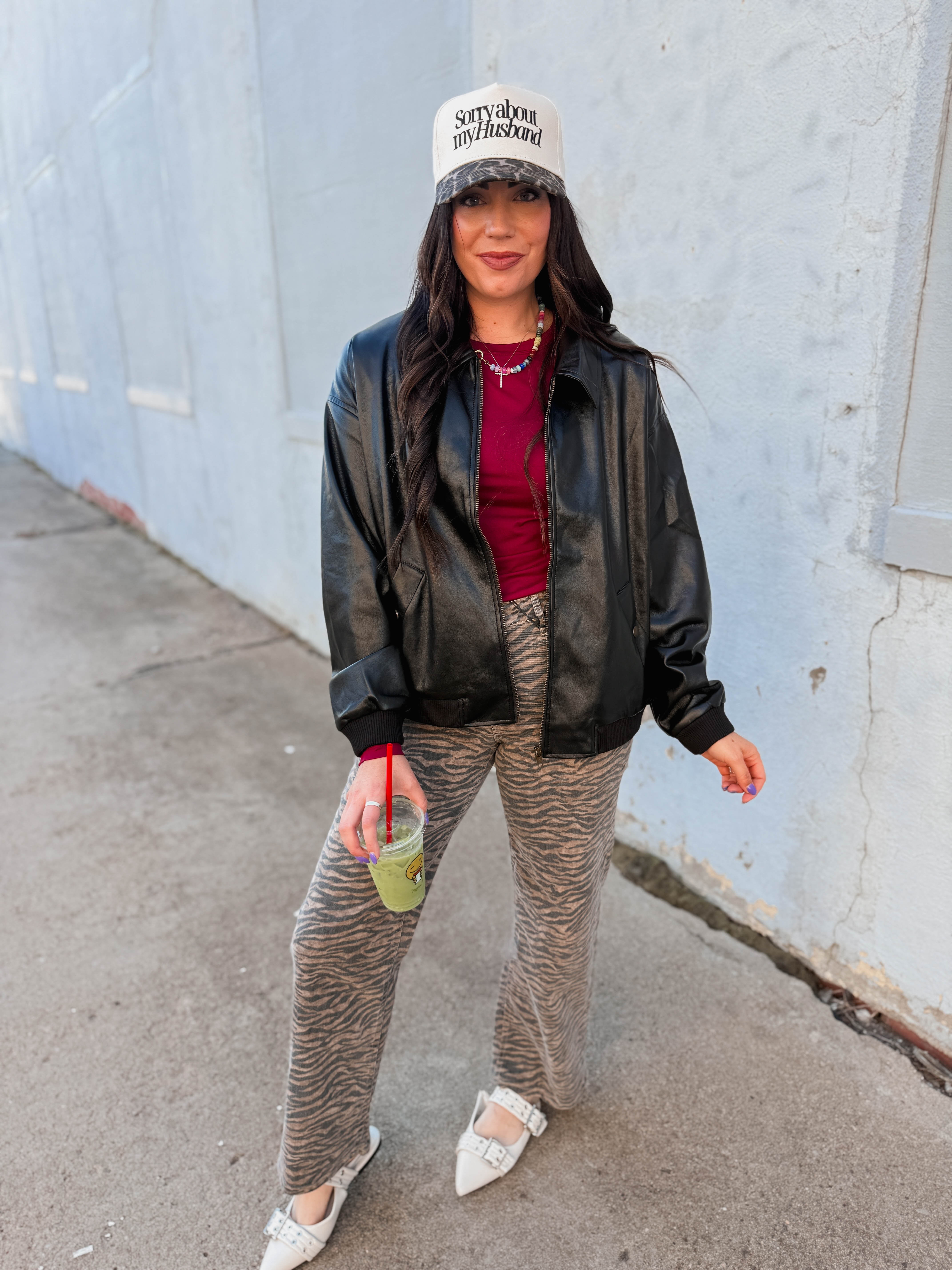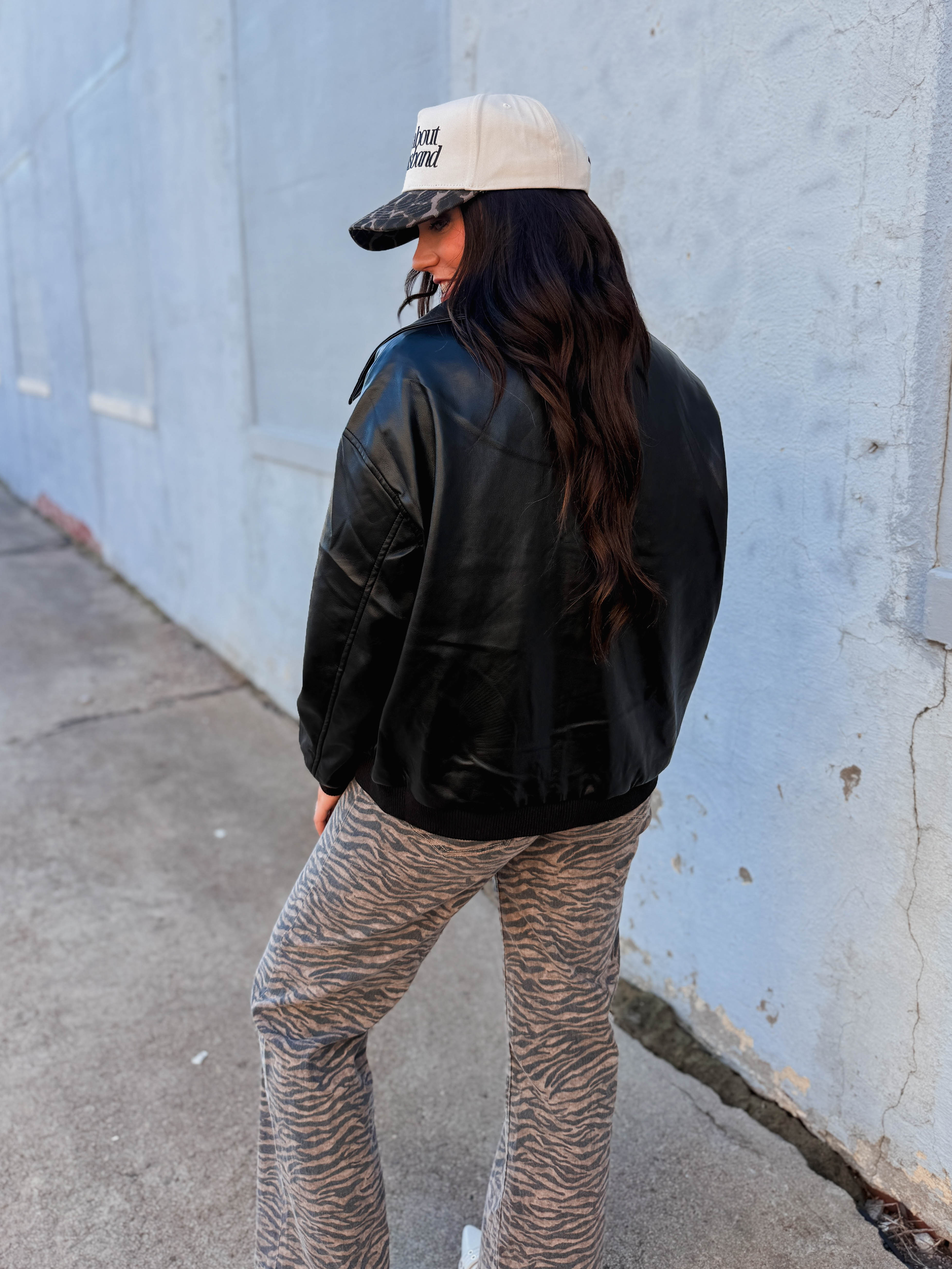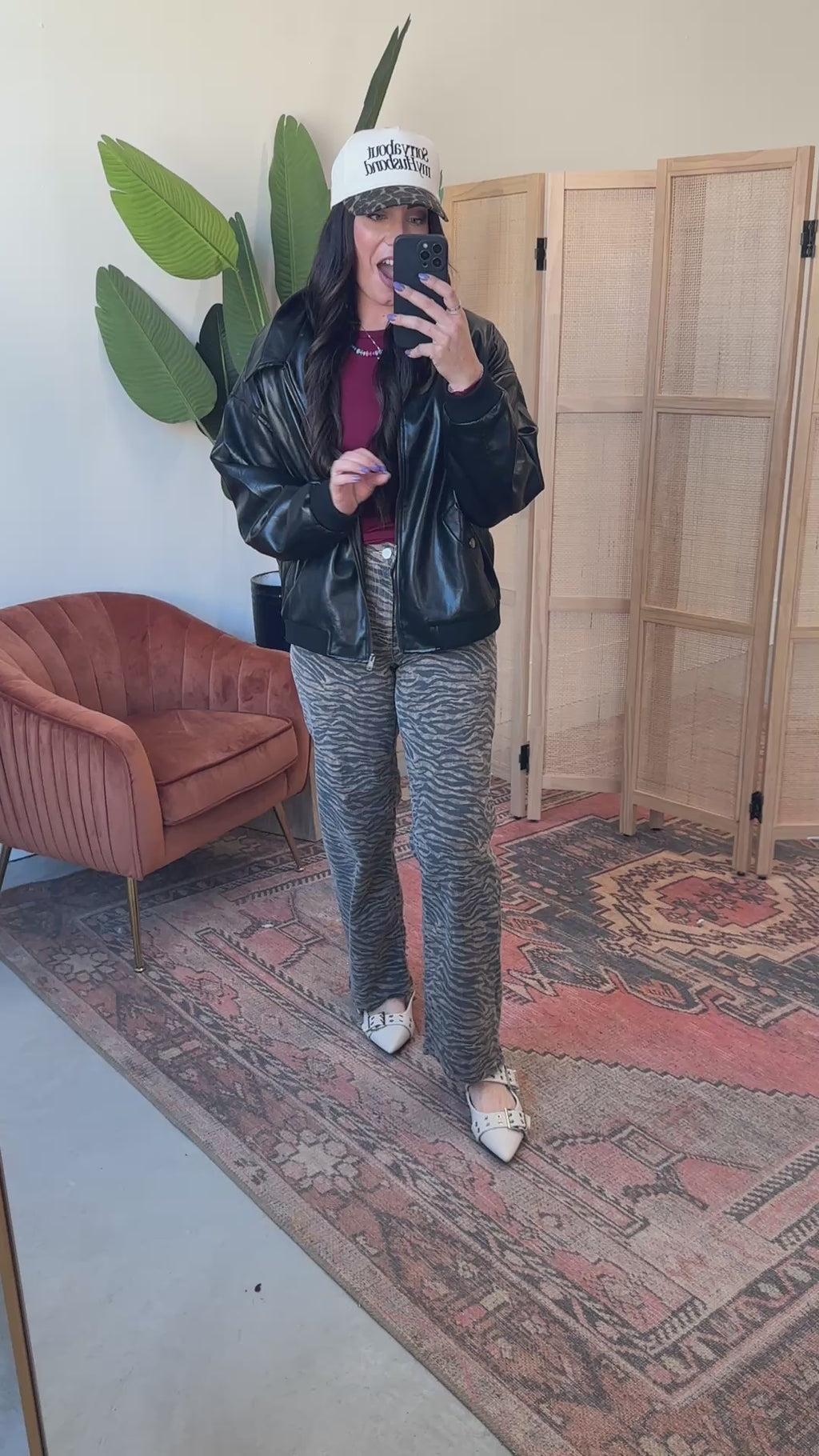 The On Trend Leather Jacket in sleek pleather adds instant edge to any look. With a cool collared neckline, front zip, and handy pockets, it’s relaxed yet stylish—perfect for year-round fun and effortless outfit upgrades.