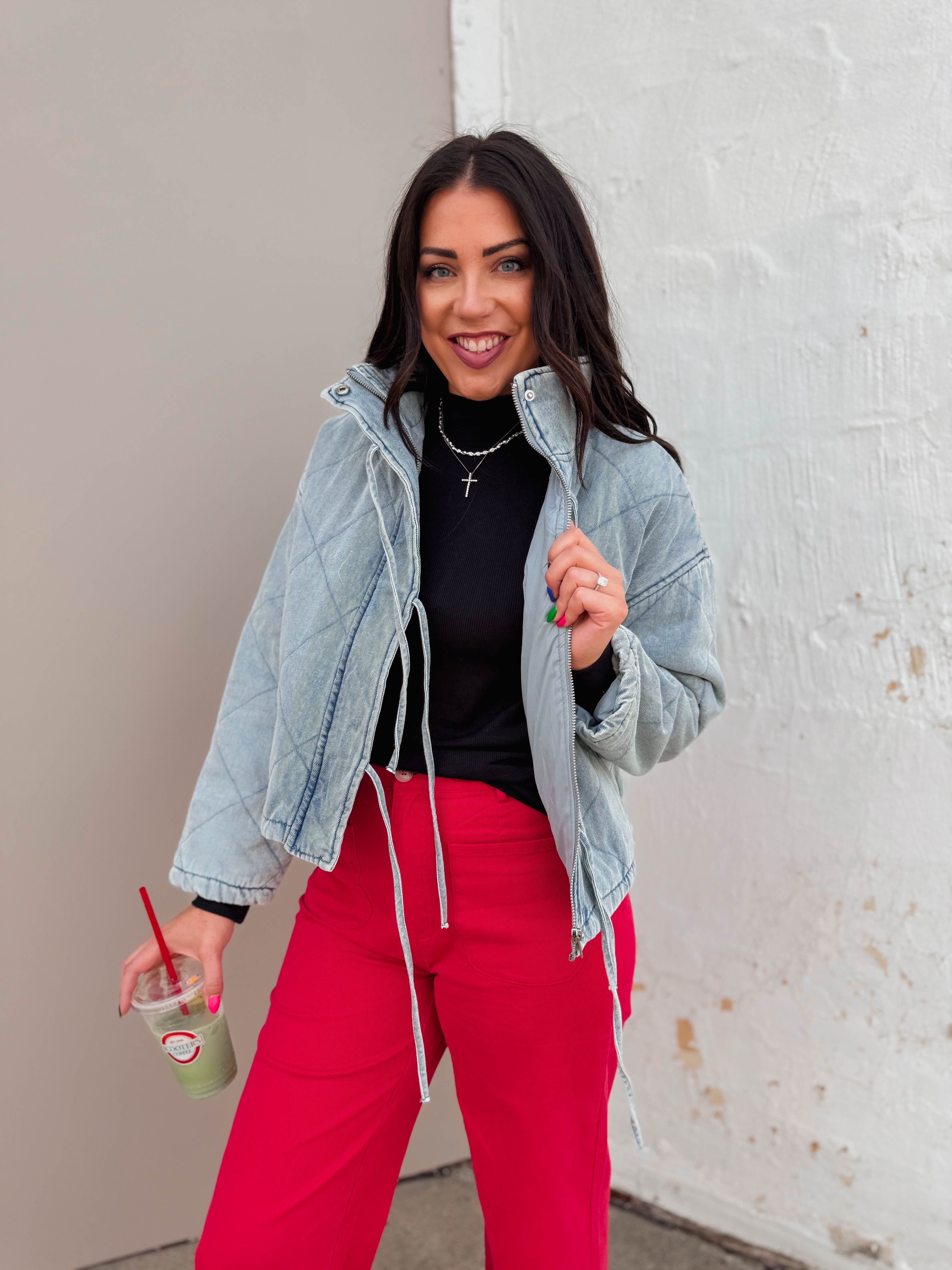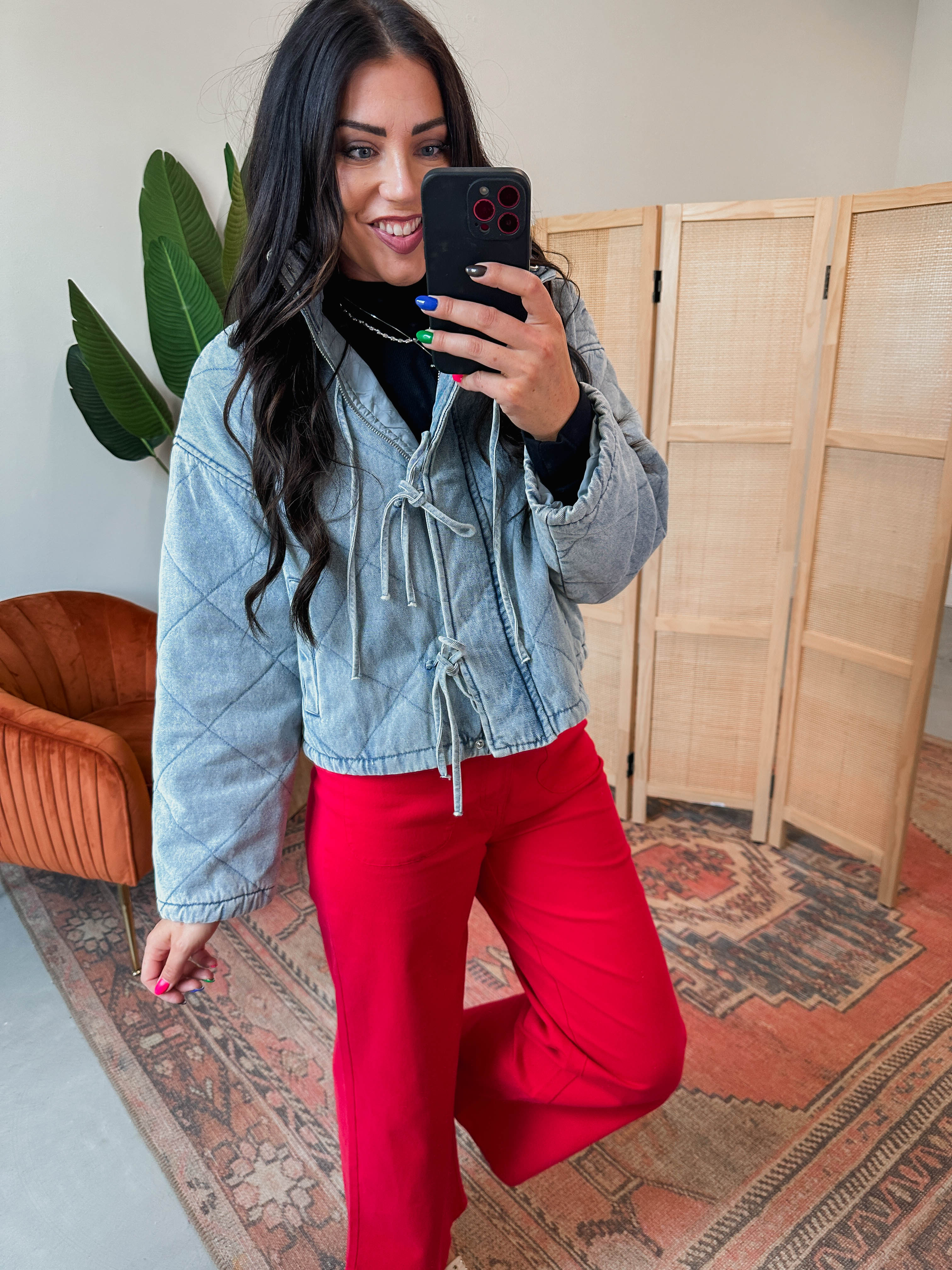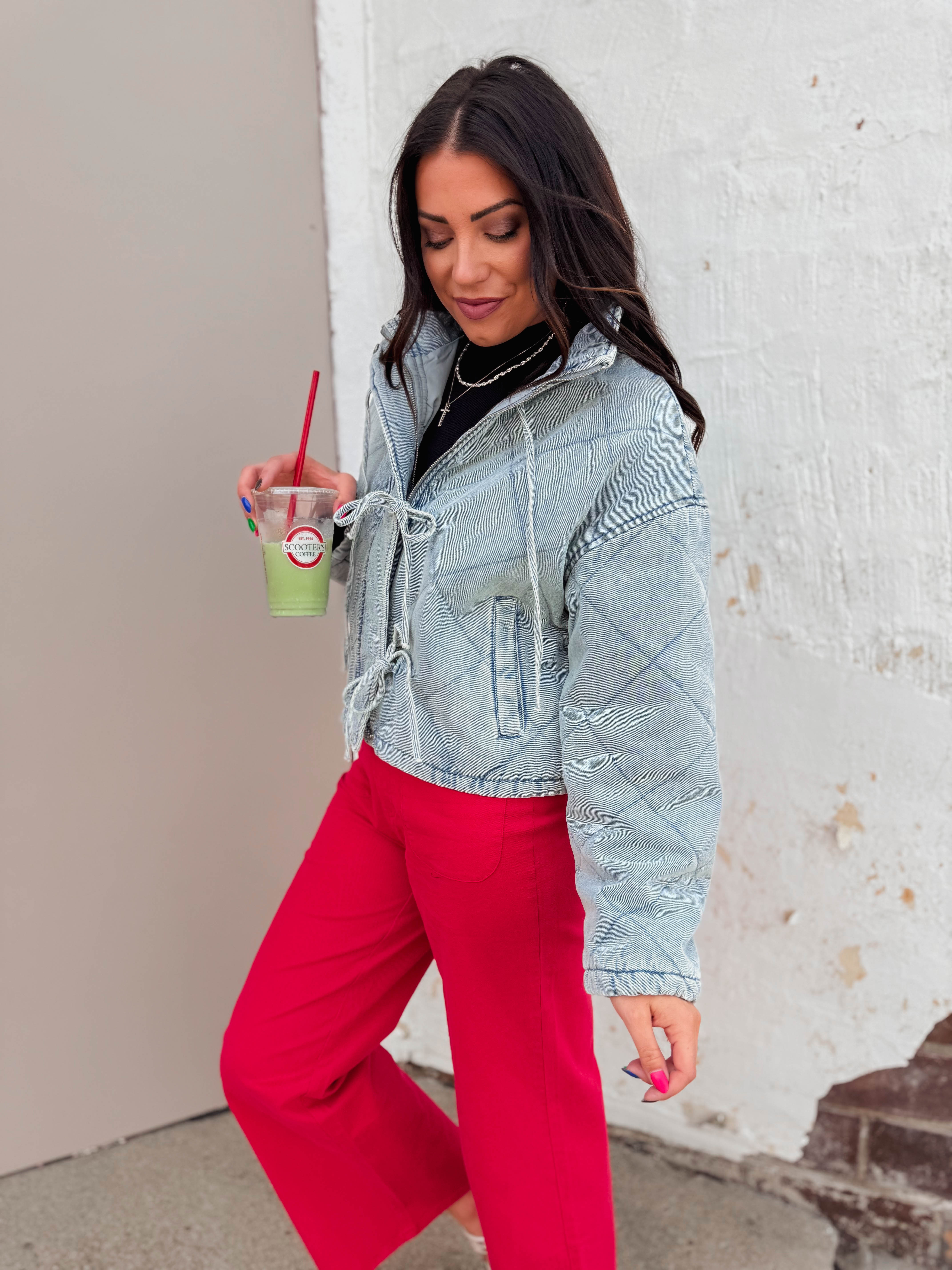 Stay cozy and stylish in the Rhea Quilted Denim Jacket. Featuring a classic collared neckline, playful tie-front closures, and handy side pockets, it’s the perfect fall and winter companion. The quilted design adds extra warmth with a cute twist!