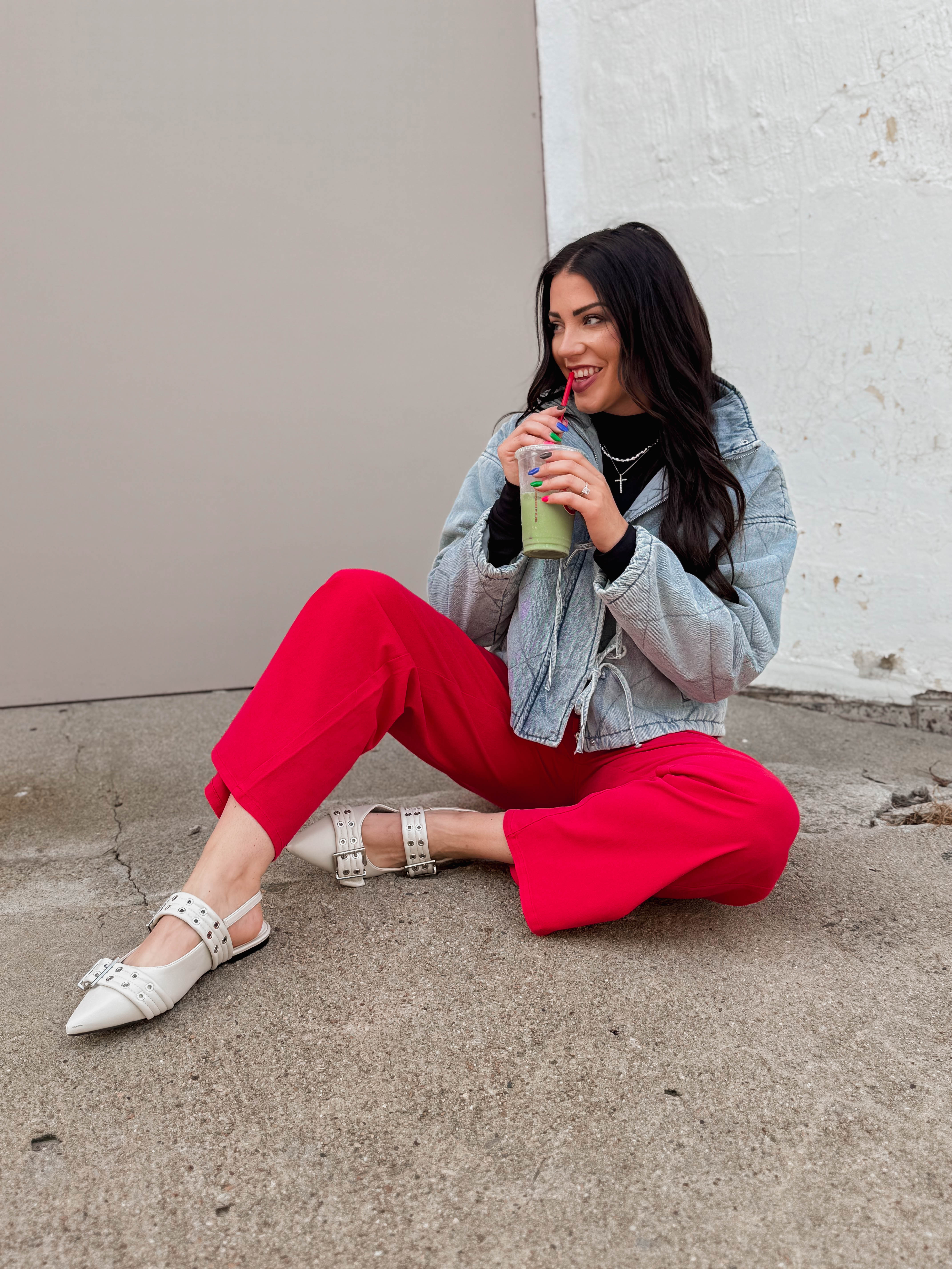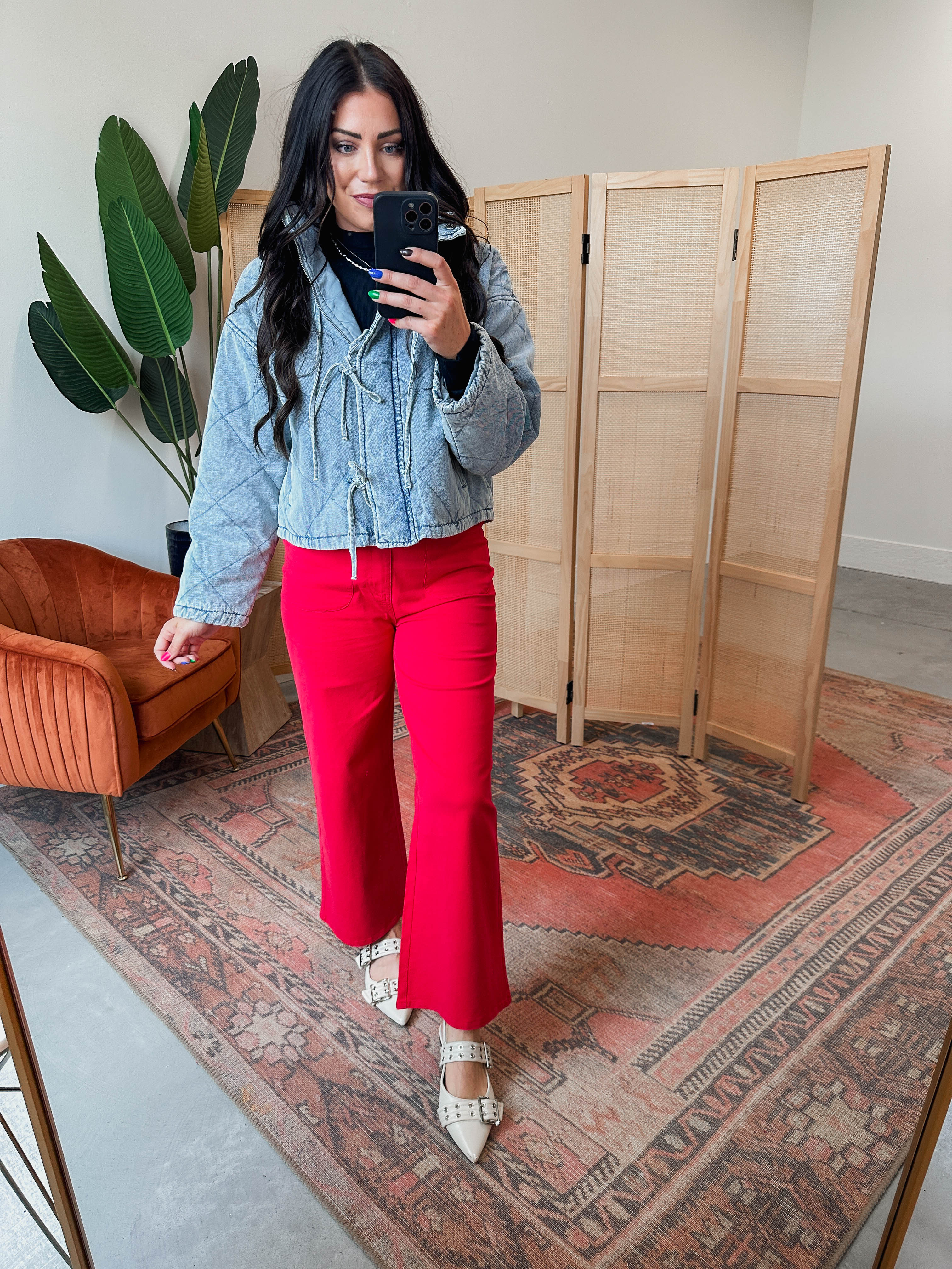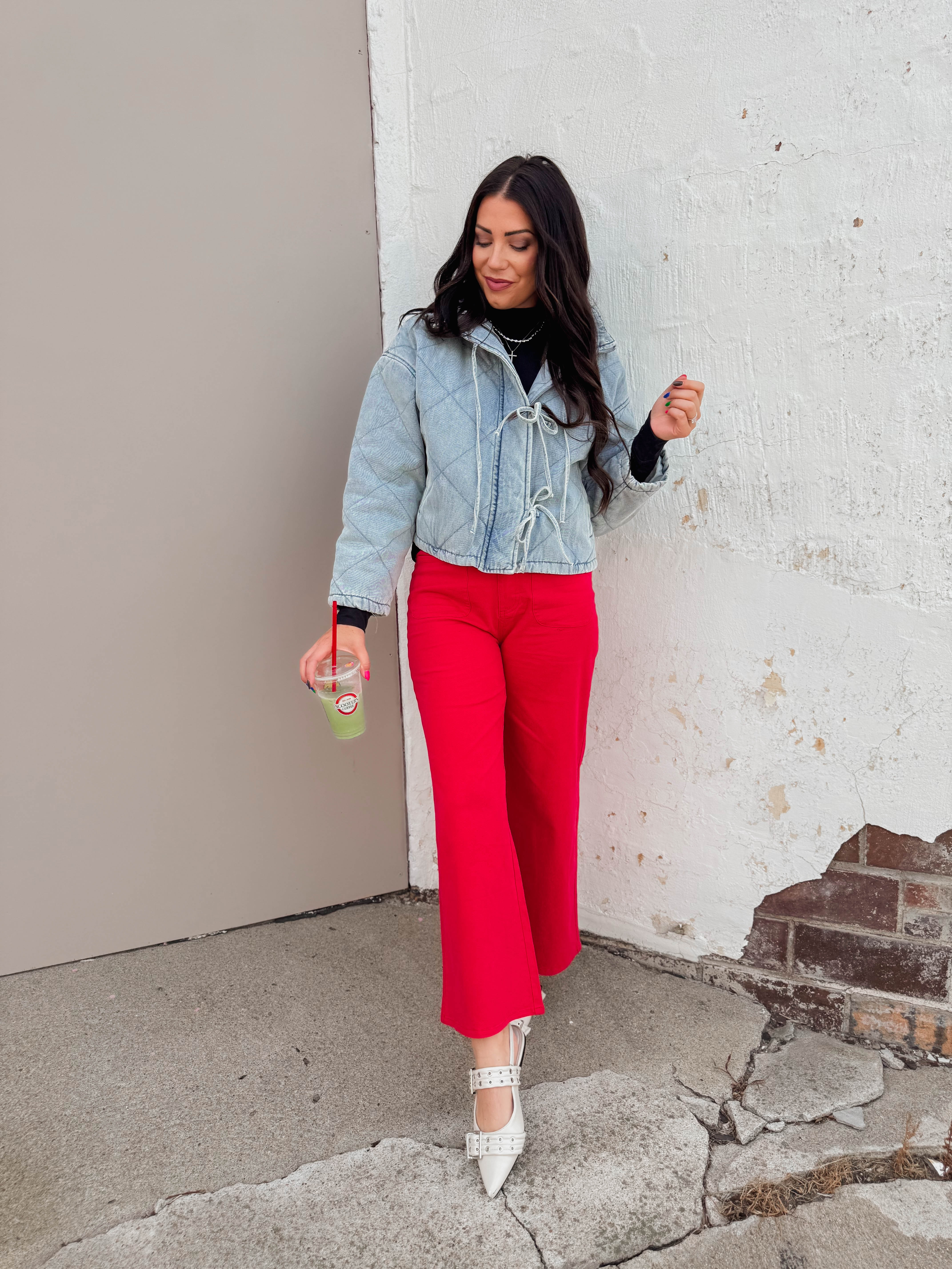Stay cozy and stylish in the Rhea Quilted Denim Jacket. Featuring a classic collared neckline, playful tie-front closures, and handy side pockets, it’s the perfect fall and winter companion. The quilted design adds extra warmth with a cute twist!