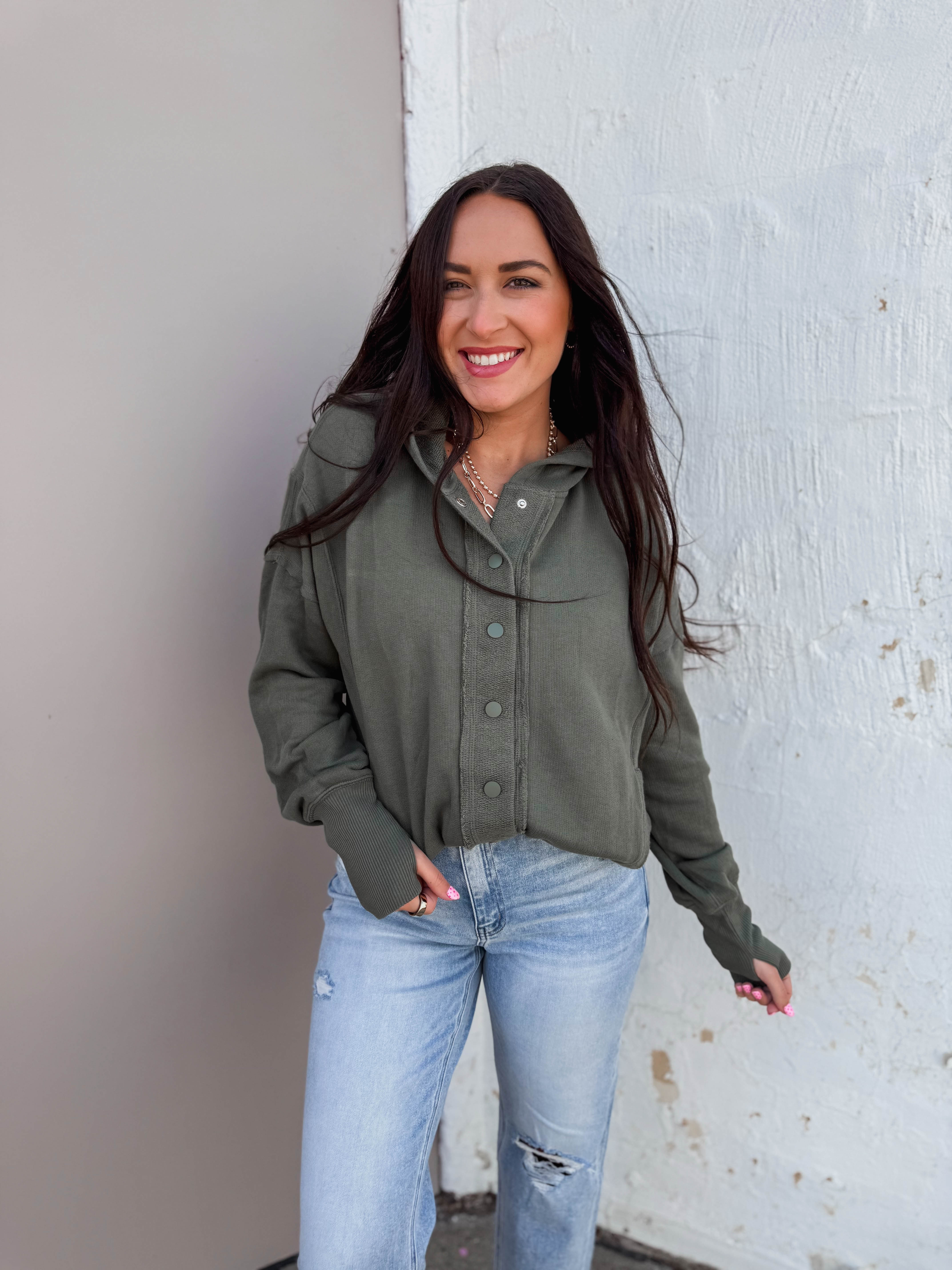Stay cozy from work to weekend in the Rory Jacket in Dark Green. This snap button hoodie with long sleeves and handy side pockets is your go-to for laid-back, comfy vibes all day long.
