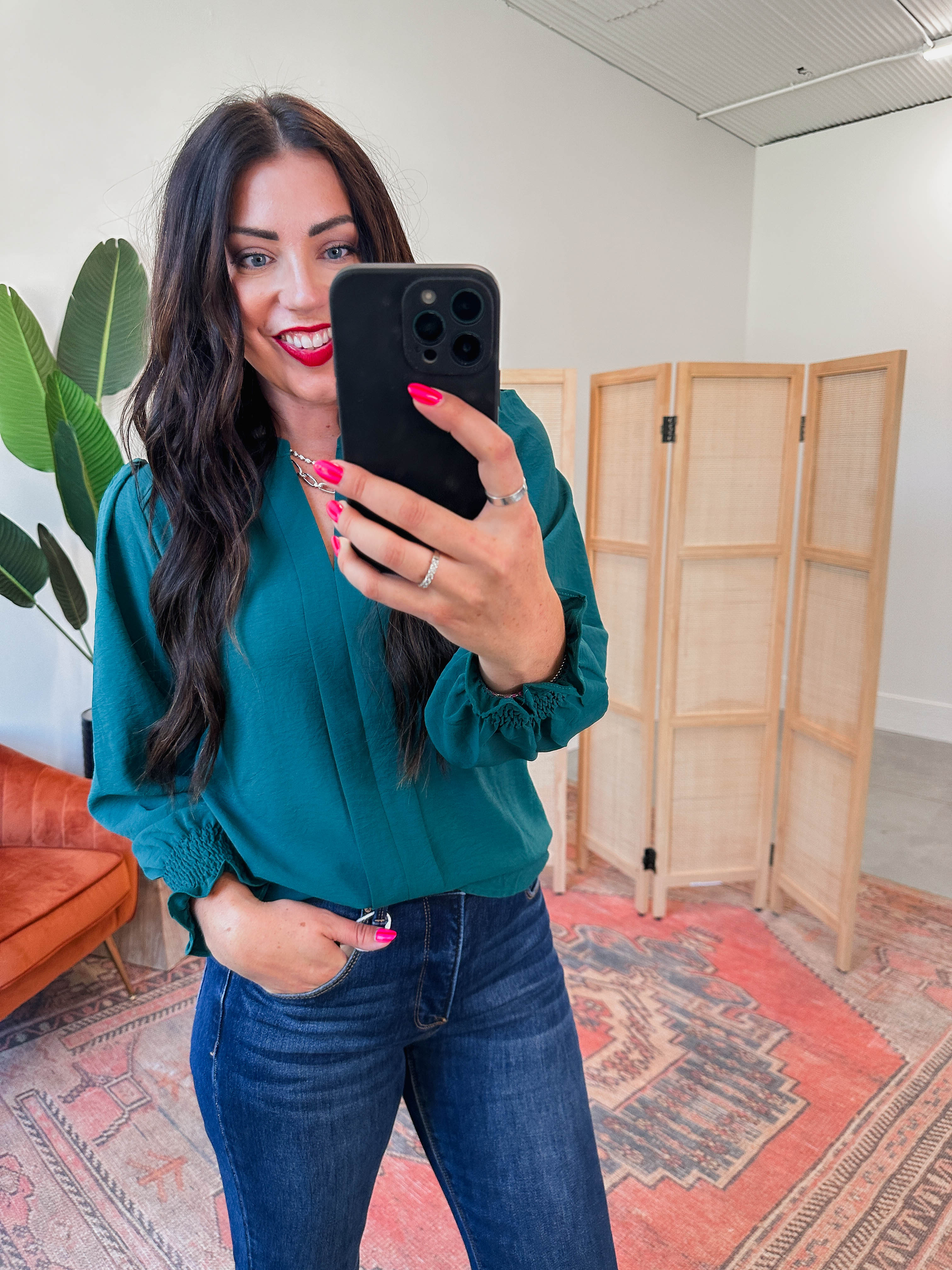 The Jaycee Top adds a fun pop of color to any outfit with its split neck and front pleat detail. Long sleeves with smocked cuffs lend a playful touch, while the curved hem makes it perfect for work to weekend transitions.