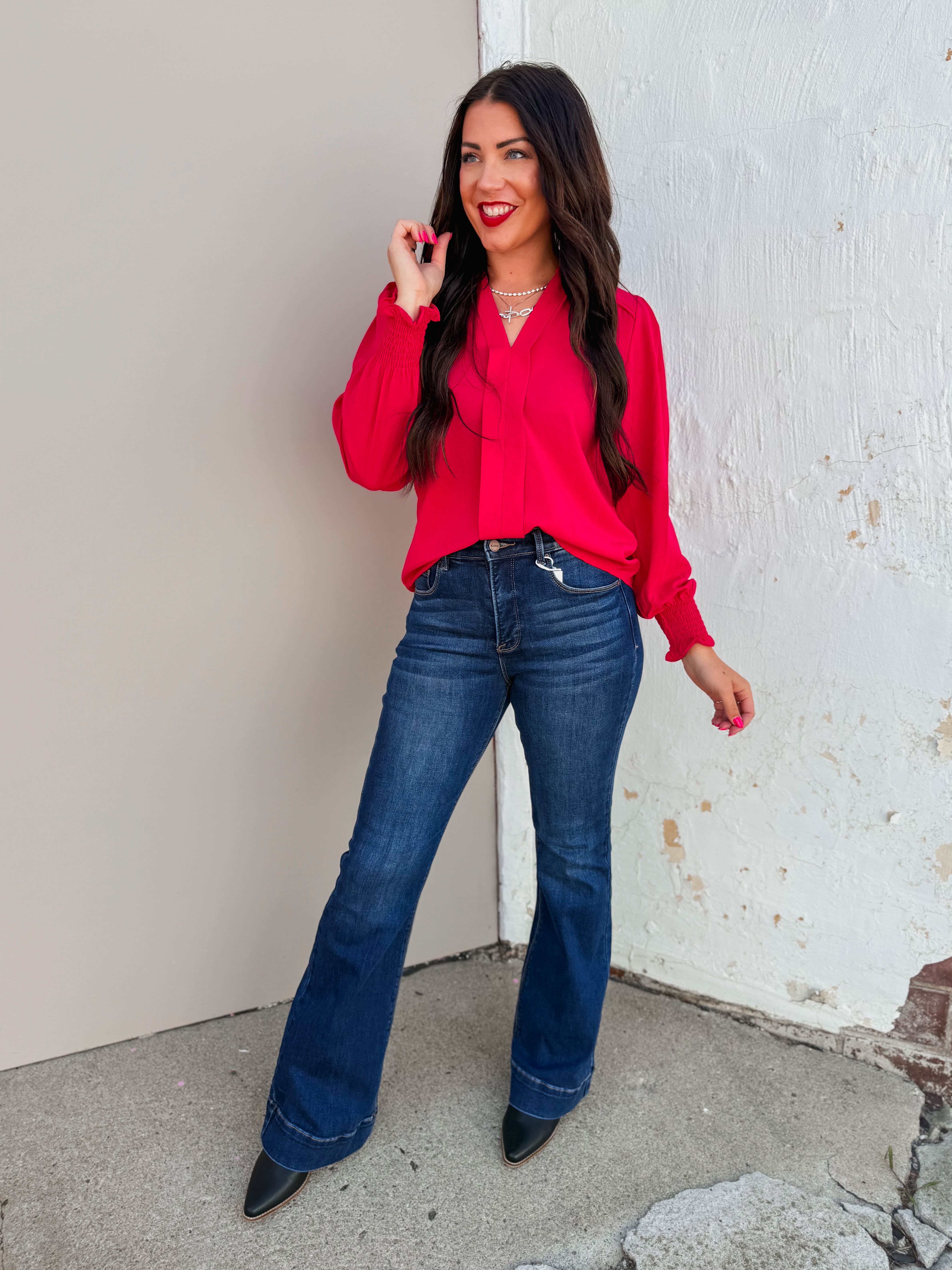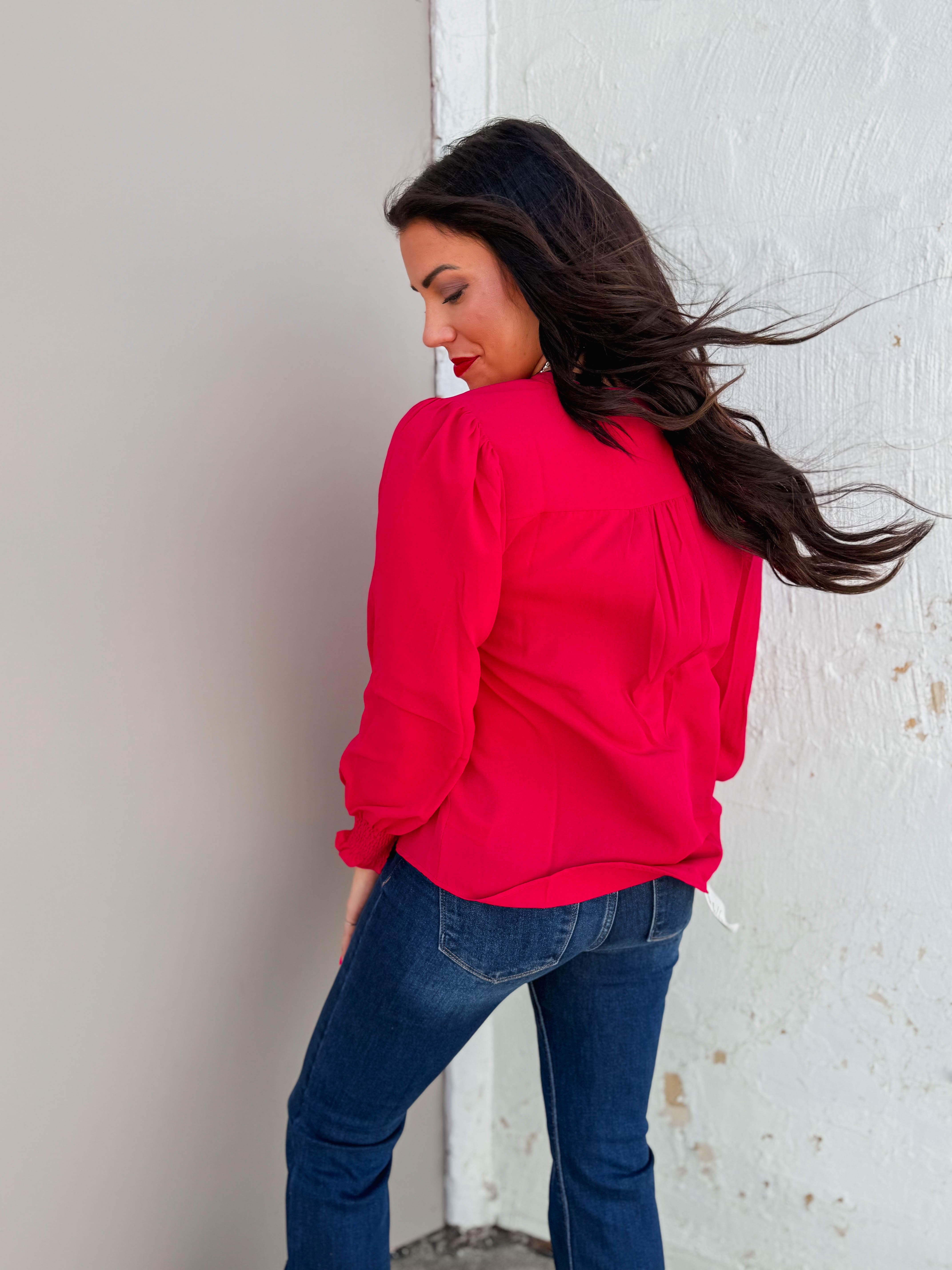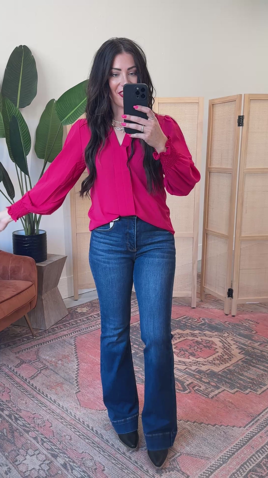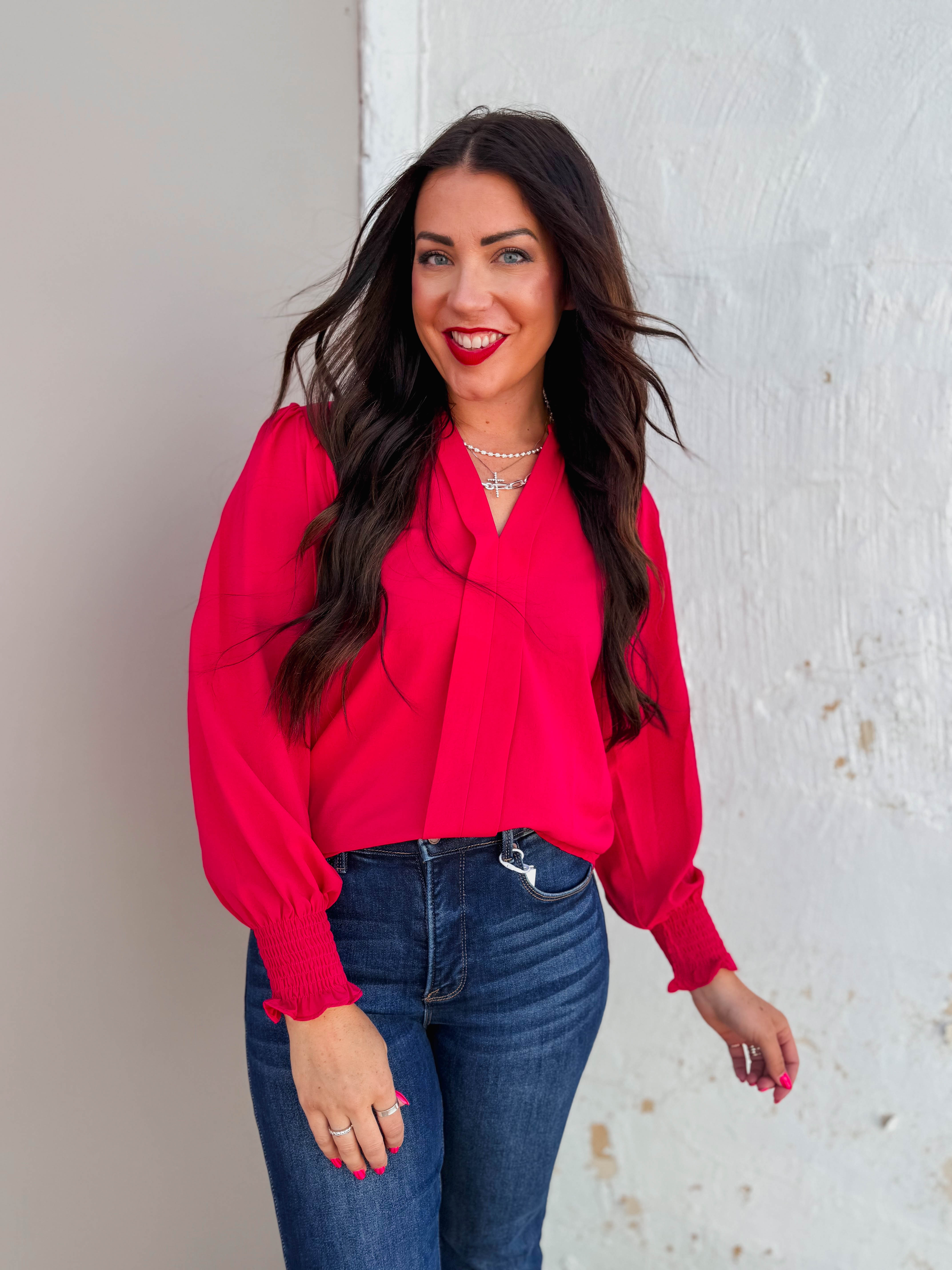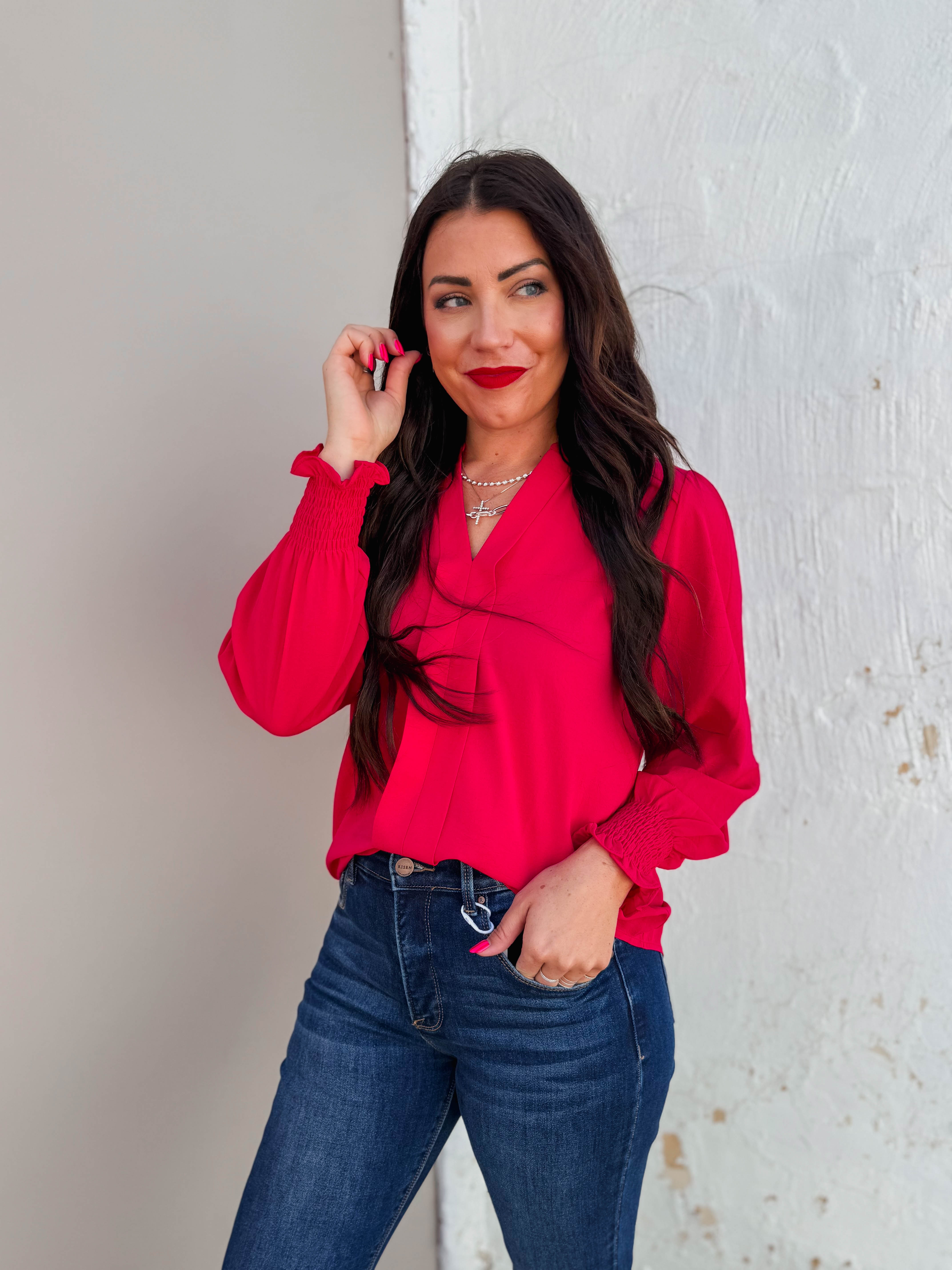 The Jaycee Top adds a fun pop of color to any outfit with its split neck and front pleat detail. Long sleeves with smocked cuffs lend a playful touch, while the curved hem makes it perfect for work to weekend transitions.