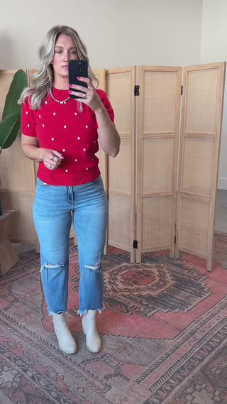 The Kali Polka Dot Knit Top features a playful polka dot embroidery, round neck, and trendy short puff sleeves. Perfect for work or weekend, it adds a fun, stylish touch to any outfit.