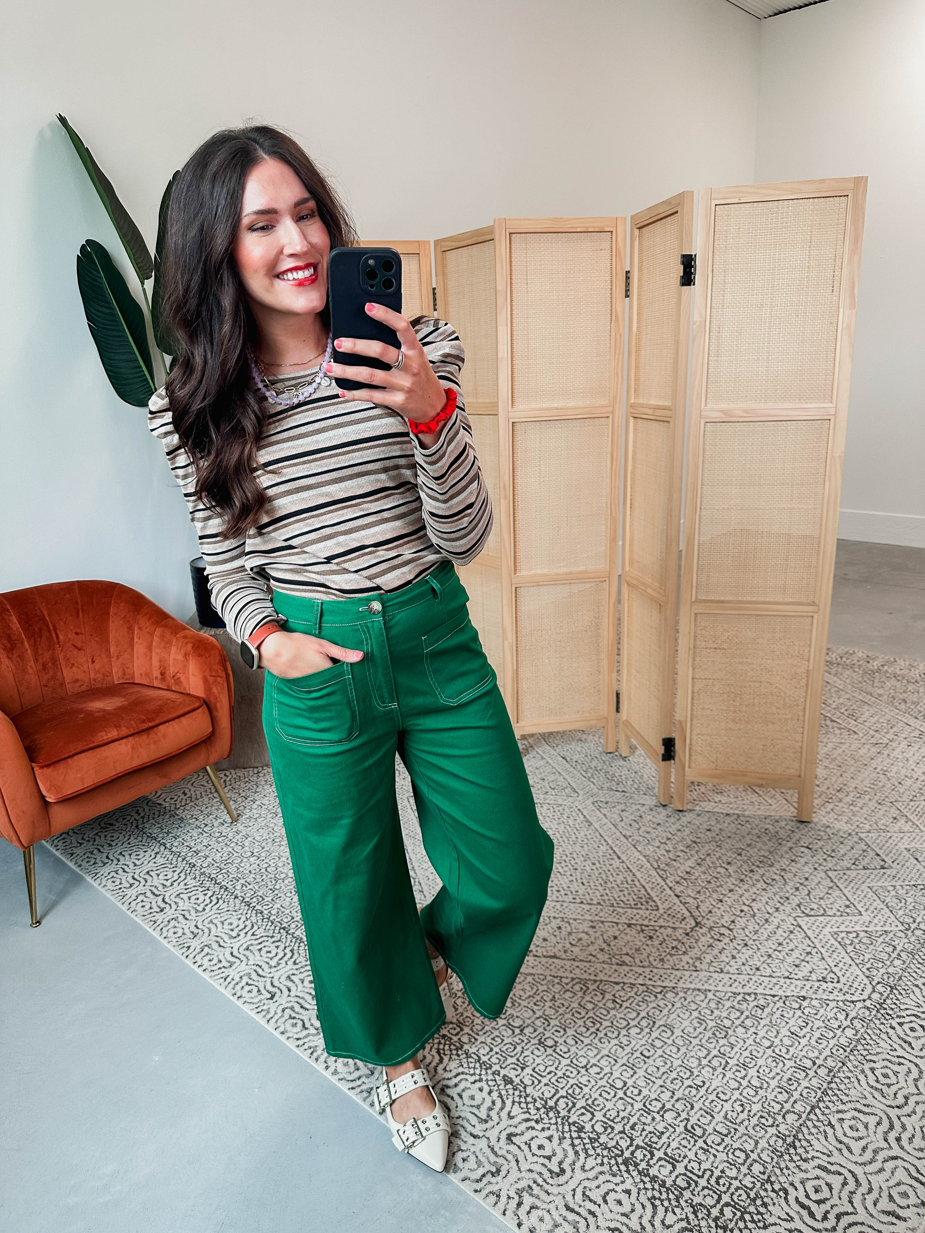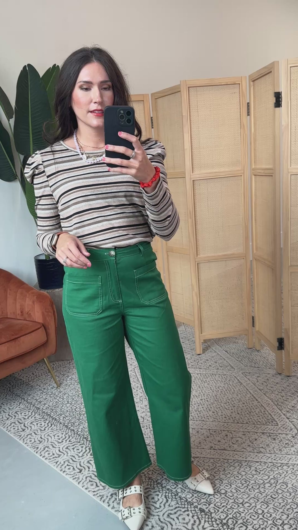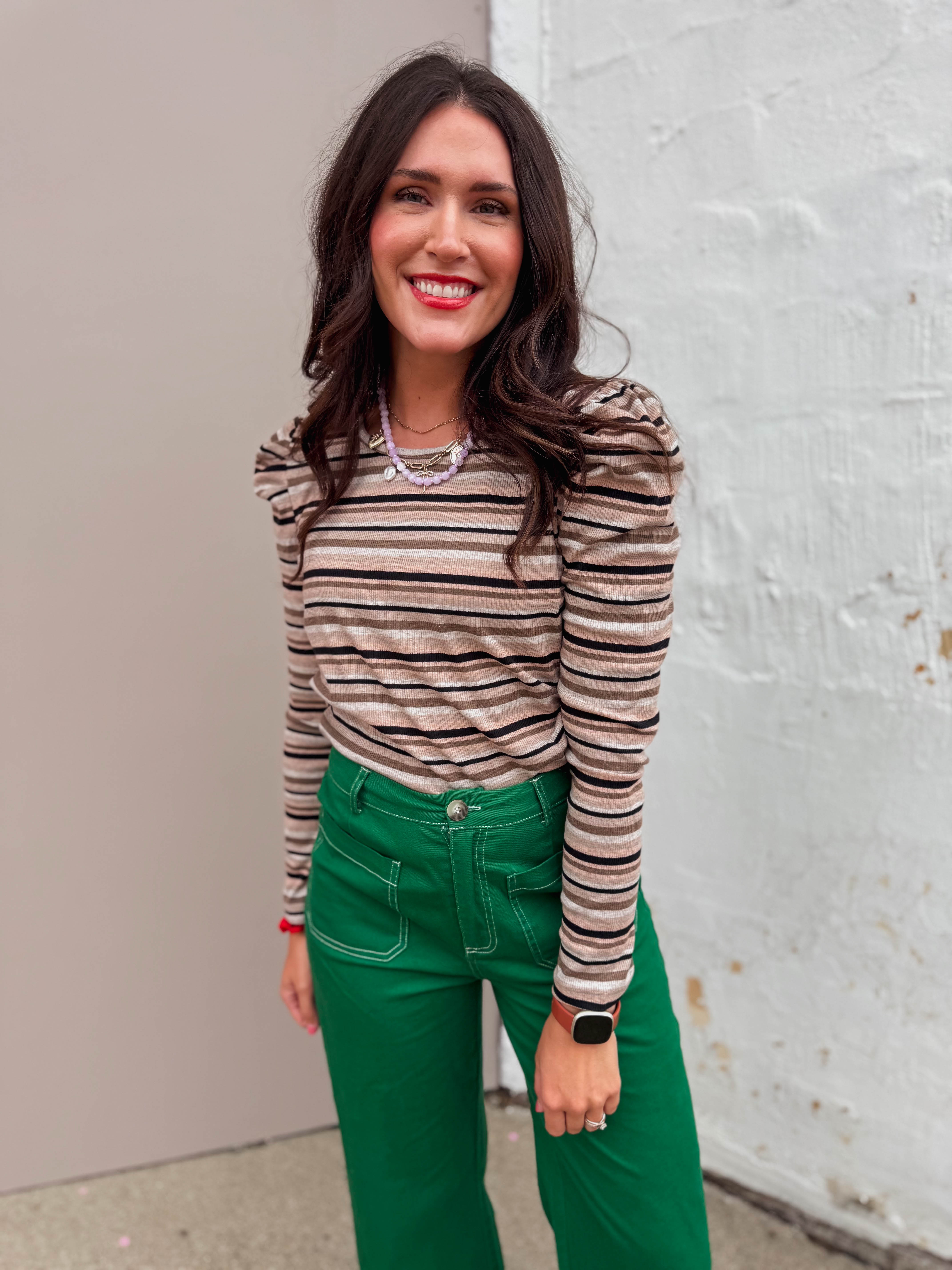 This Evelyn Striped Top in mocha and black features a ribbed texture, crew neckline, and playful puff long sleeves. Its multicolor stripes add a fun twist, making it perfect for work or weekend vibes. Great for layering and easy to style!