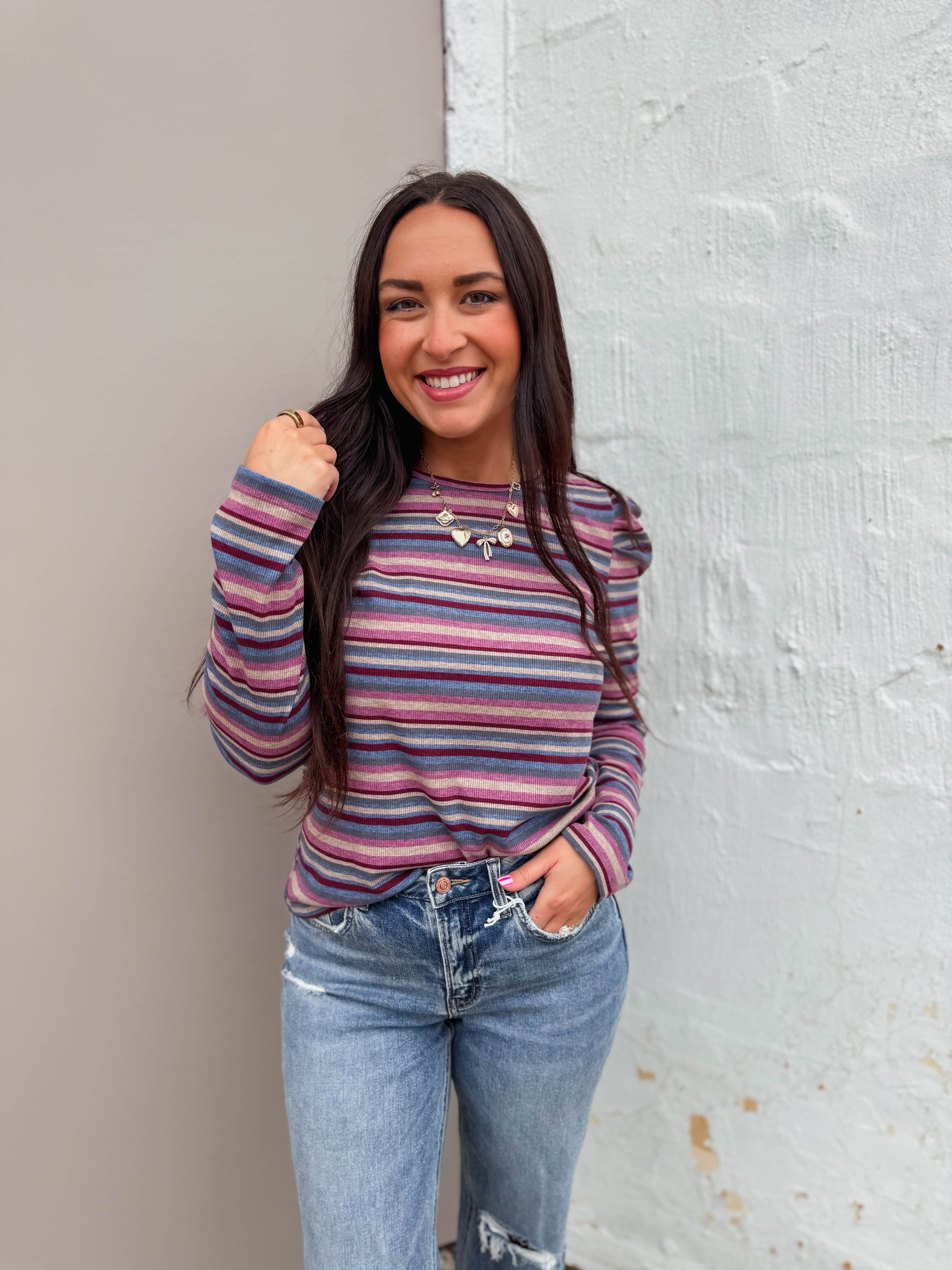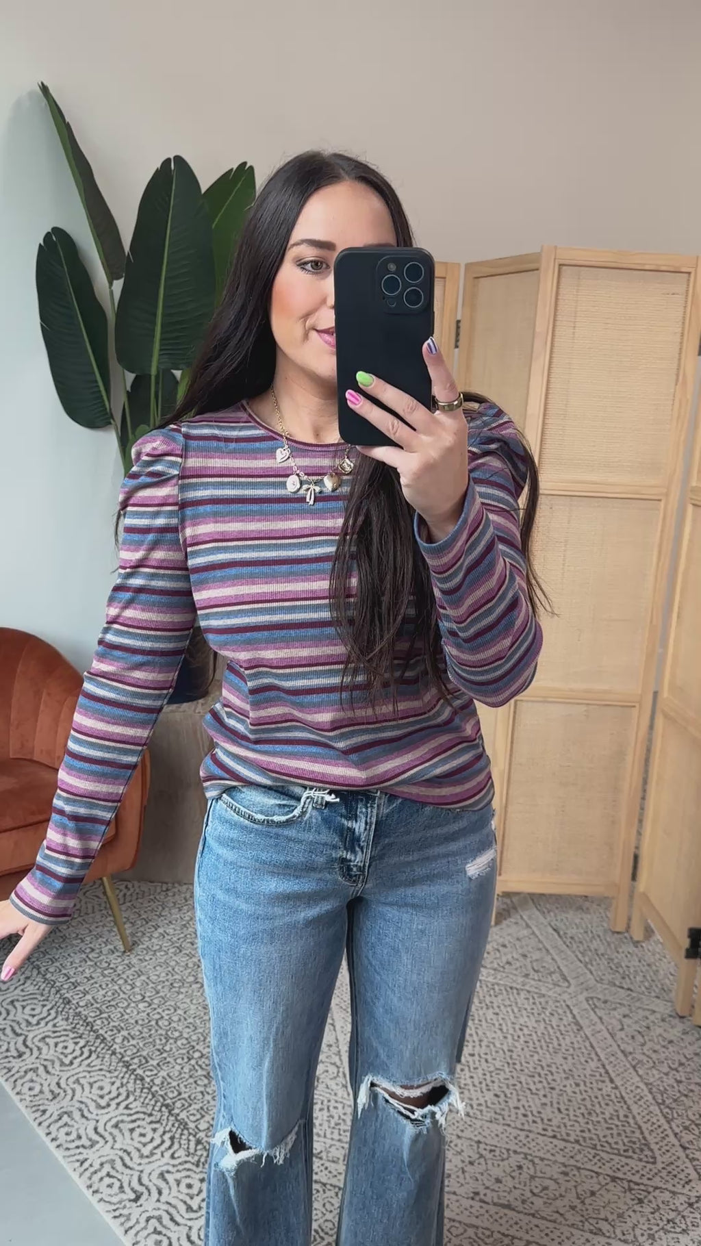 This Evelyn Striped Top in mocha and purple features a ribbed texture, crew neckline, and playful puff long sleeves. Its multicolor stripes add a fun twist, making it perfect for work or weekend vibes. Great for layering and easy to style!