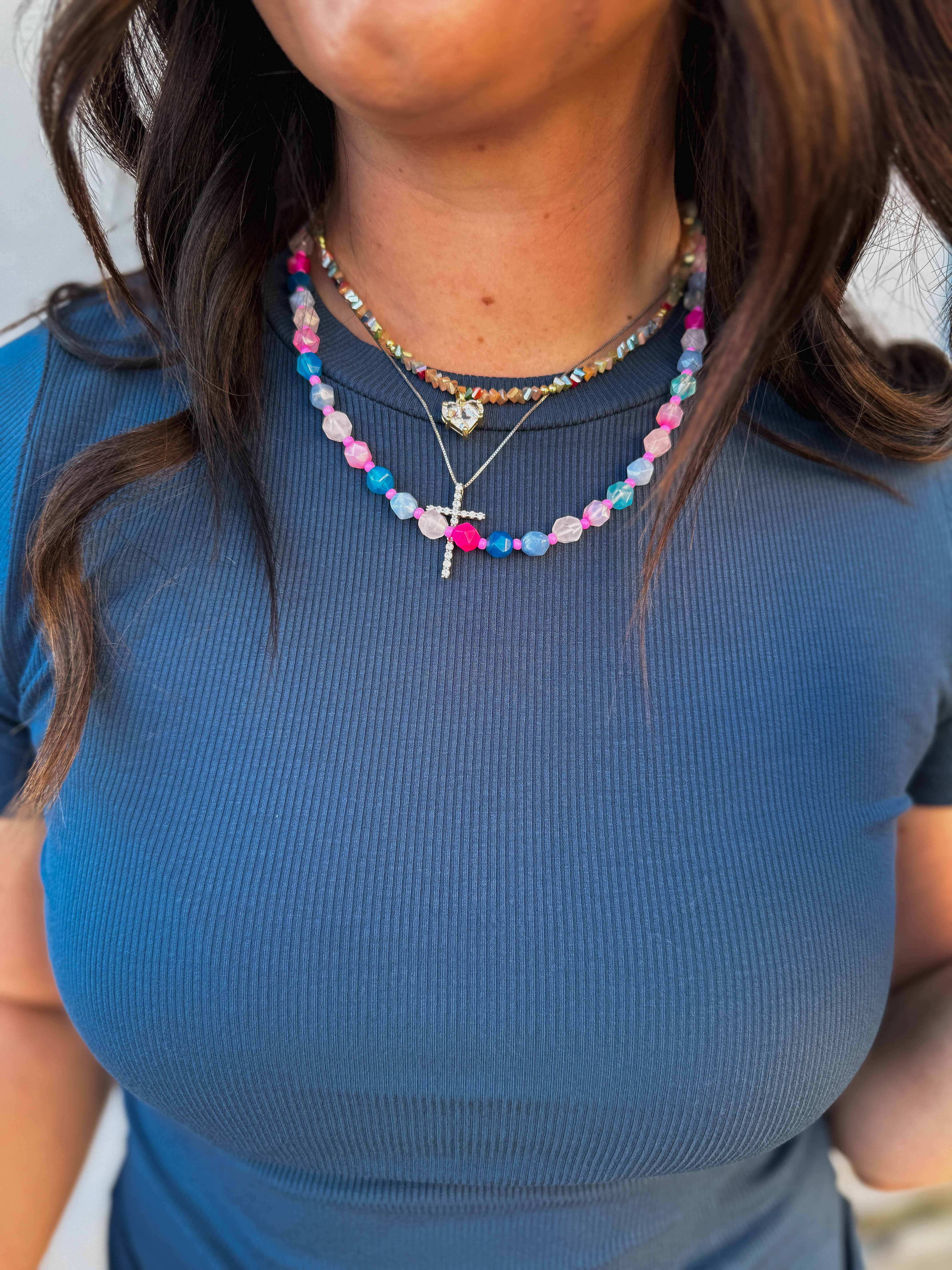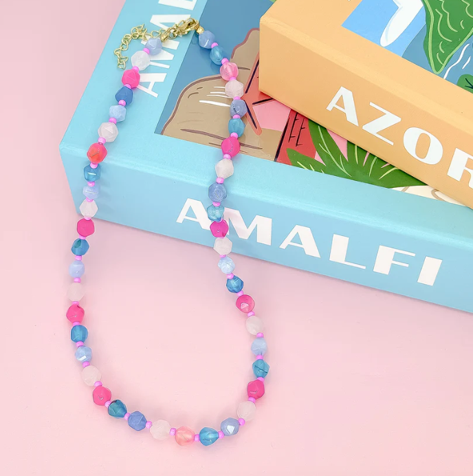 Inspired by pastel skies and dreamy daydreams, the Sugar Sky Necklace blends soft pinks, sky blues, and creamy whites into a playful yet serene design. The faceted beads shimmer like sunlight through cotton-candy clouds, making it the perfect accessory for adding a touch of whimsy and wonder to any outfit. Length is 18" + 3" Extender