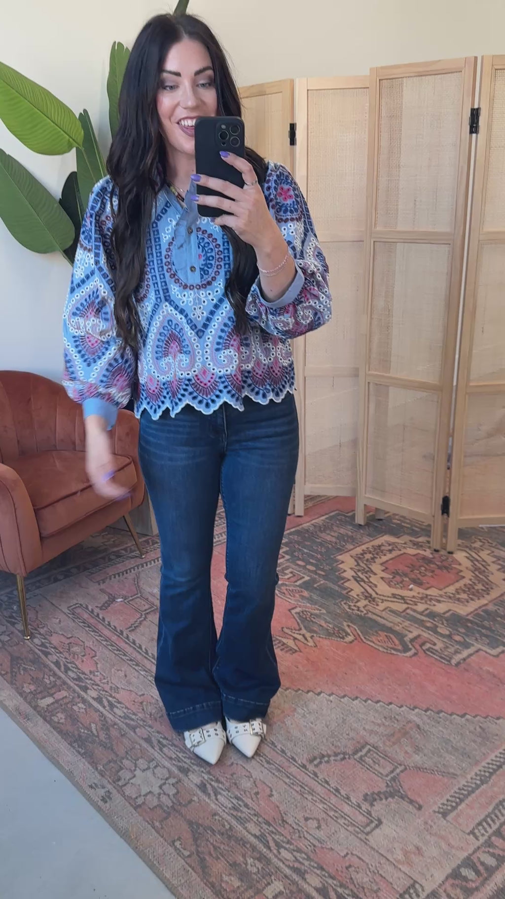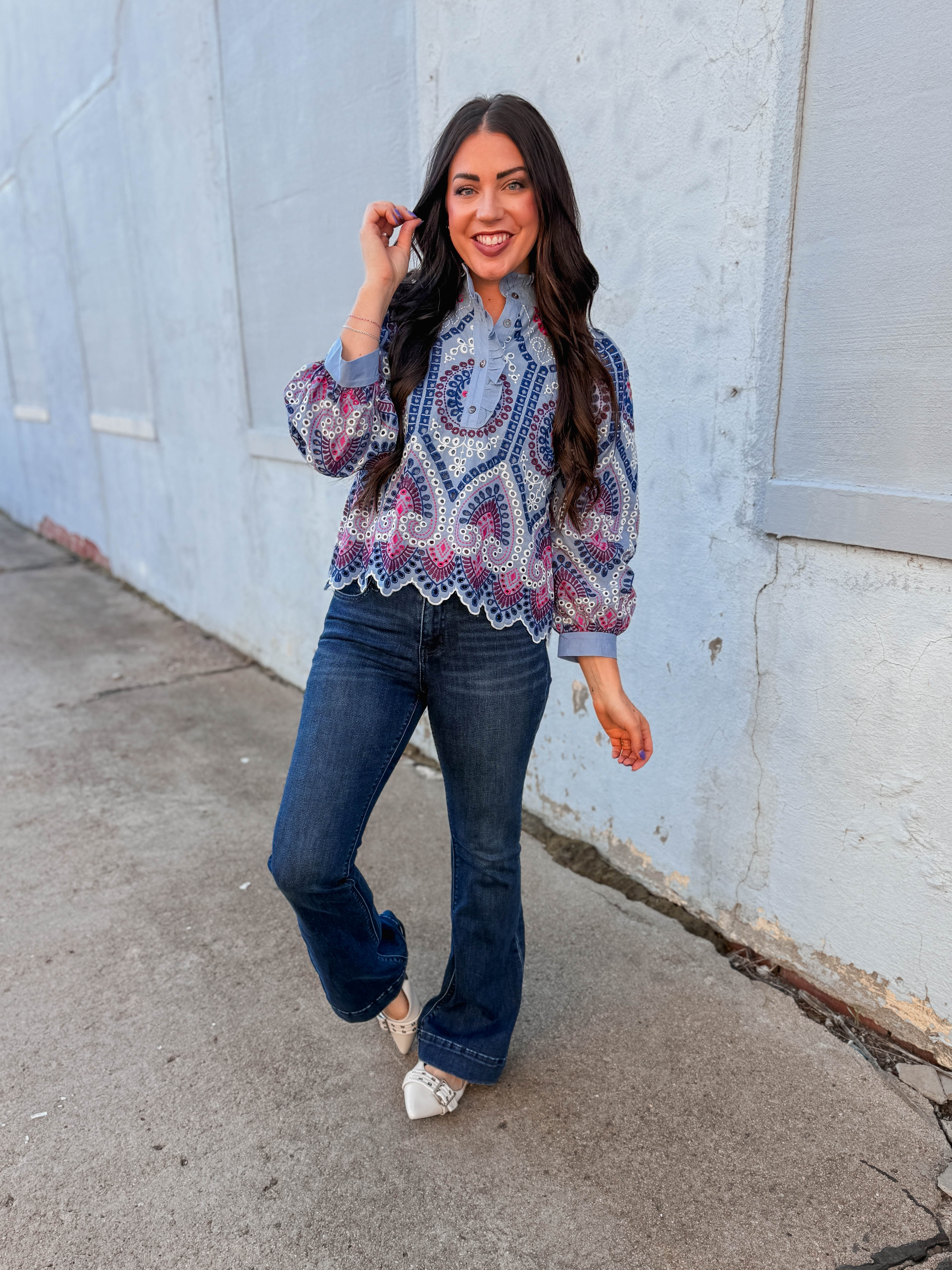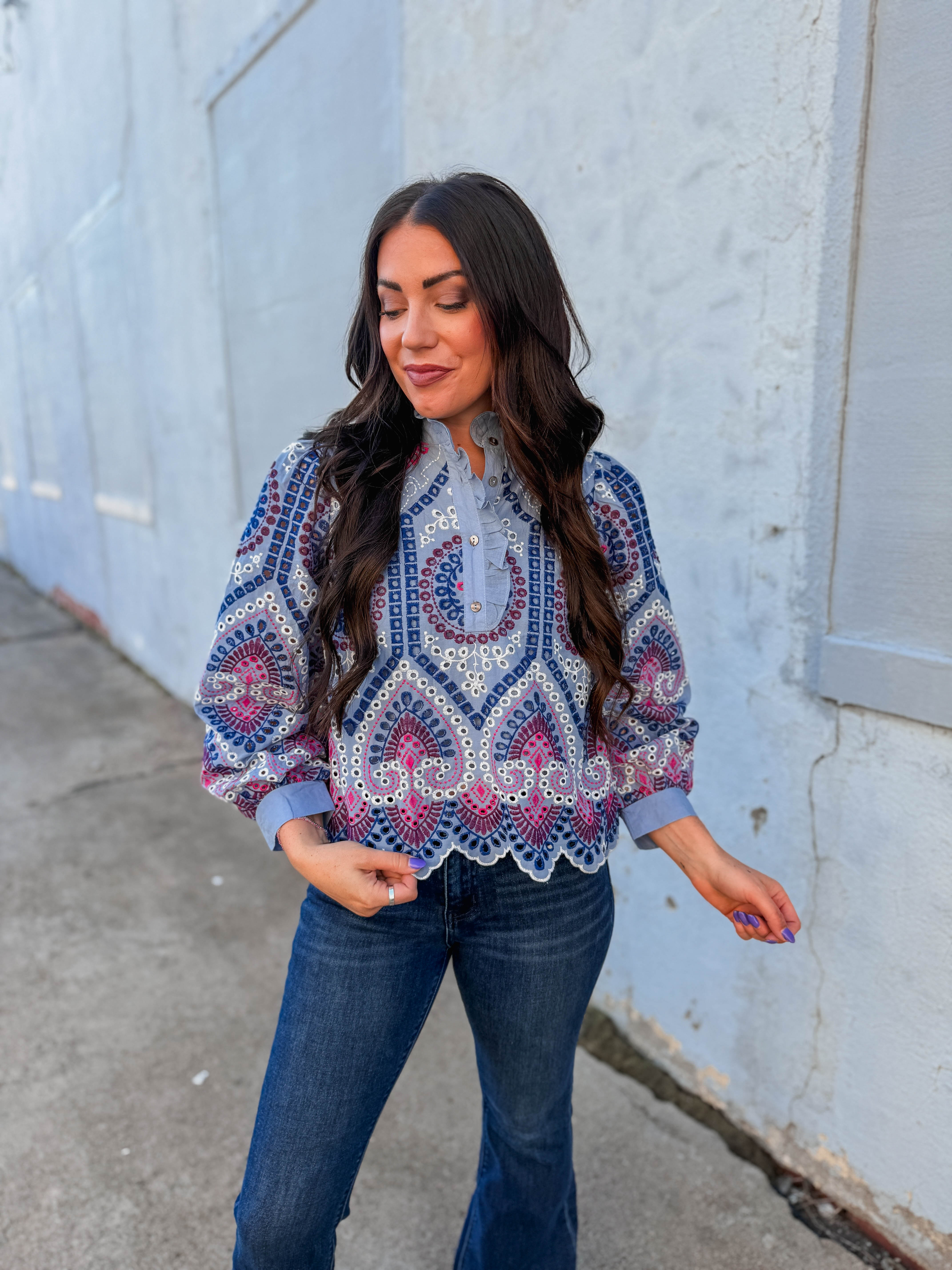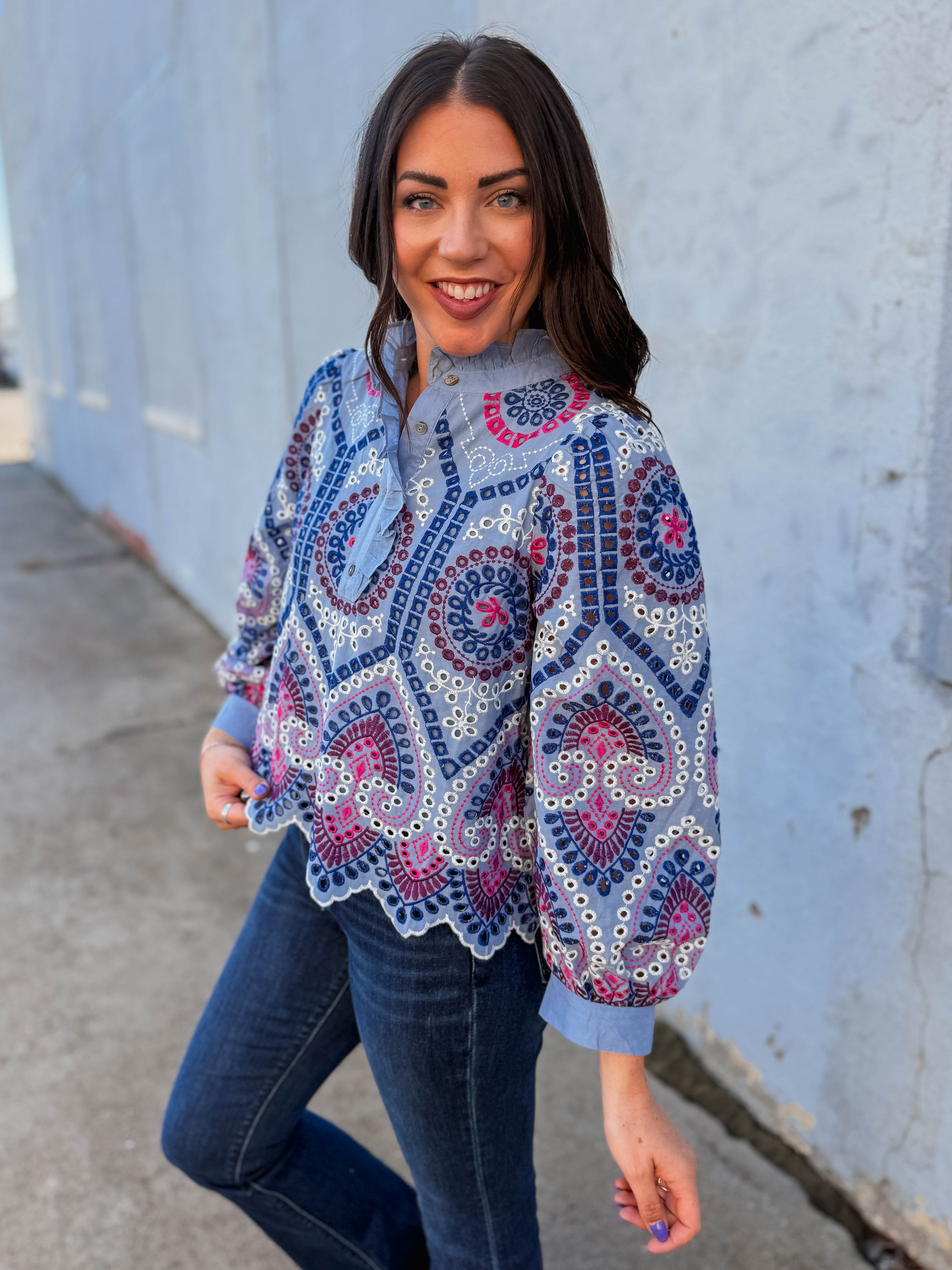 Add a fun pop of color to your wardrobe with the Adeline Embroidered Top. Featuring a split neckline, embroidered eyelet design, and playful 3/4 puff sleeves with ruffle accents, it’s perfect for work to weekend wear. The button front closure and scallop hem add charming details that make this blouse a standout choice.