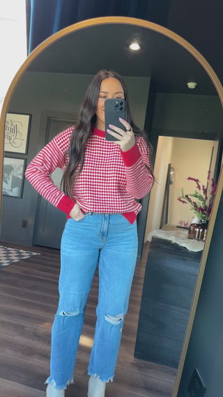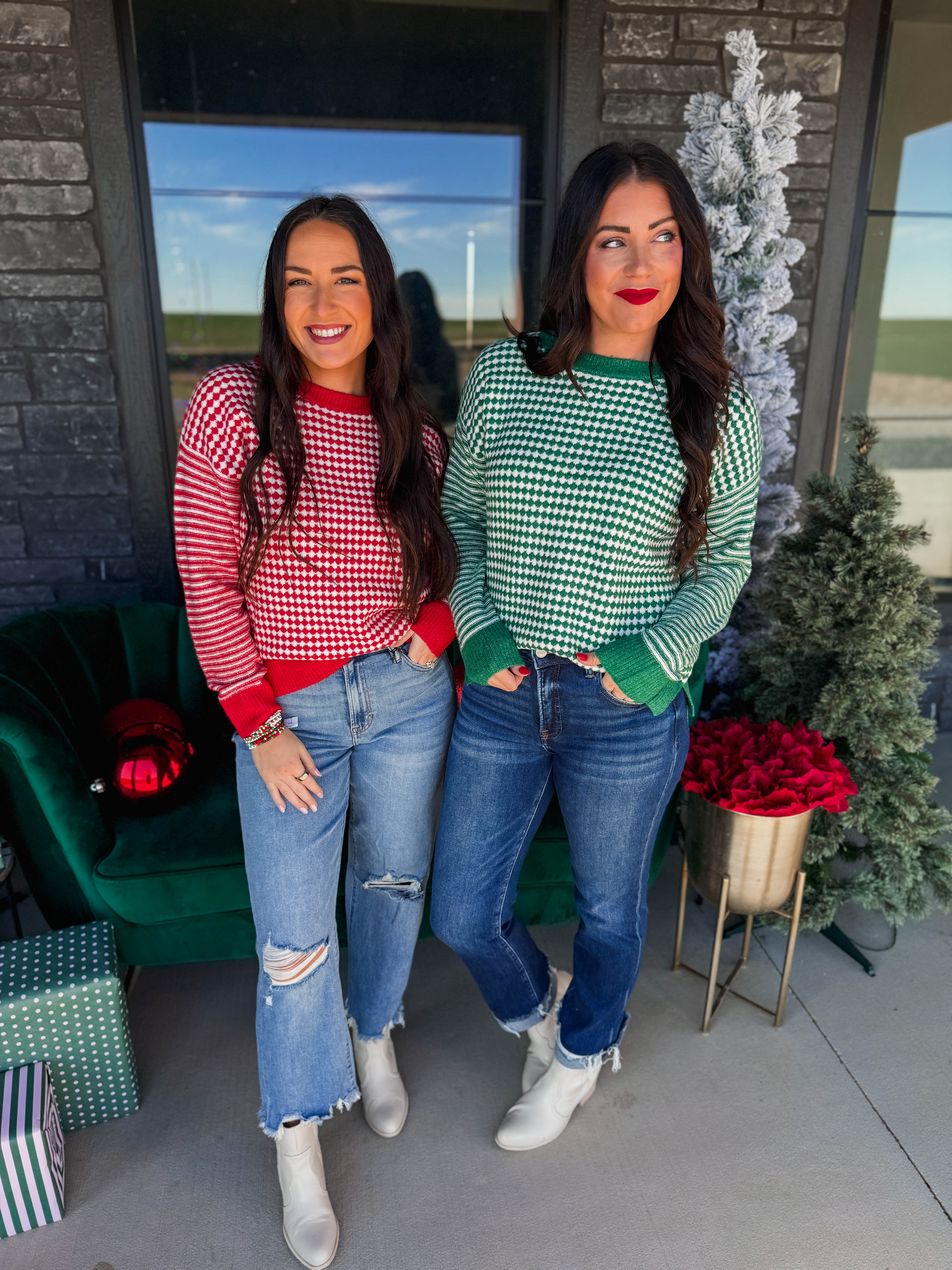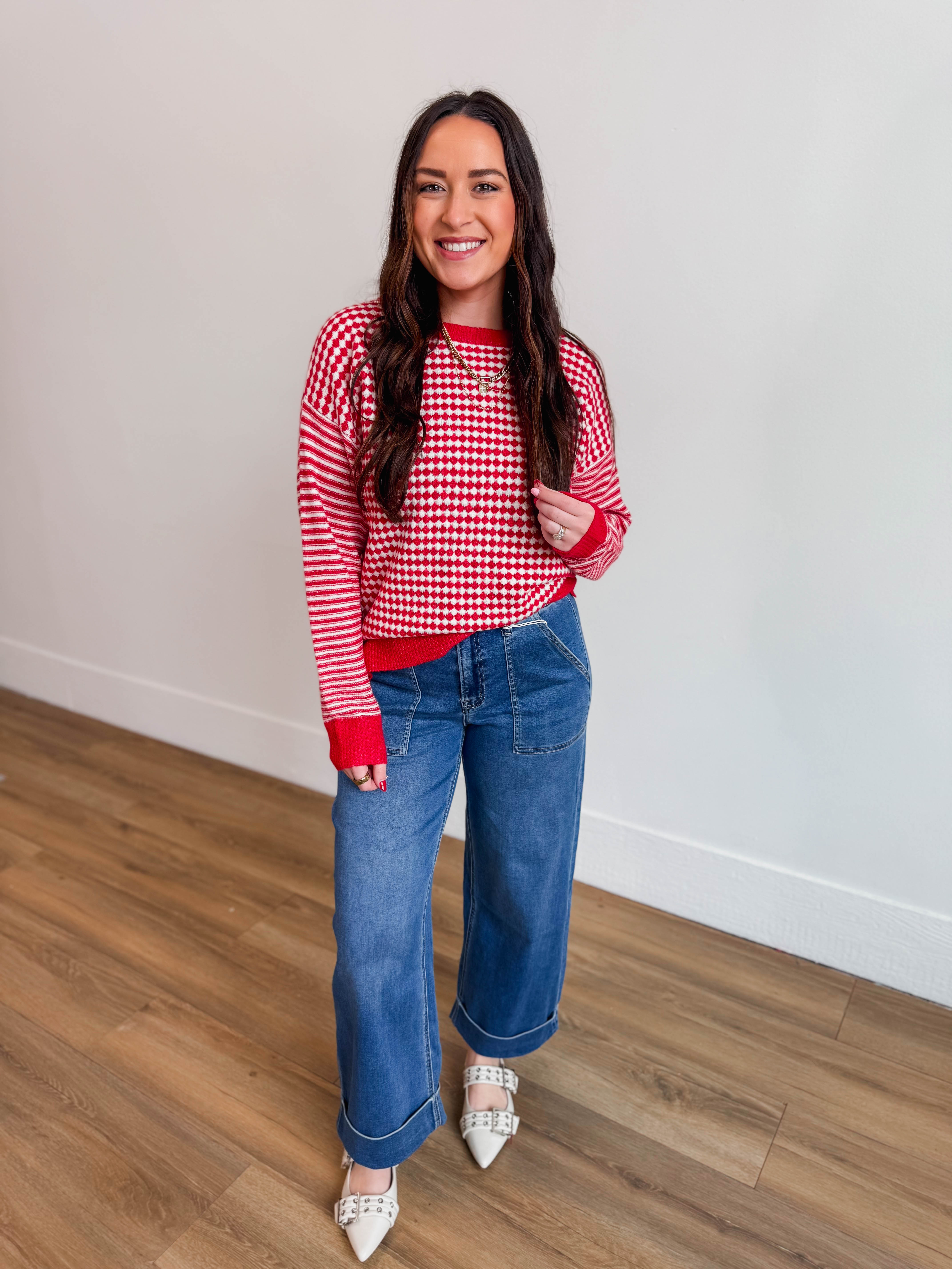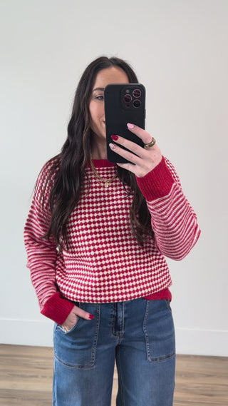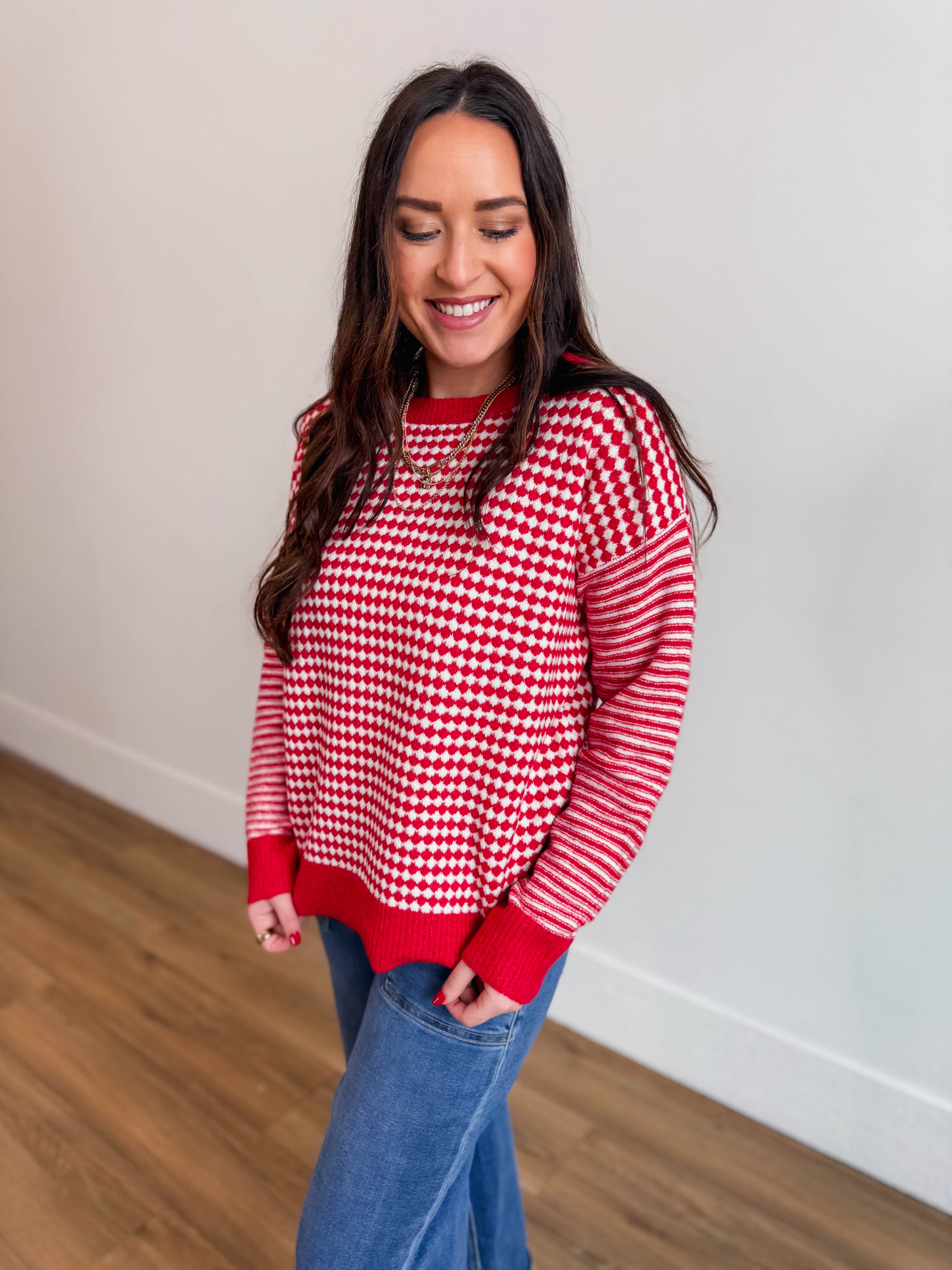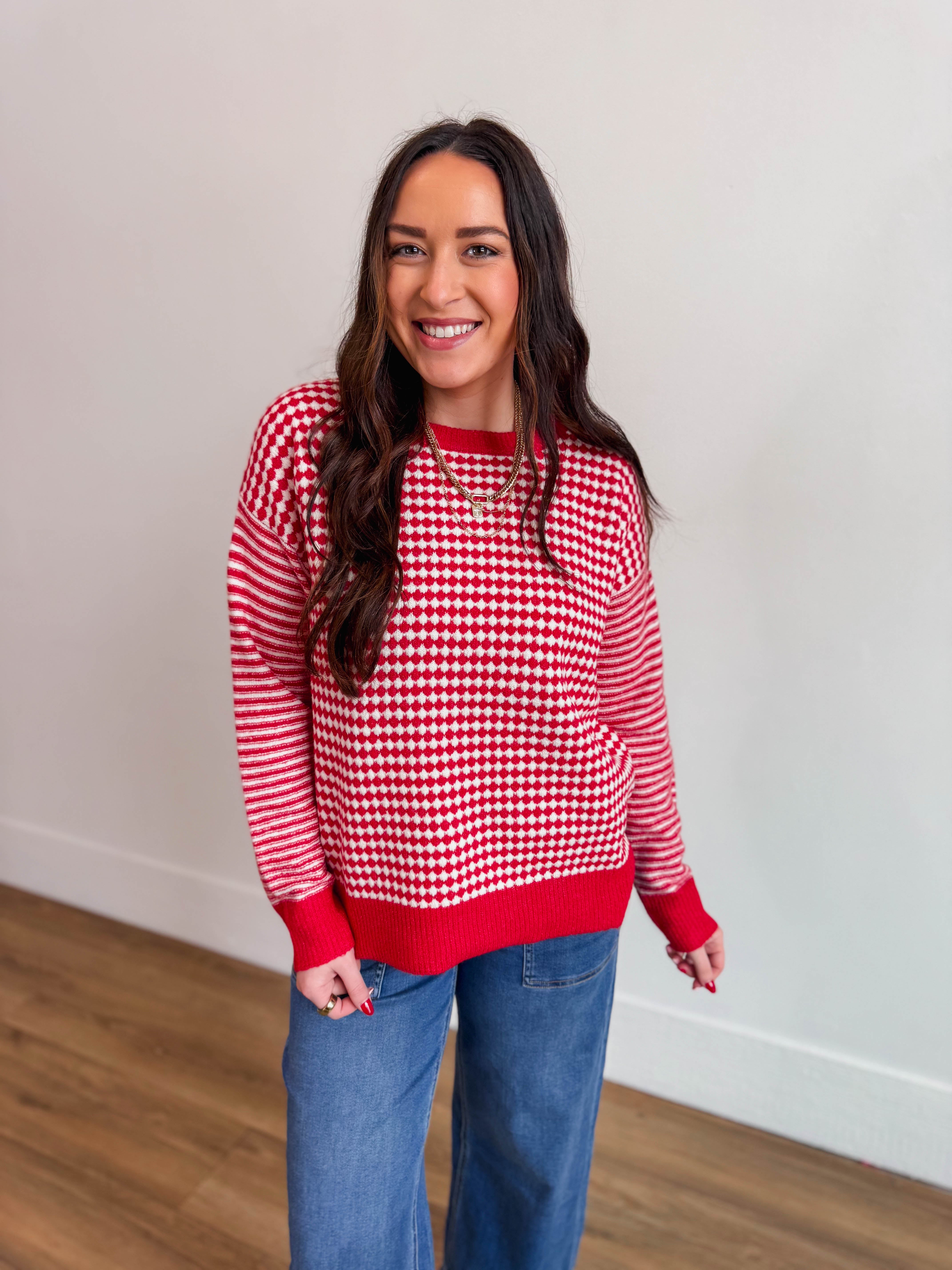 The Caden Sweater is your new go-to for effortless style from work to weekend. Featuring a cozy crew neckline, fun long stripe sleeves, and a trendy checkerboard pattern, it’s playful yet polished. Perfect for layering or wearing solo, it makes every day a little brighter.