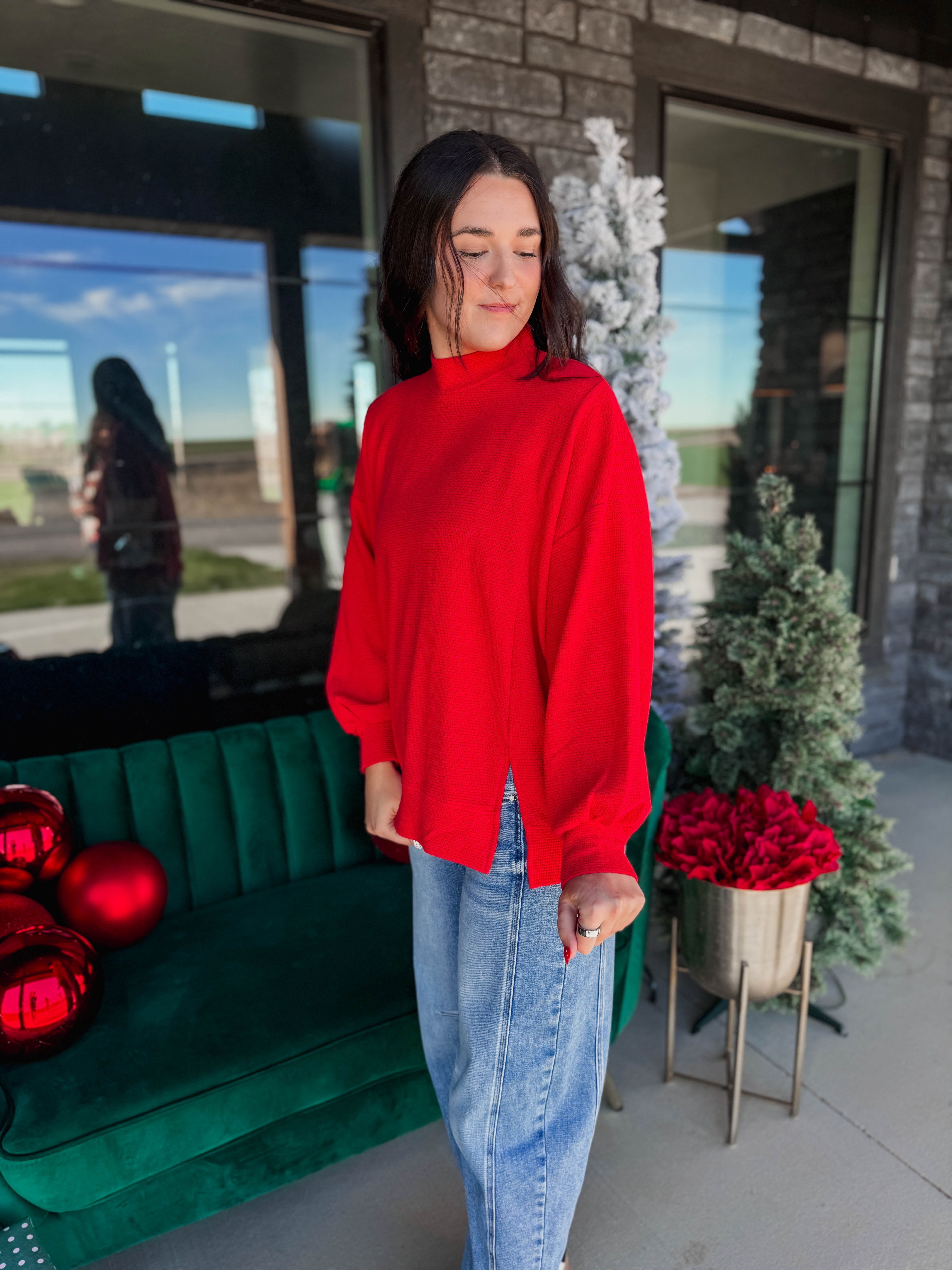 The Elsie Mock Neck Top blends cozy textured knit with playful details like front slits and a chic mock neckline. Perfect for long sleeve warmth from workday meetings to weekend fun, it’s a cute and simple staple you’ll love to wear.