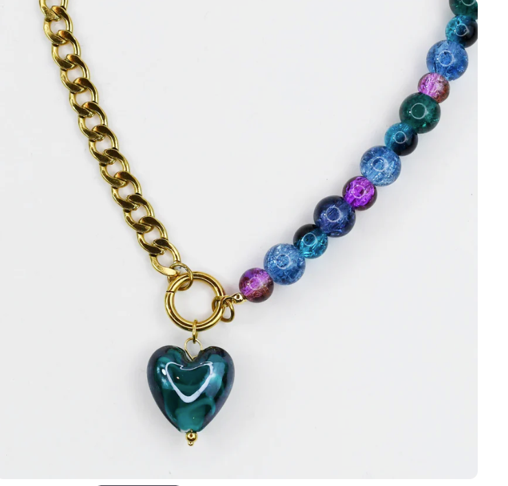 Playfully modern! This necklace pairs one side of vibrant multicolor beads with a bold gold chain, meeting in the center with a glossy teal heart pendant. A perfect mix of sweet and edgy. The statement piece that adds instant charm to any outfit.