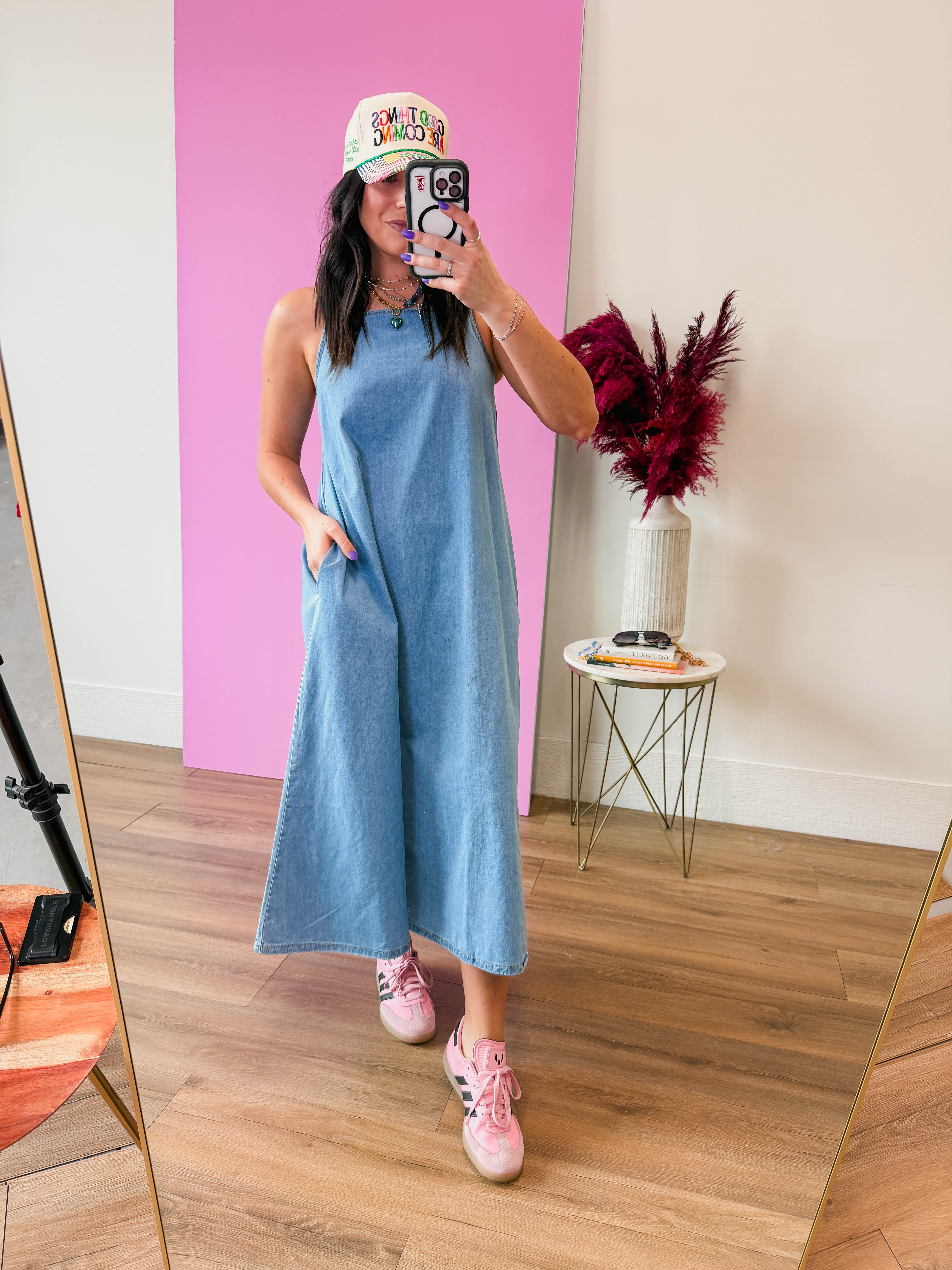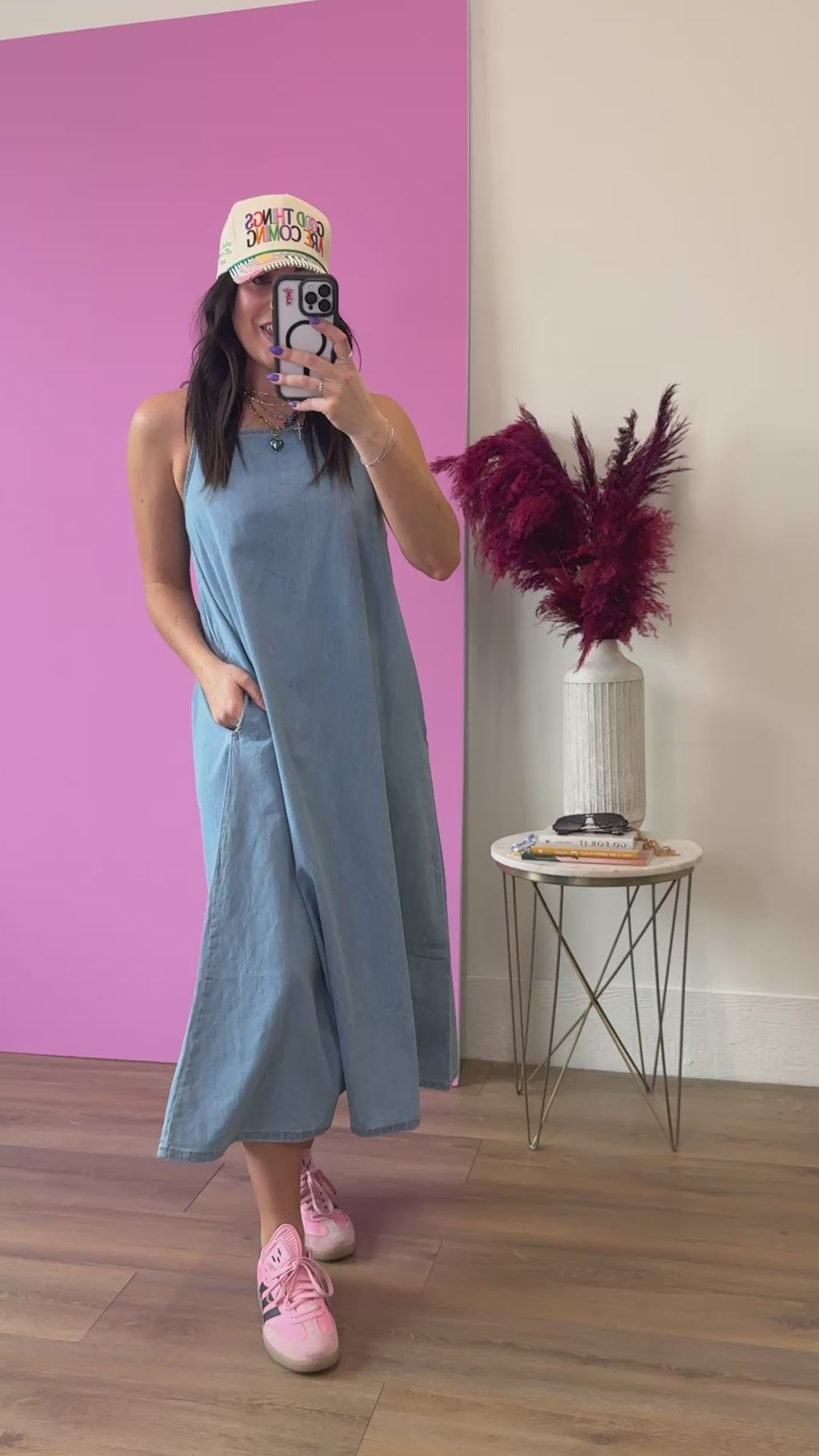 The Jada Denim Maxi Dress is the perfect go to spring and summer dress! It's easy breezy design will keep you comfortable all season long! It layers great under jackets and cardis but you can also rock it solo on those hotter days!