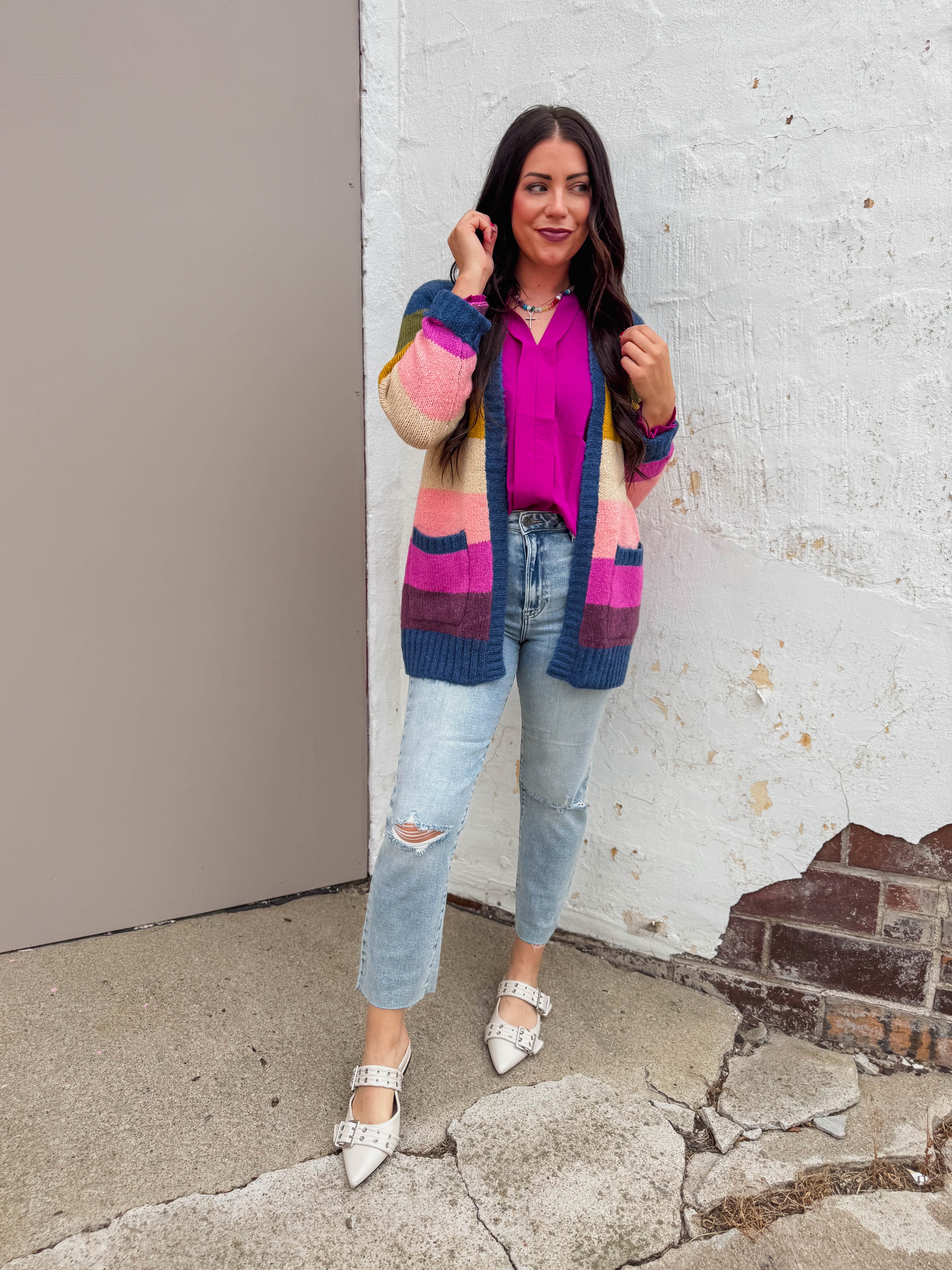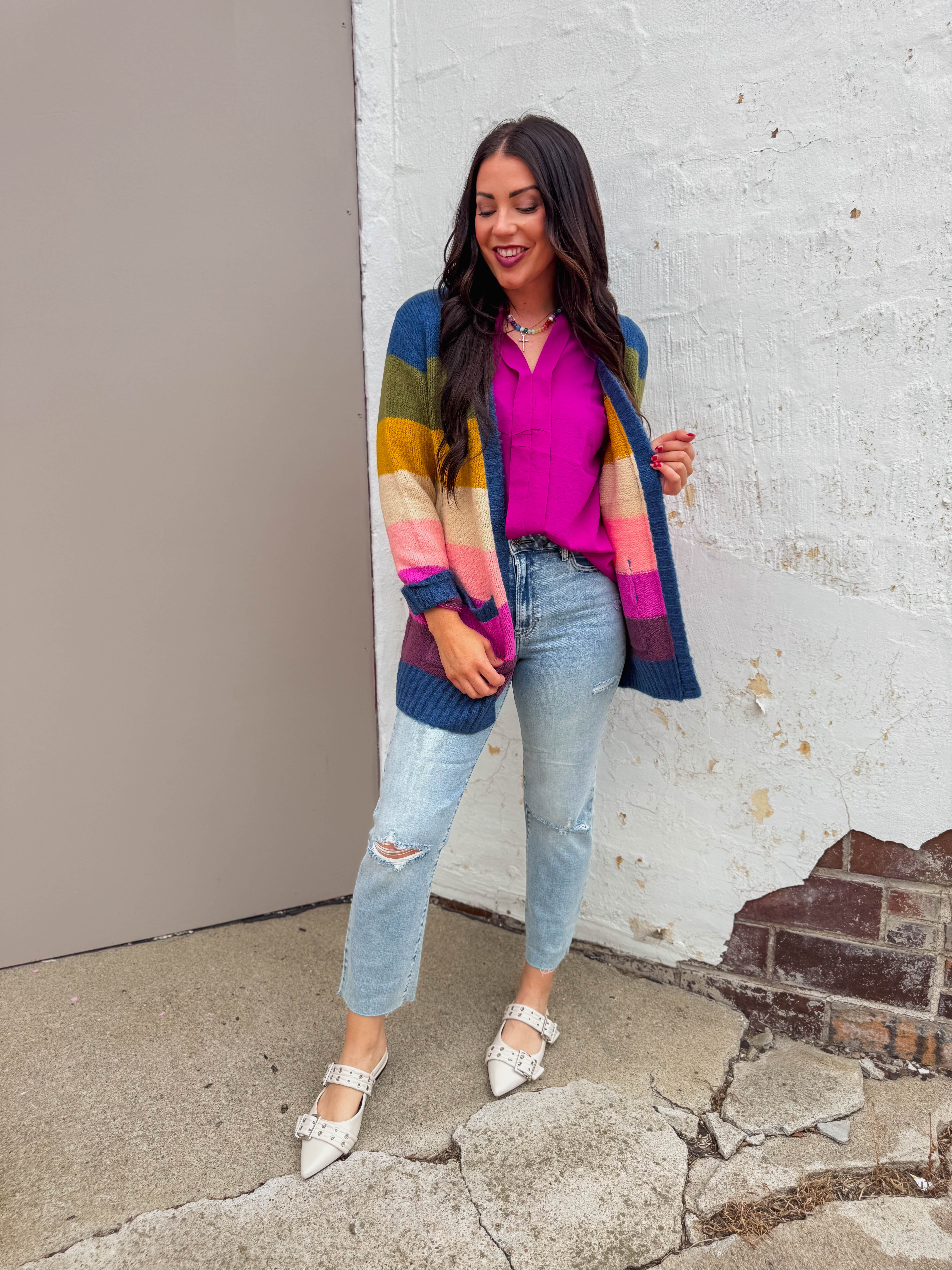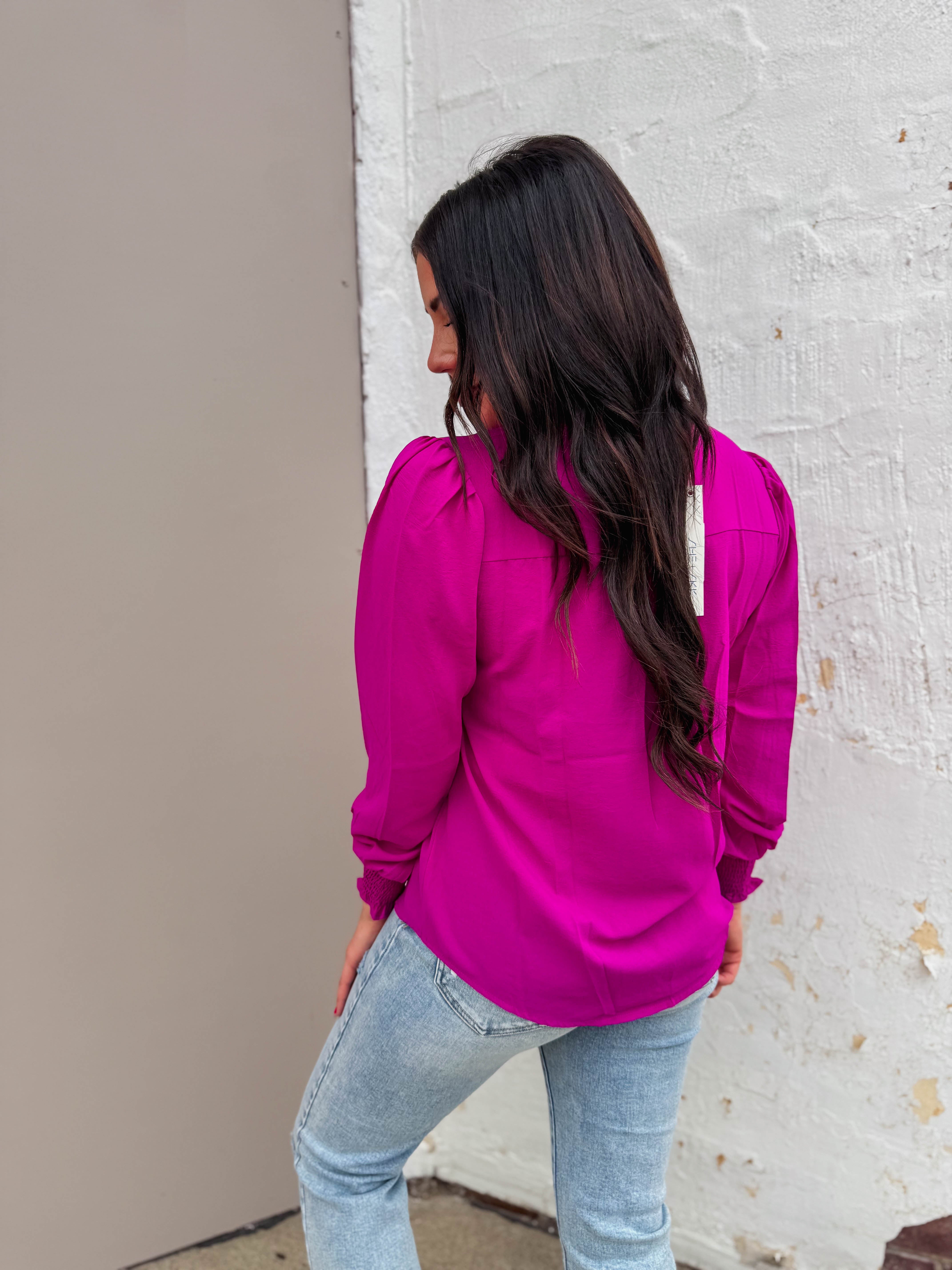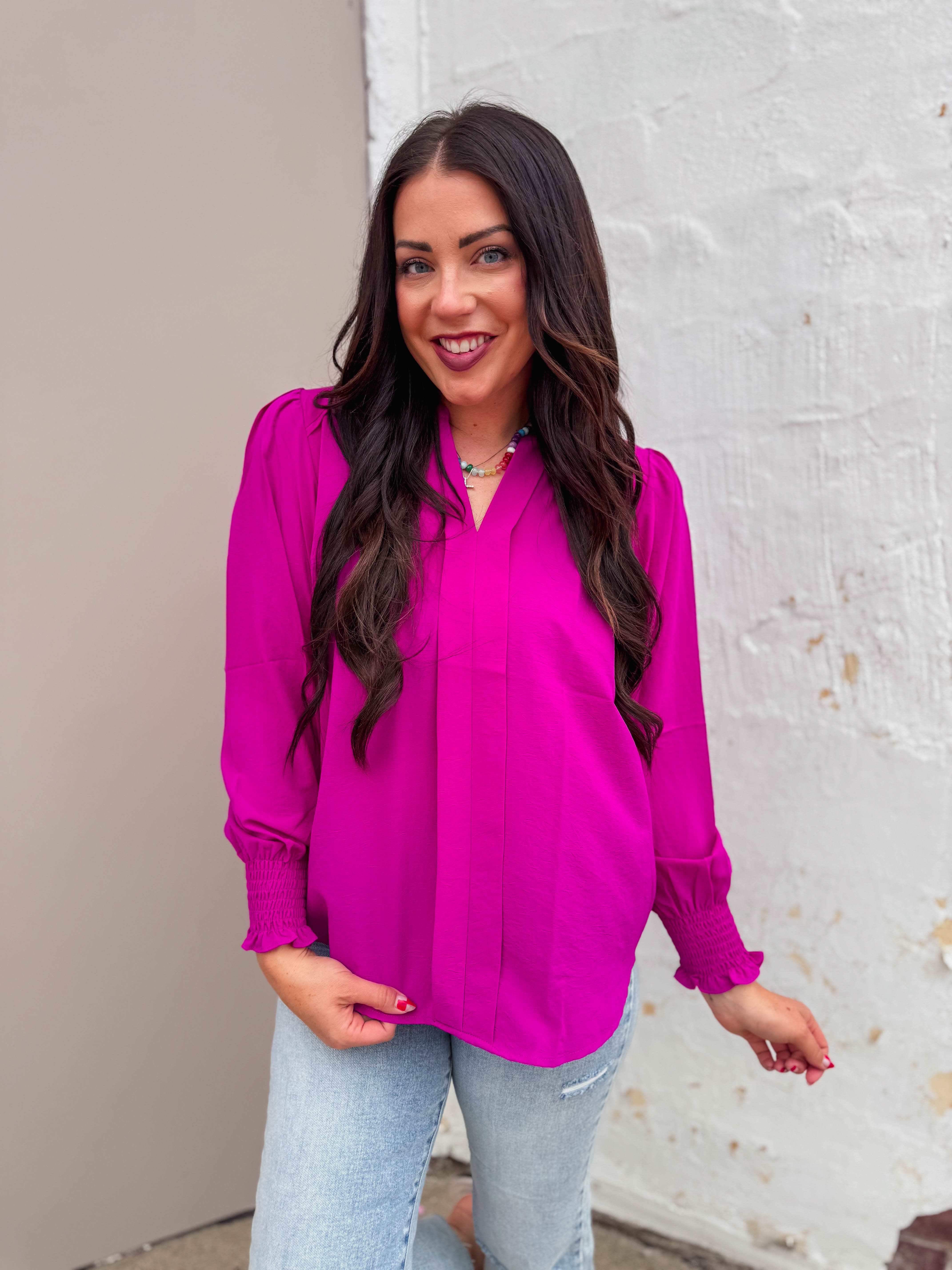 The Jaycee Top adds a fun pop of color to any outfit with its split neck and front pleat detail. Long sleeves with smocked cuffs lend a playful touch, while the curved hem makes it perfect for work to weekend transitions.