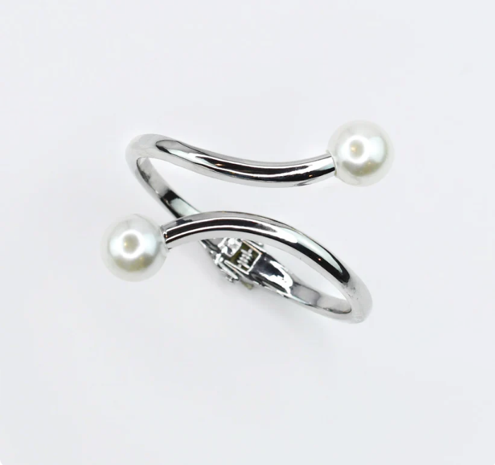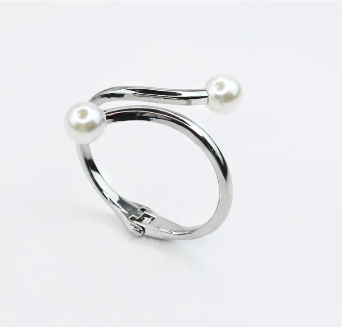 Make a statement with this bracelet, where modern design meets timeless elegance. Available in sleek silver, this sculptural open bangle is crowned with luminous pearls on each end. The perfect piece to elevate both casual and evening looks.