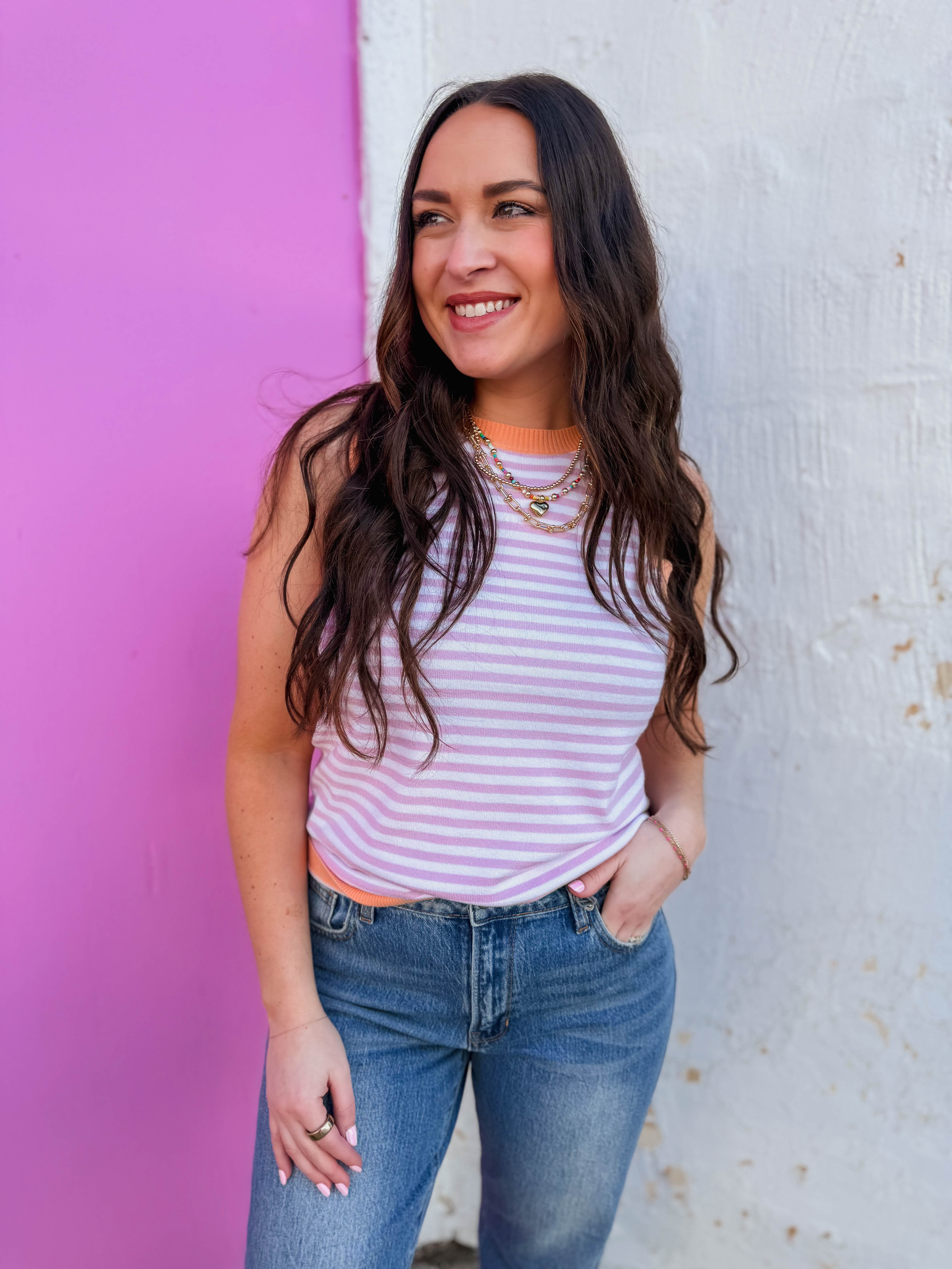 The Lindsey Striped Knit Tank features a classic striped pattern with contrast color trim that adds visual interest. Perfect worn alone on warmer days or layered under your favorite pieces for extra warmth and dimension. This versatile sweater tank transitions seamlessly from season to season, making it a wardrobe essential.